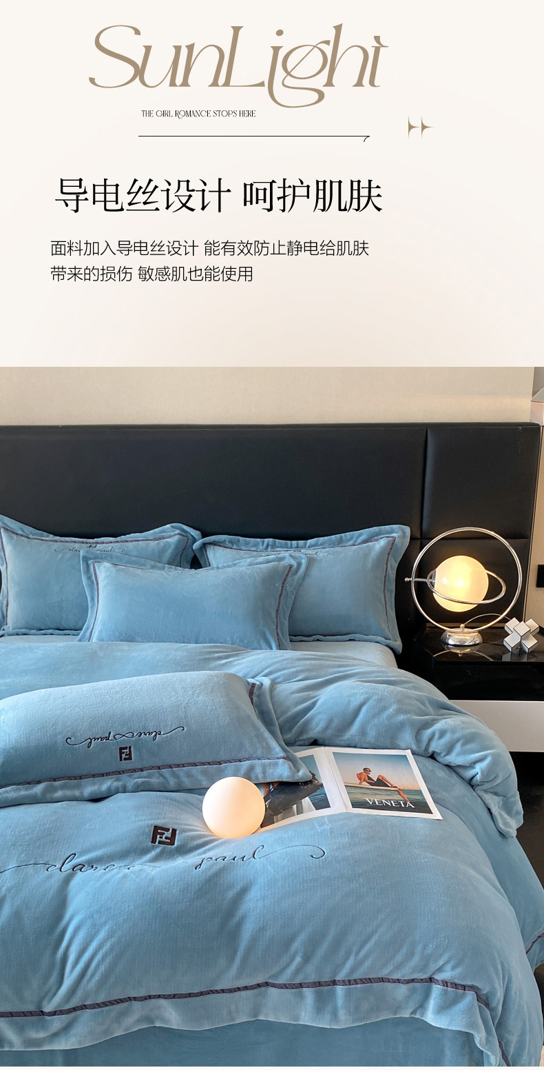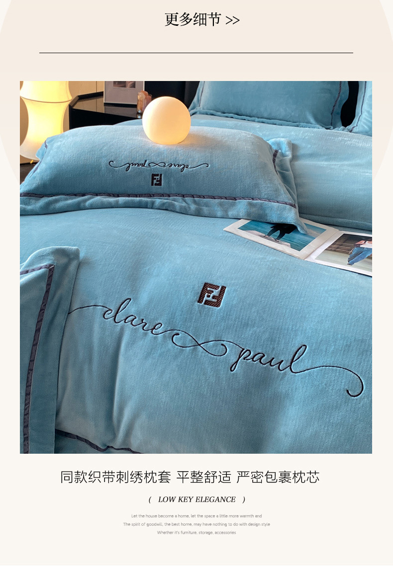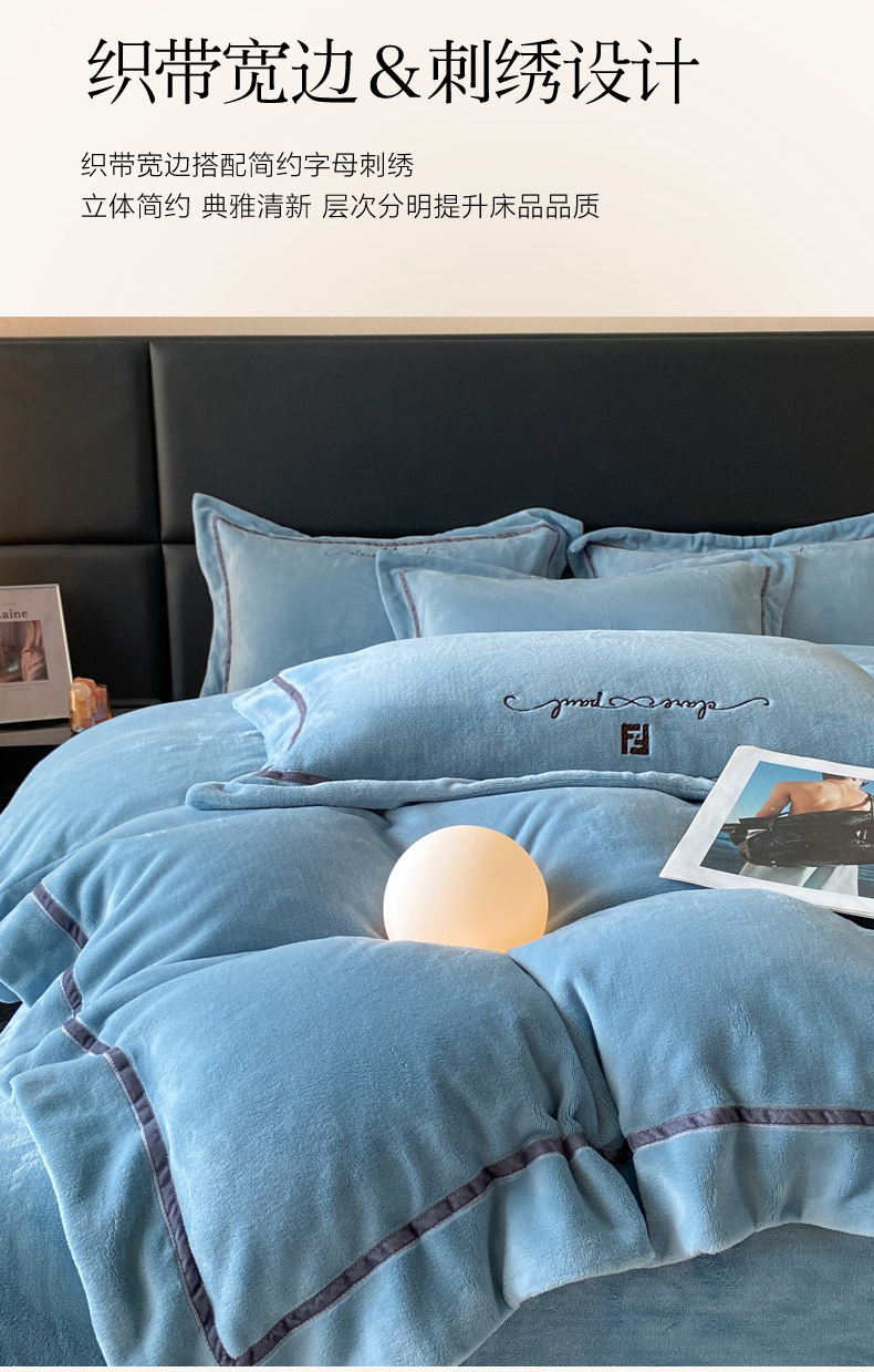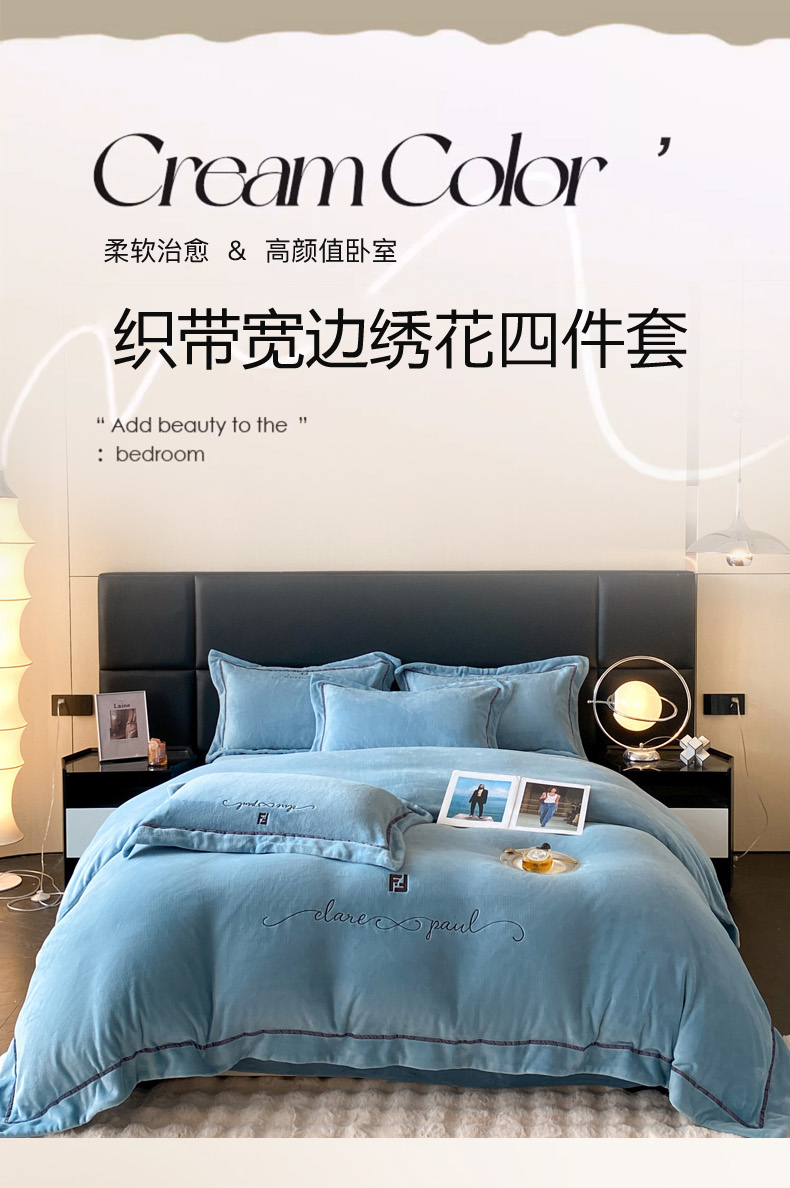 万盛家纺 2025新款牛奶绒织带宽边绣花四件套 冰雪蓝