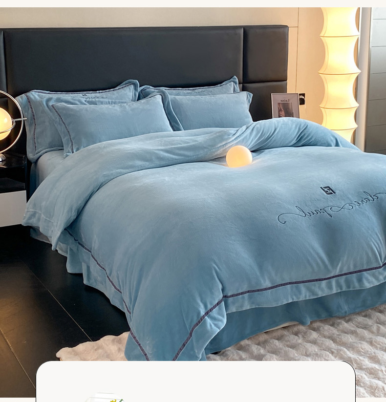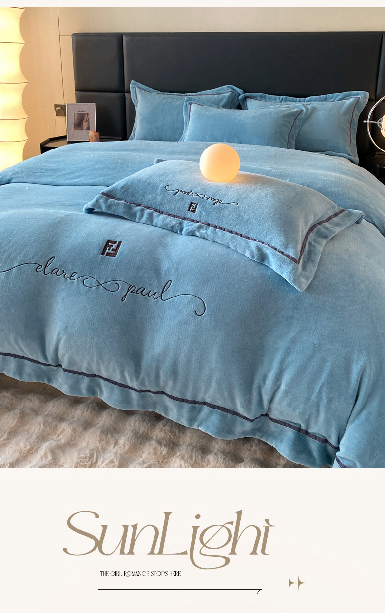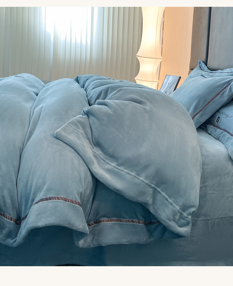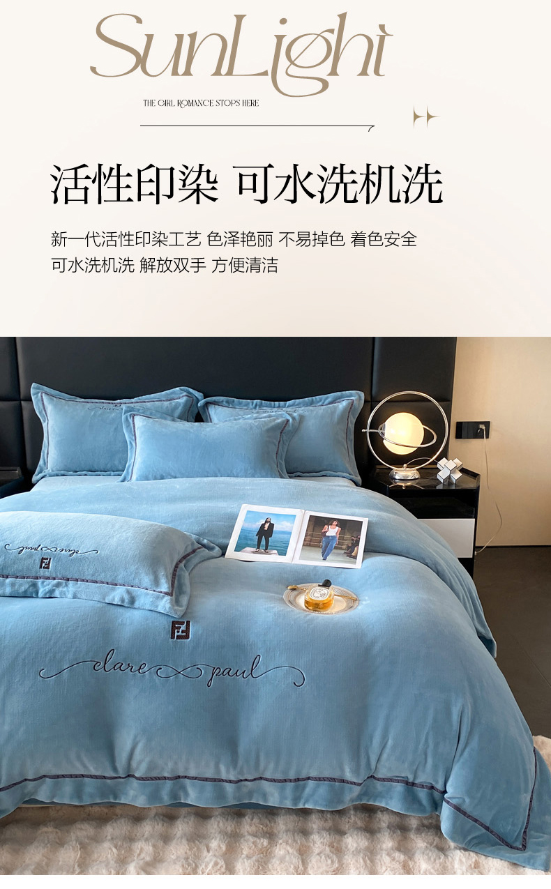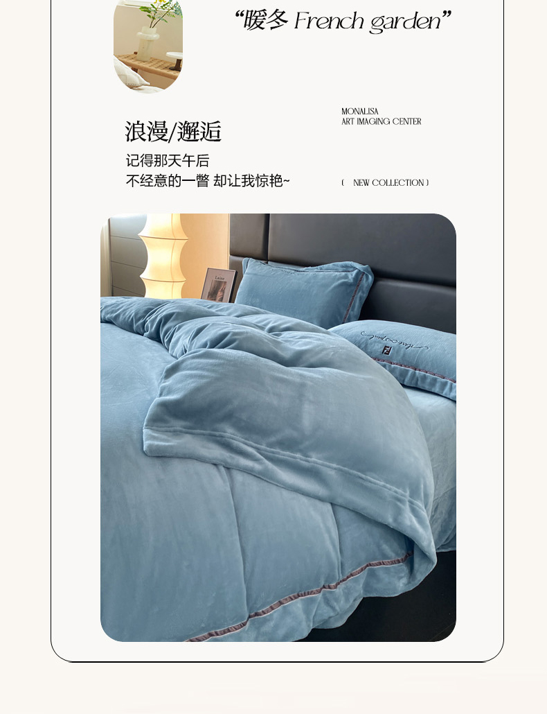 万盛家纺 2025新款牛奶绒织带宽边绣花四件套 冰雪蓝