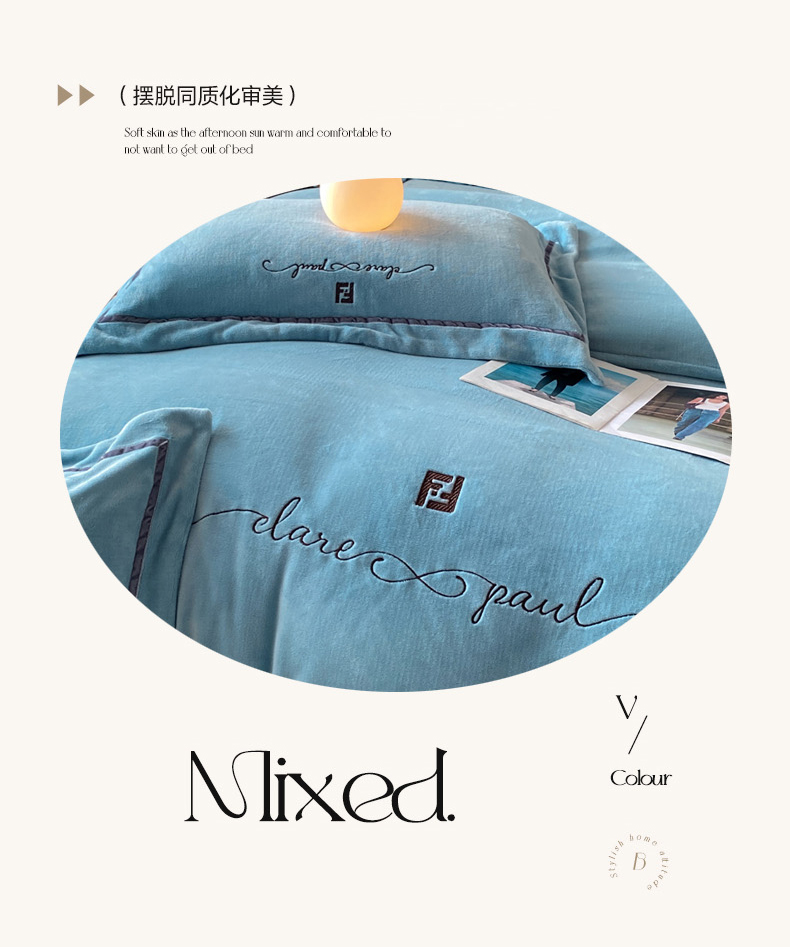 (总)万盛家纺 2025新款牛奶绒简约绣花四件套,艾草绿,豆沙色,高级灰,奶油黄,香草白,杏仁色,悠悠粉