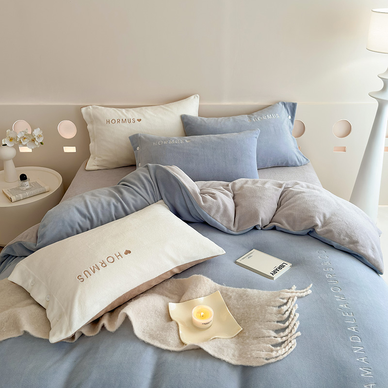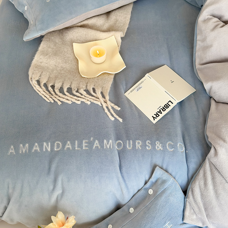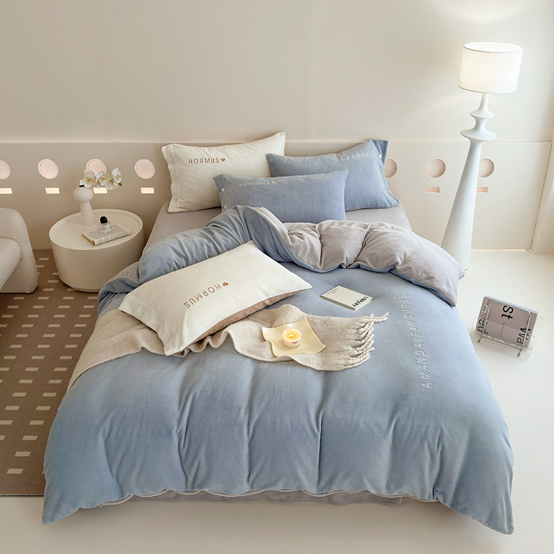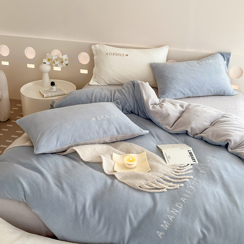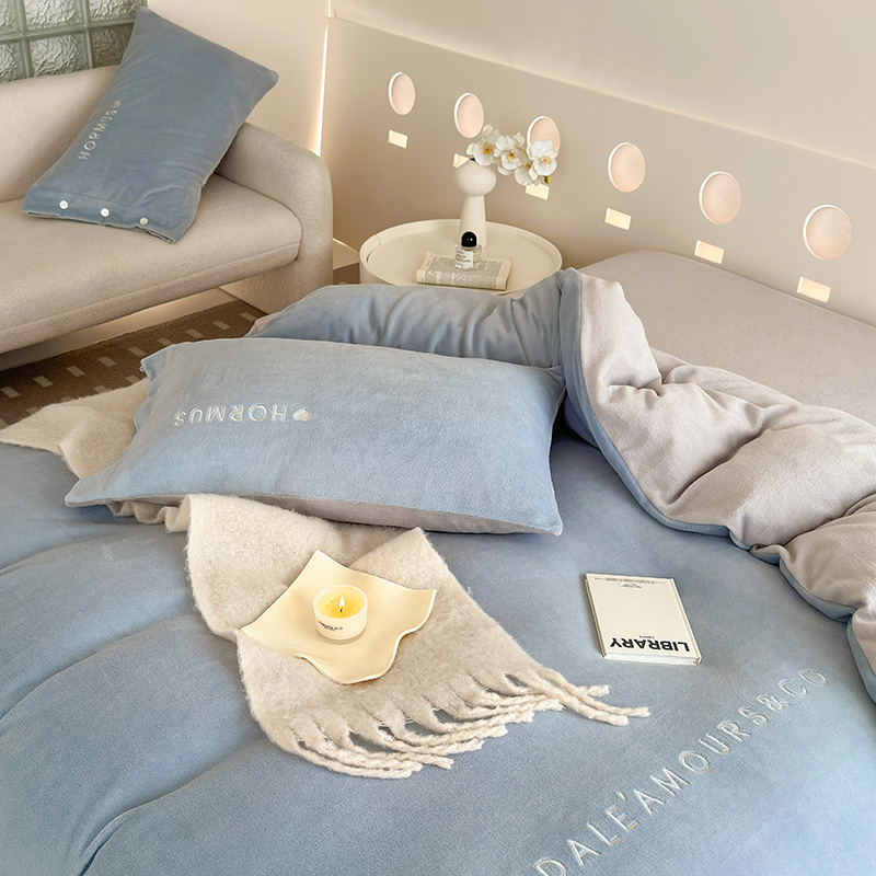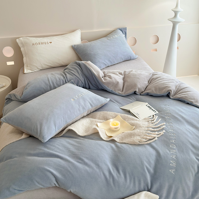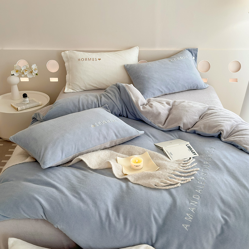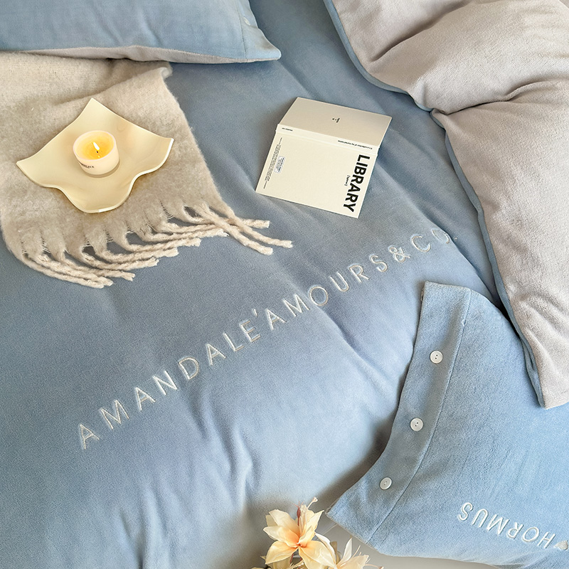 潘朵拉家纺 2024新款字母绣花纯色系列牛奶绒四件套 穆斯 蓝+灰