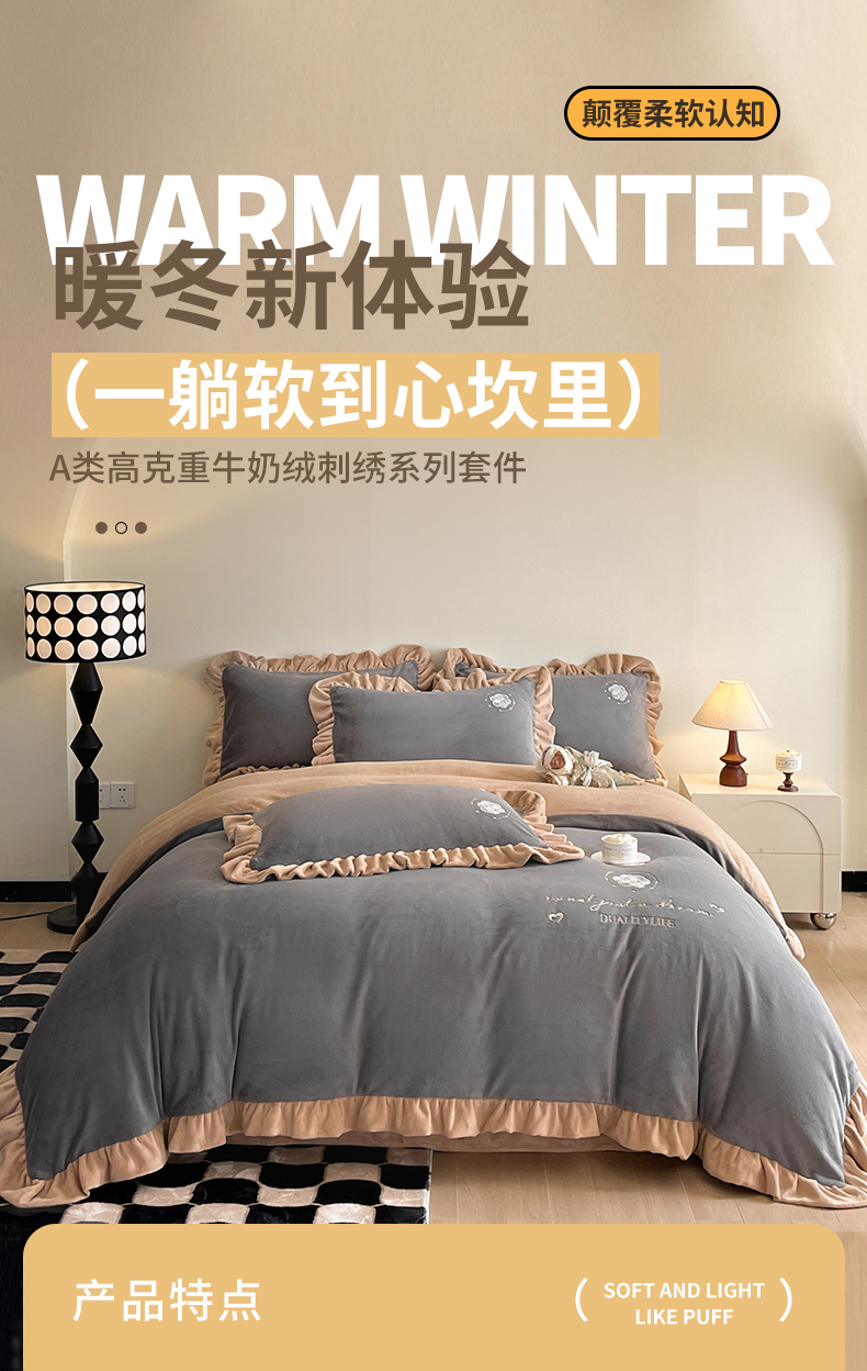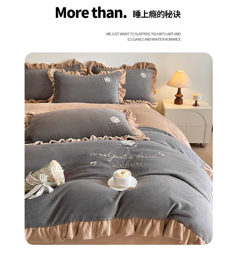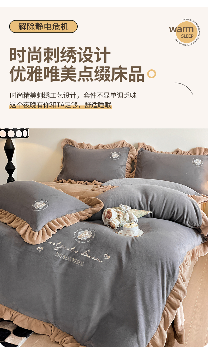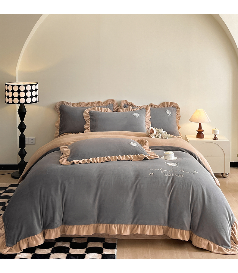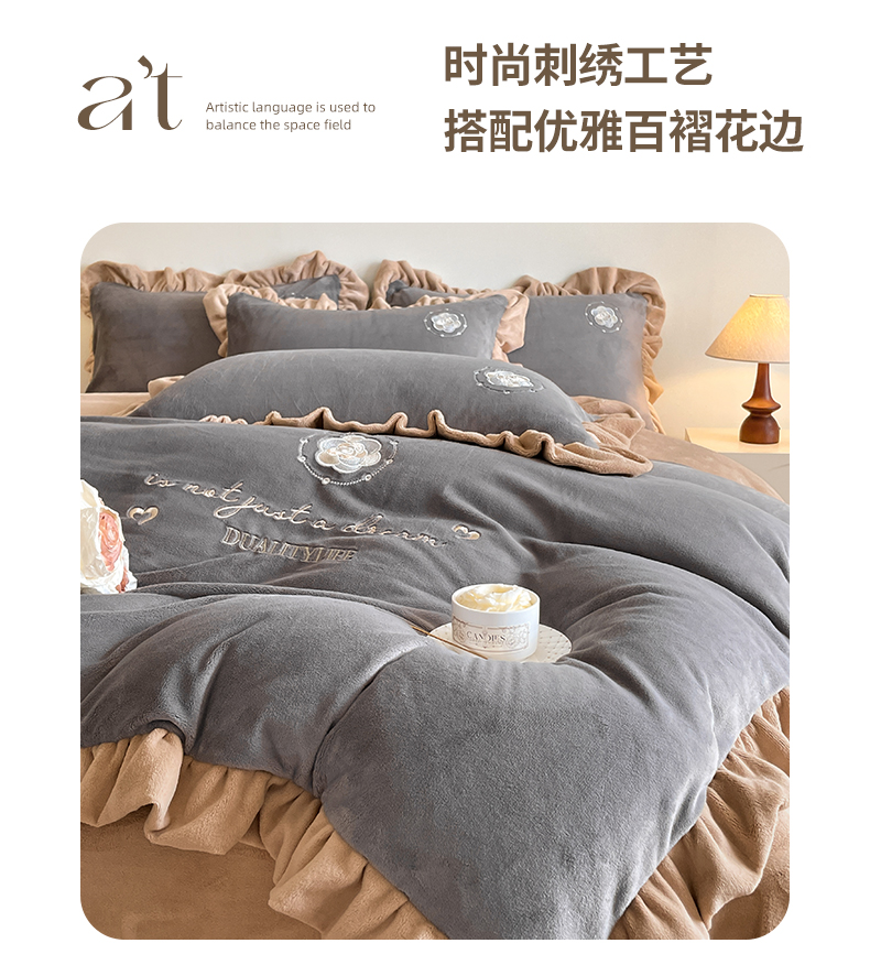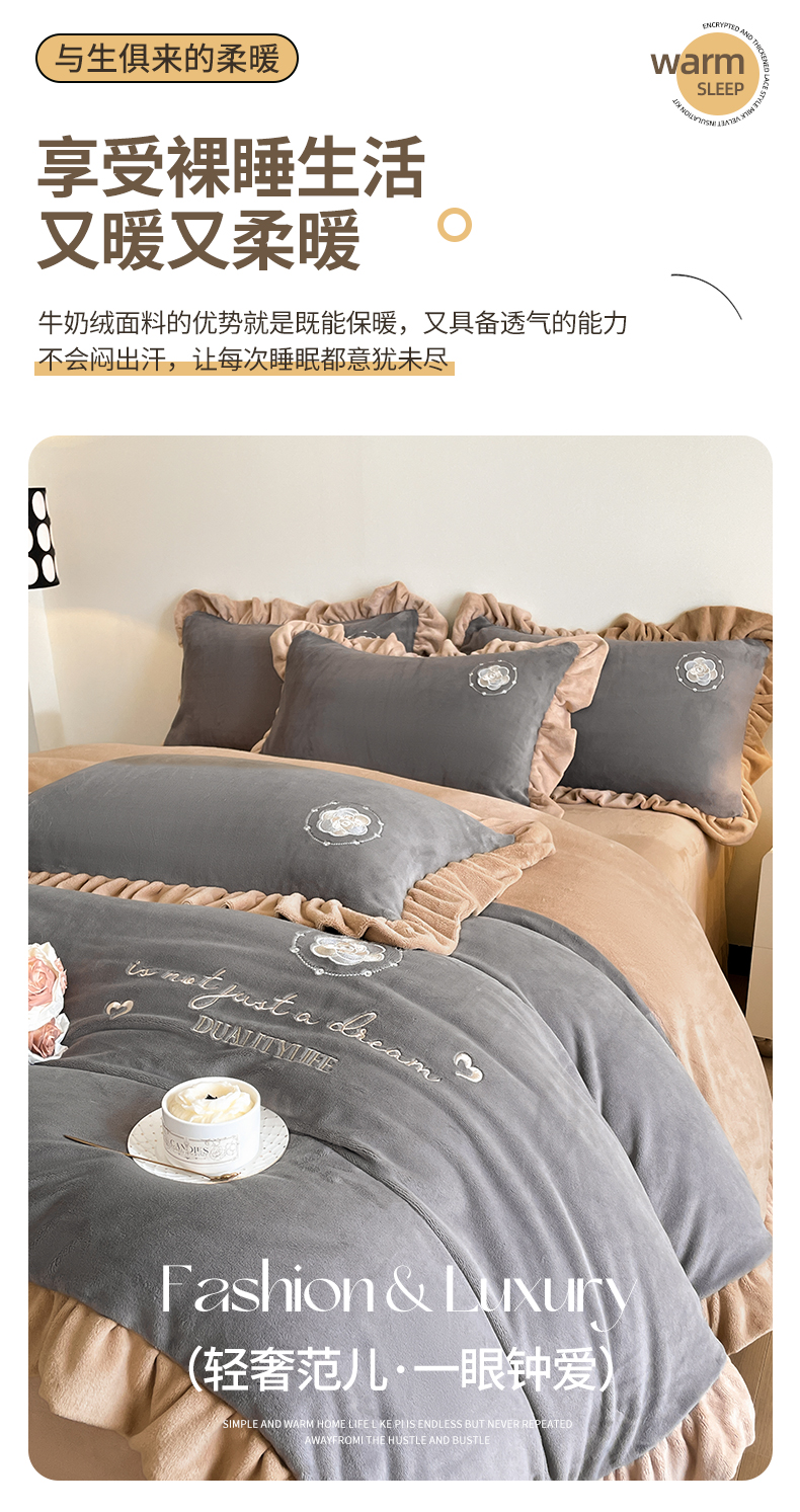 露梦家纺 2025新款加厚保暖牛奶绒刺绣款四件套-轻羽(风格二) 轻羽-银河灰,轻羽-银河灰