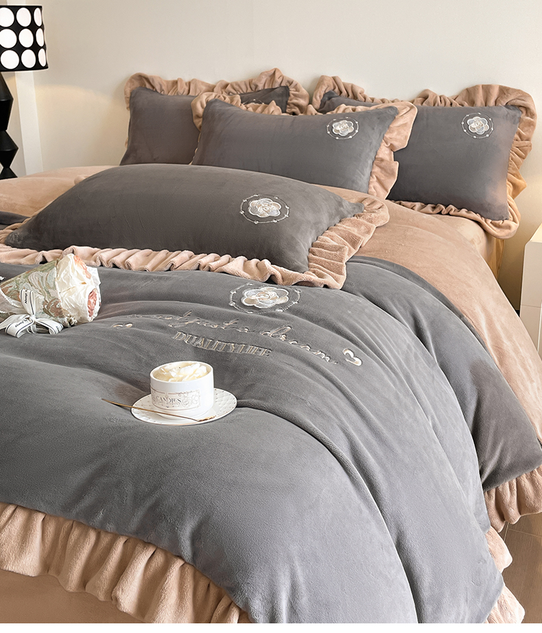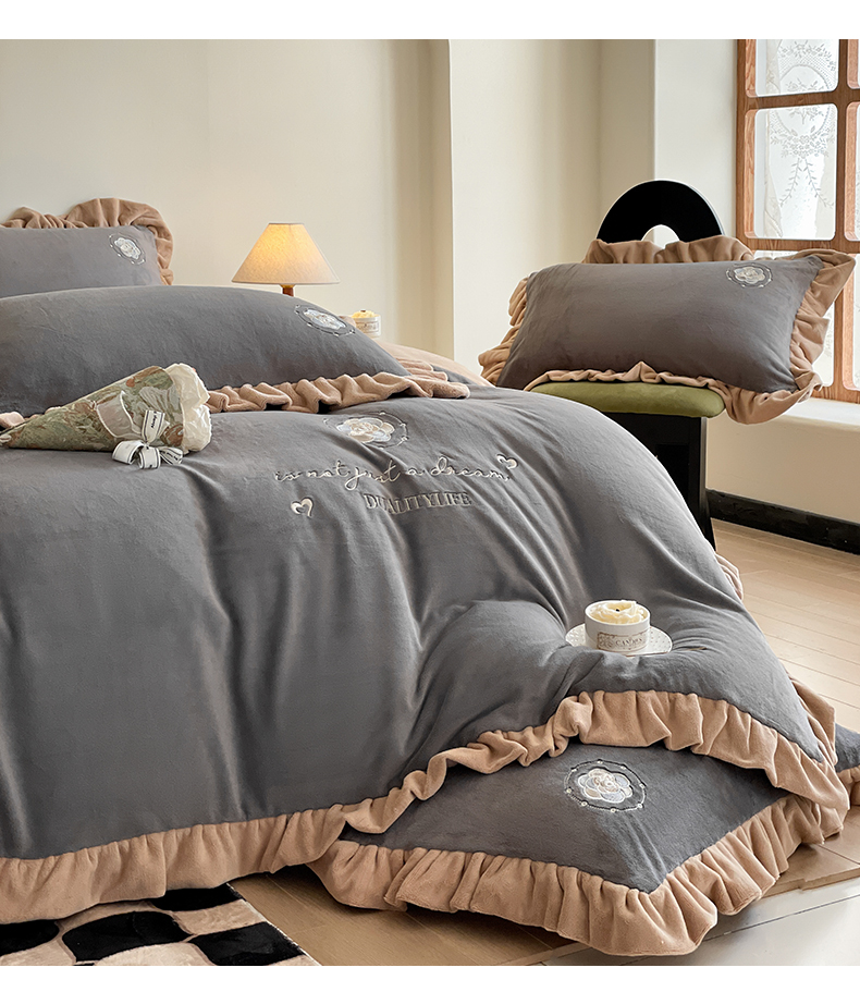 露梦家纺 2025新款A类双面木耳花边加厚保暖牛奶绒刺绣款四件套-繁花系列(提供买家秀) 繁花-高级灰