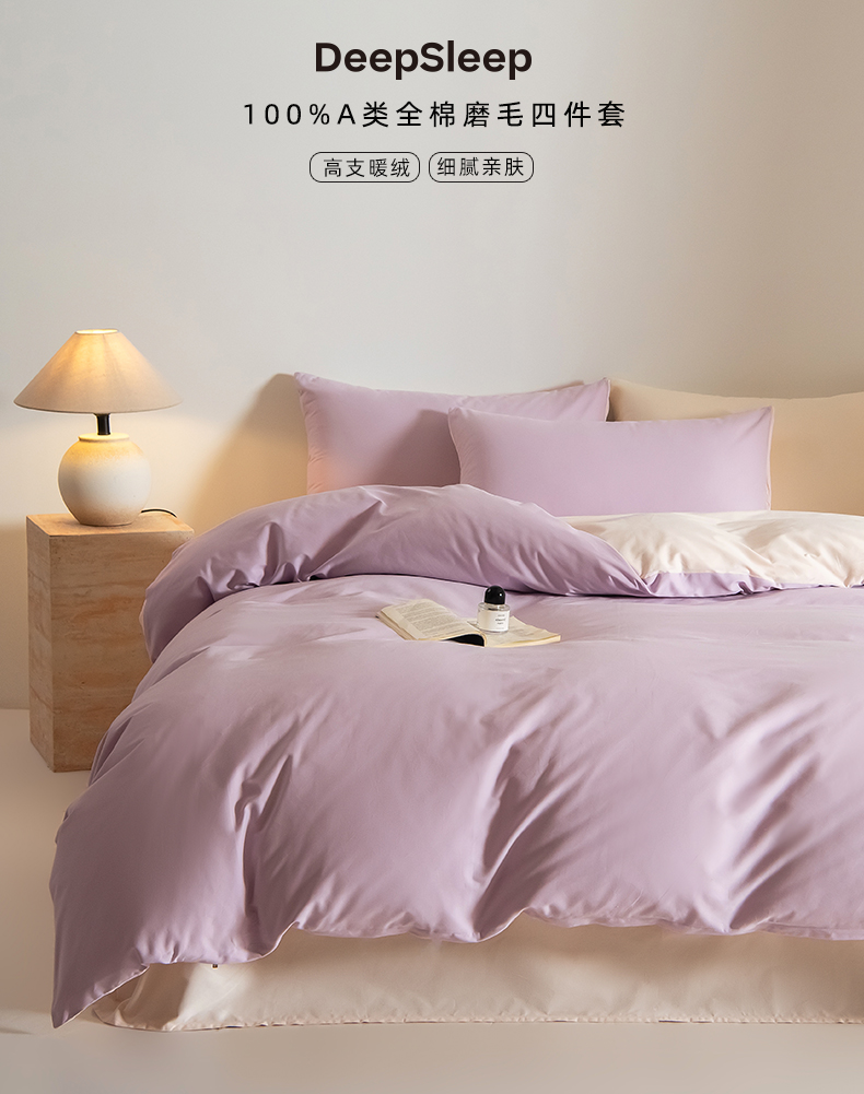 Mr.pig猪先生水洗棉 2024新款A类50全棉磨毛单品-四件套 郁金香紫+芙蓉粉