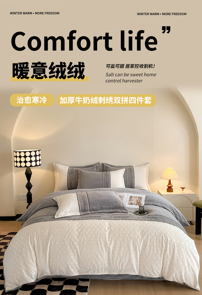 (总)慕木家纺 2025新款高克重简约无印风牛奶绒双拼四件套,宾利蓝+浅灰,米驼+奶茶咖,浅灰+米金,双拼套件-豆沙+灰