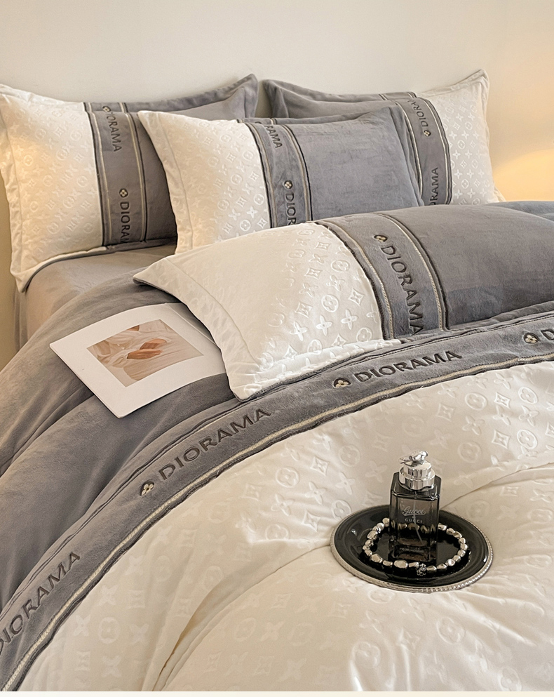 慕木家纺 2025新款牛奶绒路易刺绣拼接四件套 绒路易-太空灰