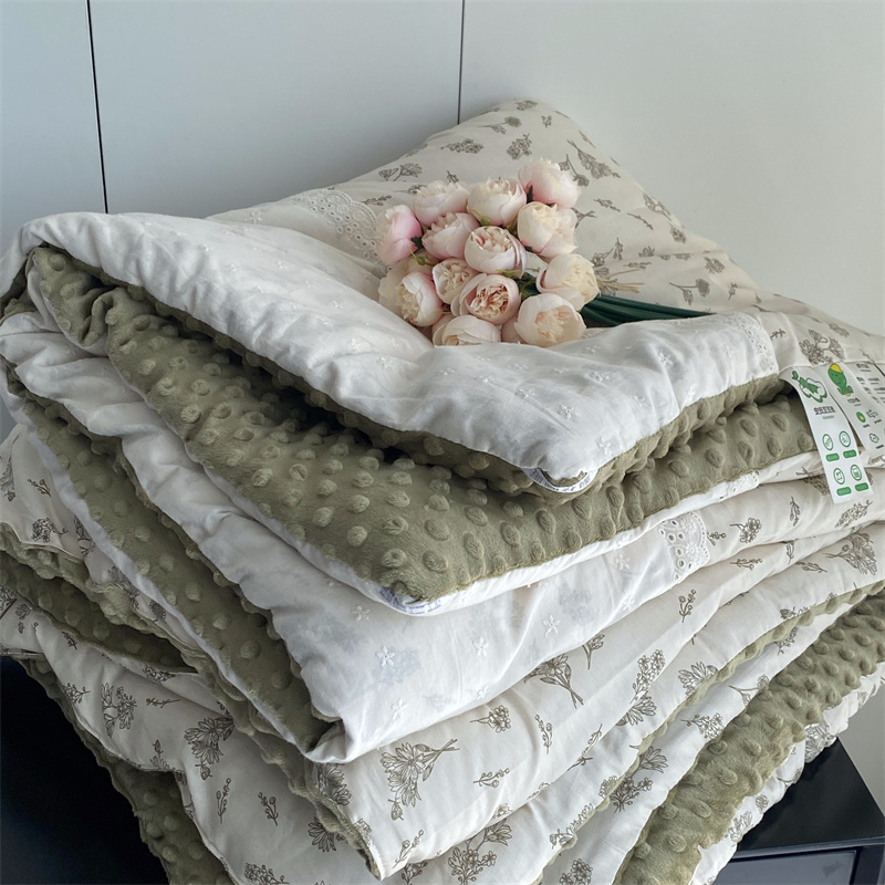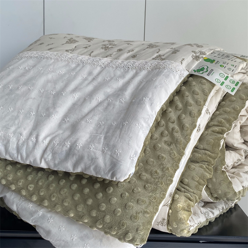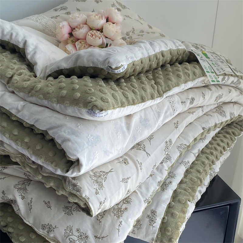2025新款秋冬季棉加豆豆绒法式花边款豆豆被被芯雏菊绿