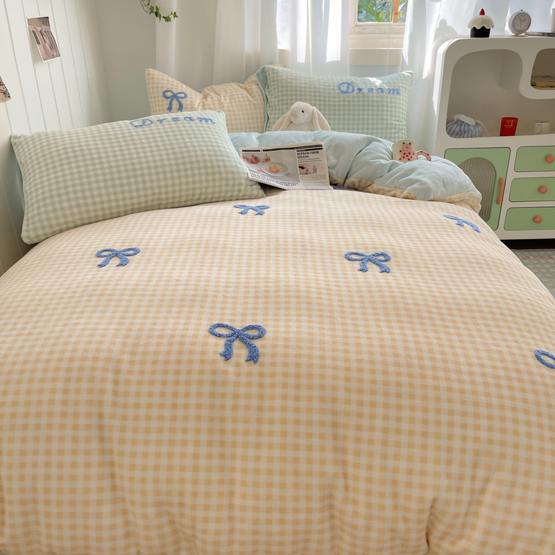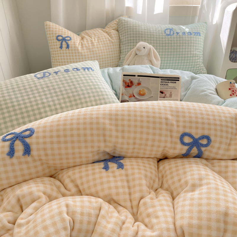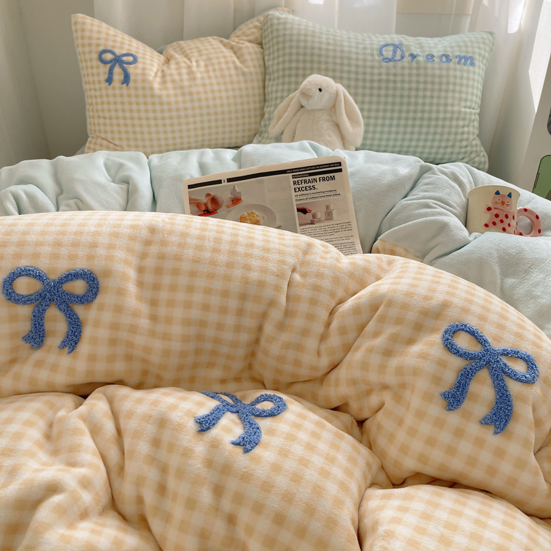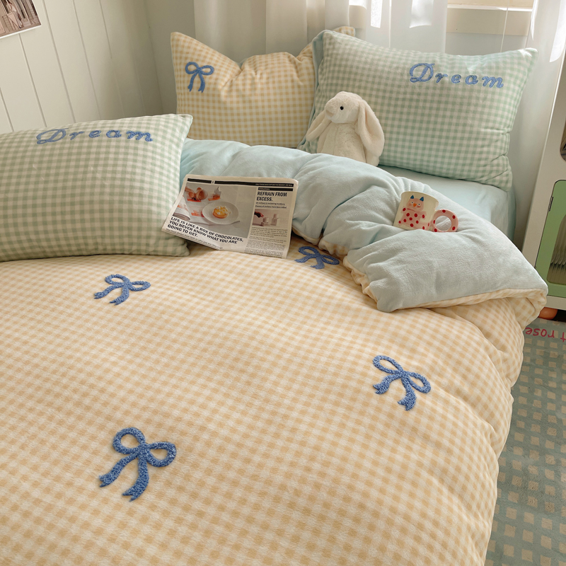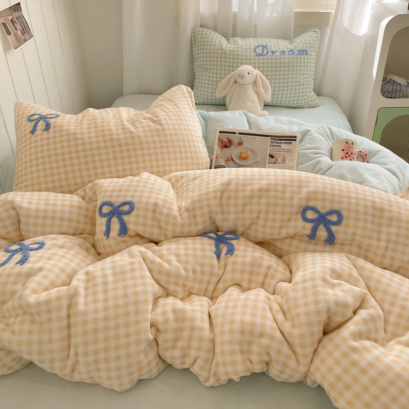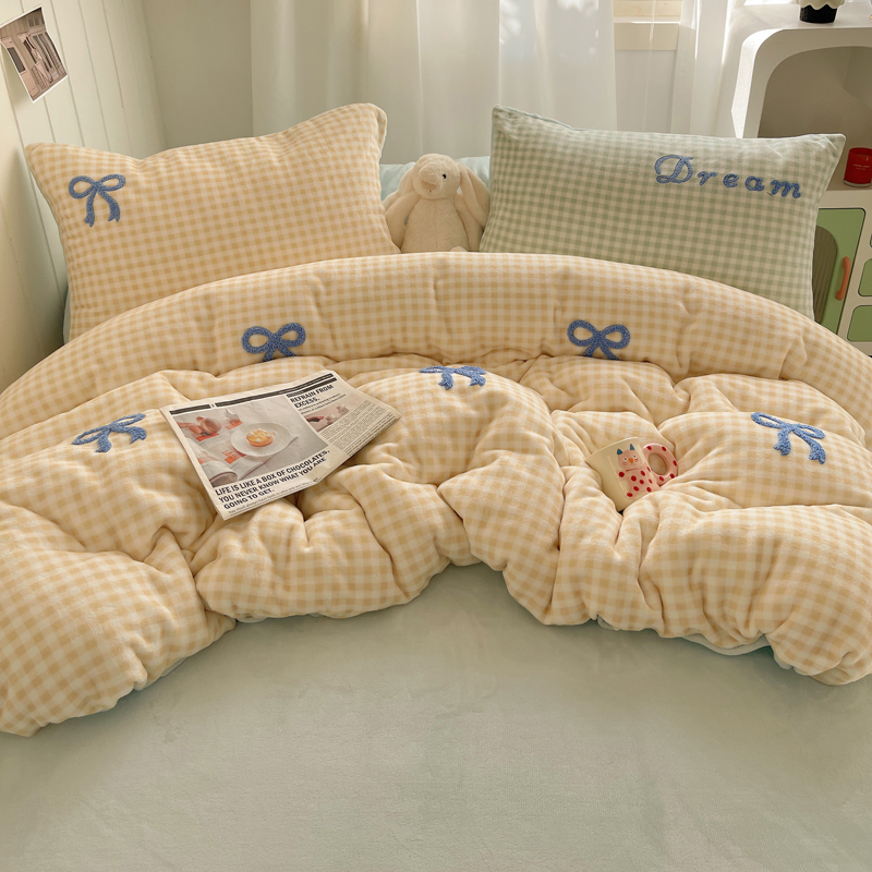 商品名称:顾里家纺 2024新款格子蝴蝶结毛巾绣牛奶绒四件套 黄格蝴蝶结