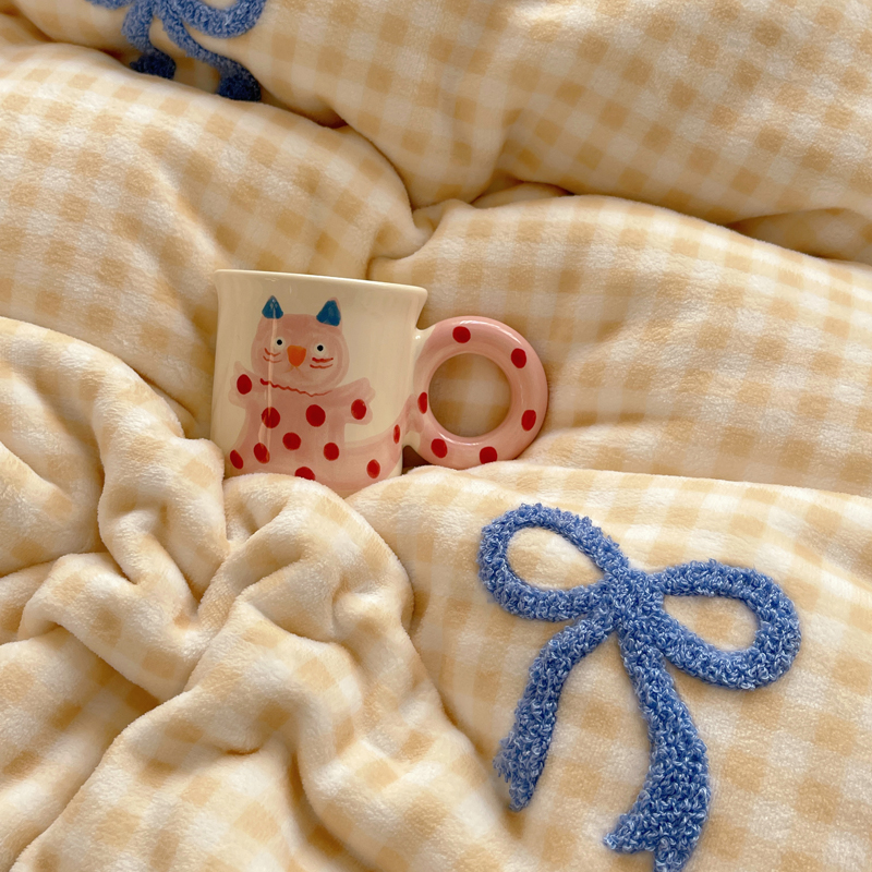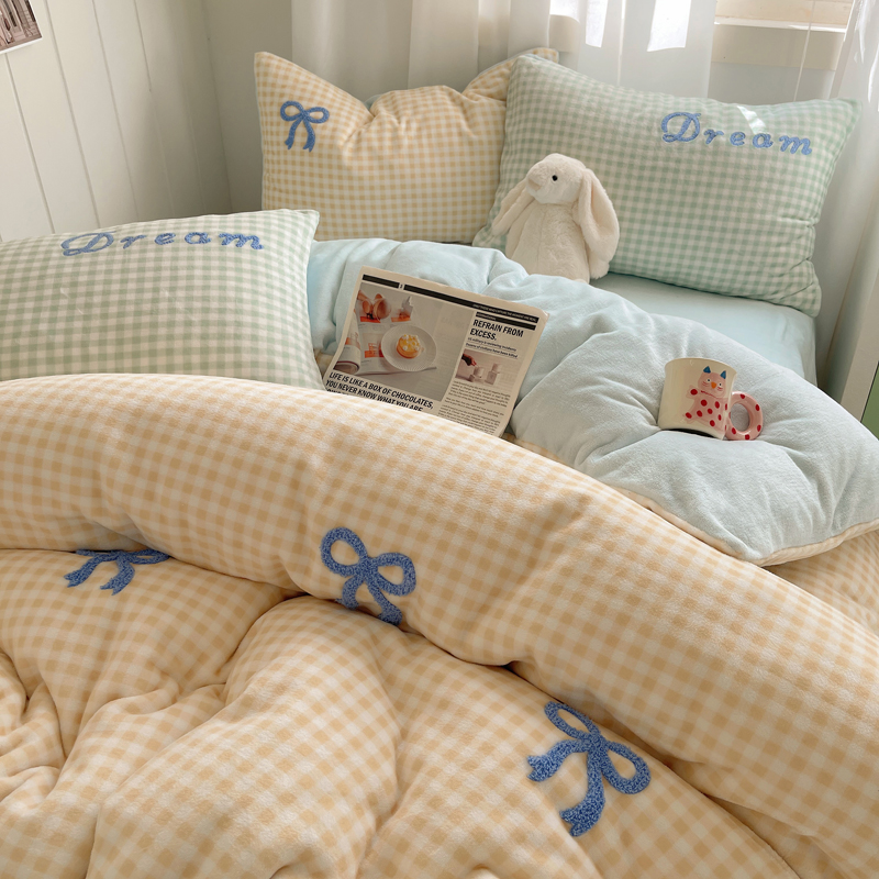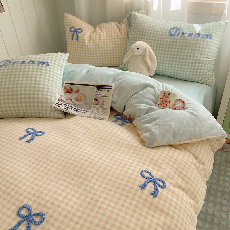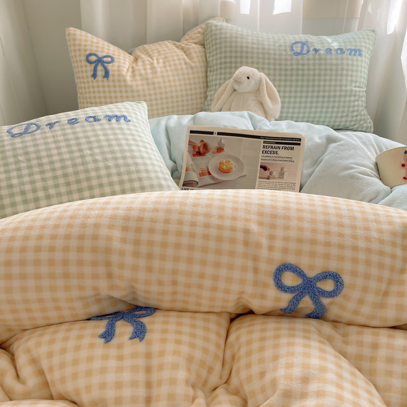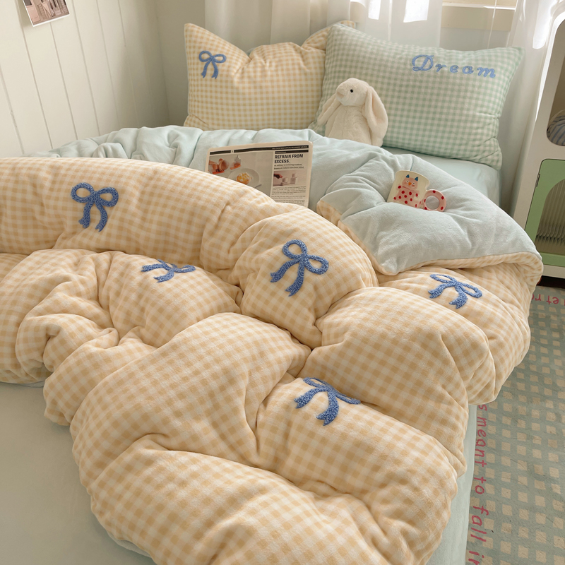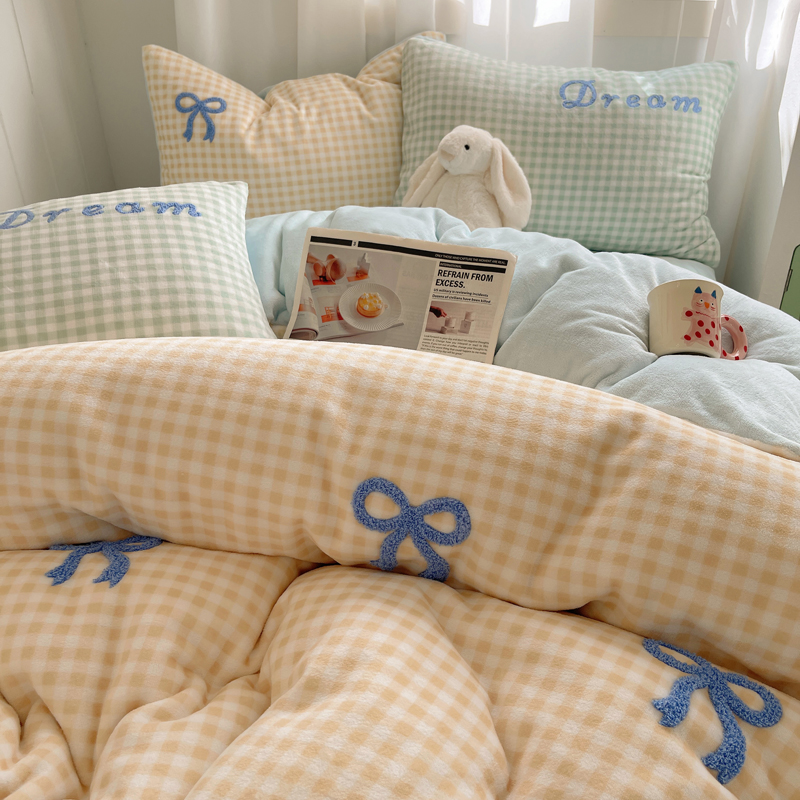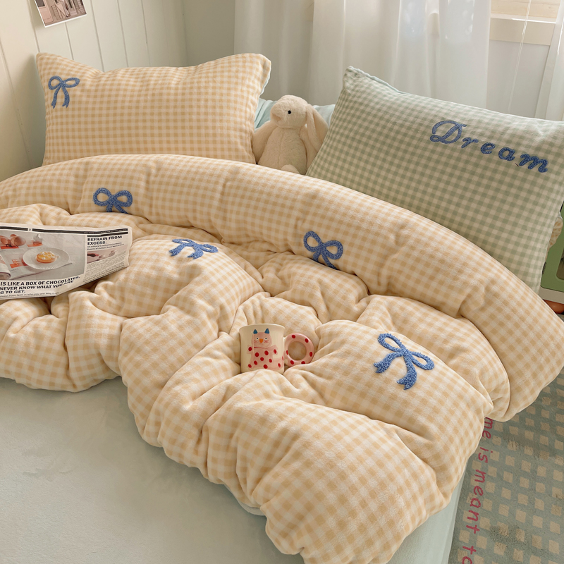 商品名称:顾里家纺 2024新款格子蝴蝶结毛巾绣牛奶绒四件套 黄格蝴蝶结