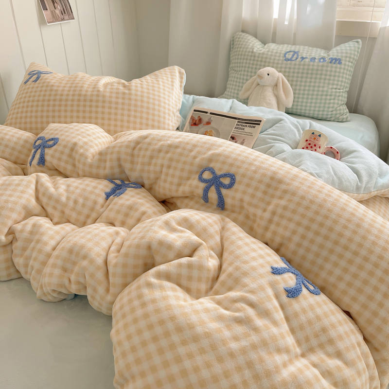 顾里家纺 2024新款格子蝴蝶结毛巾绣牛奶绒四件套 黄格蝴蝶结