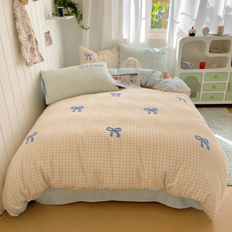 (总)顾里家纺 2024新款格子蝴蝶结毛巾绣牛奶绒四件套,粉格蝴蝶结,粉蓝蝴蝶结,黄格蝴蝶结,蓝格蝴蝶结,绿格蝴蝶结
