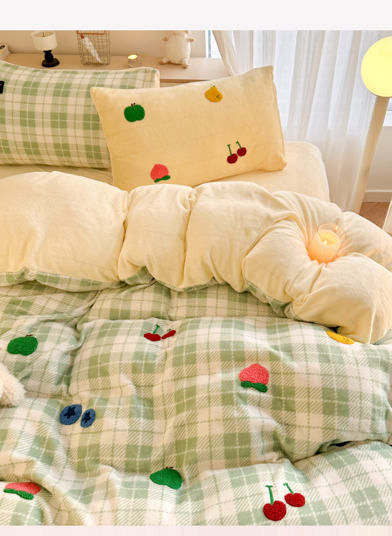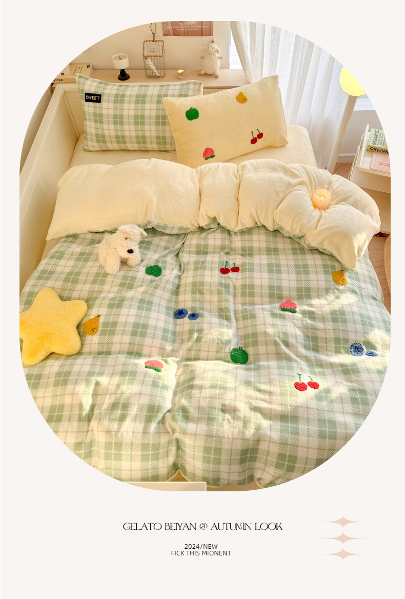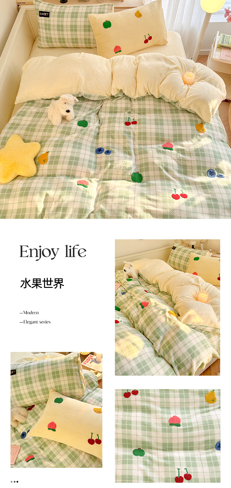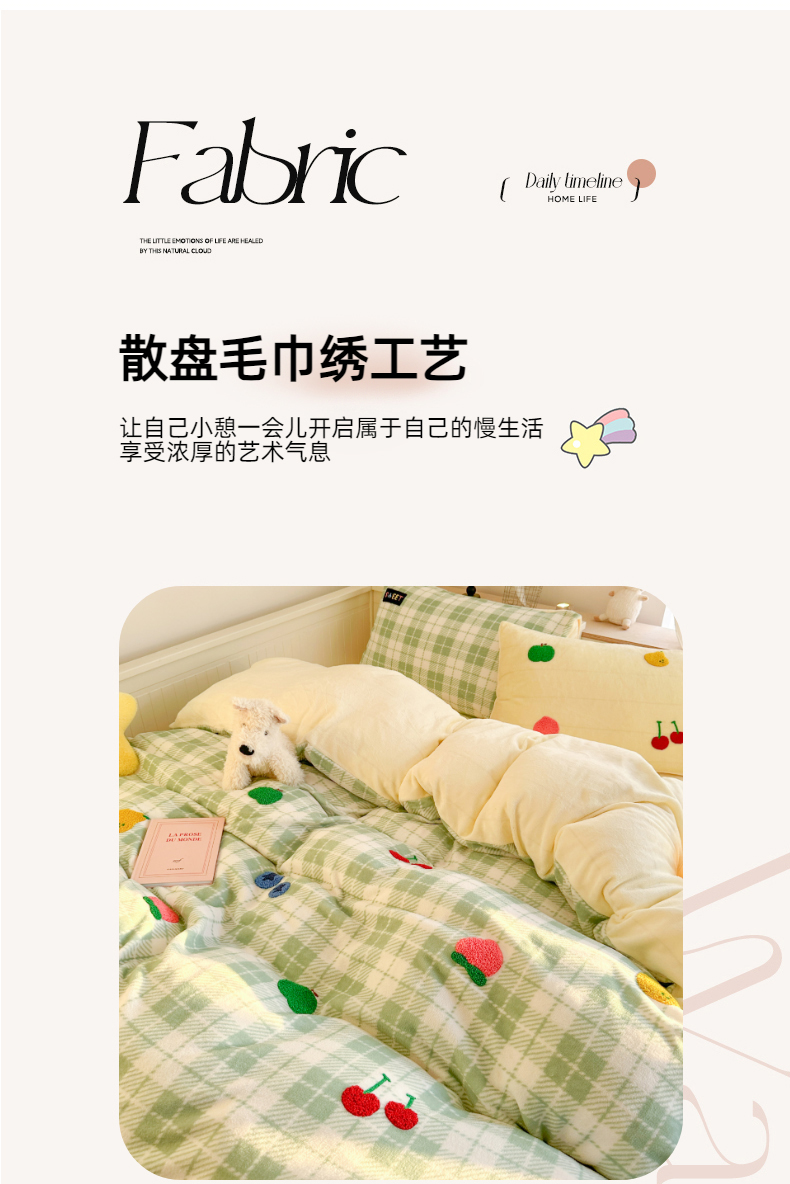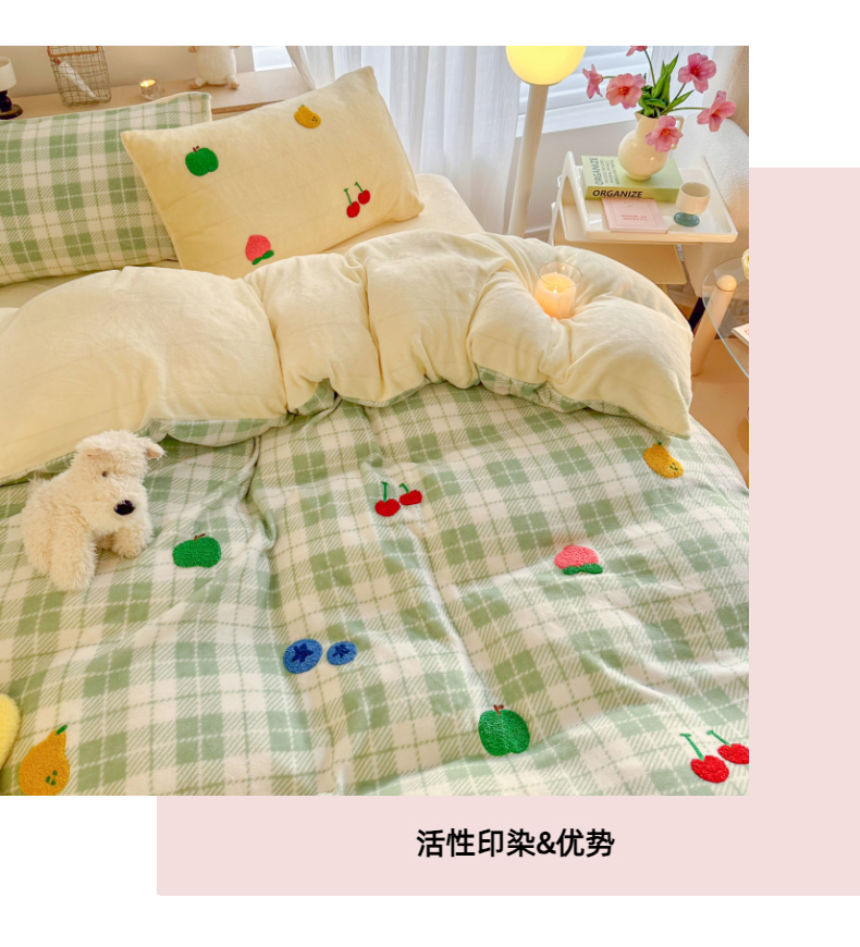 呗旺鹿 2024新款A类高克重散盘印花毛巾绣牛奶绒四件套 水果世界
