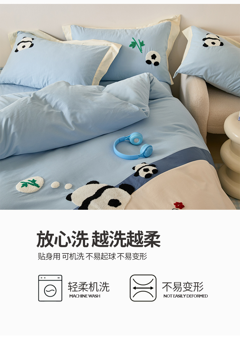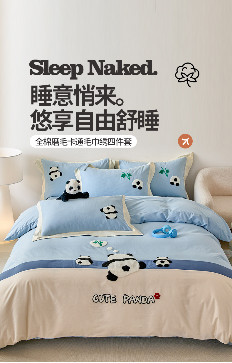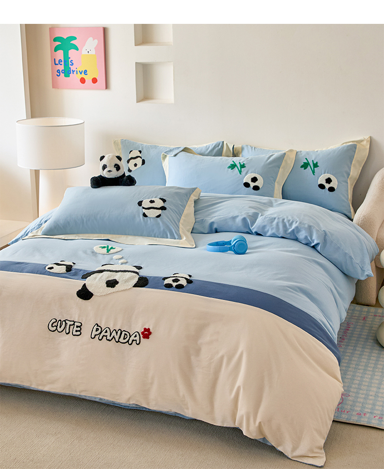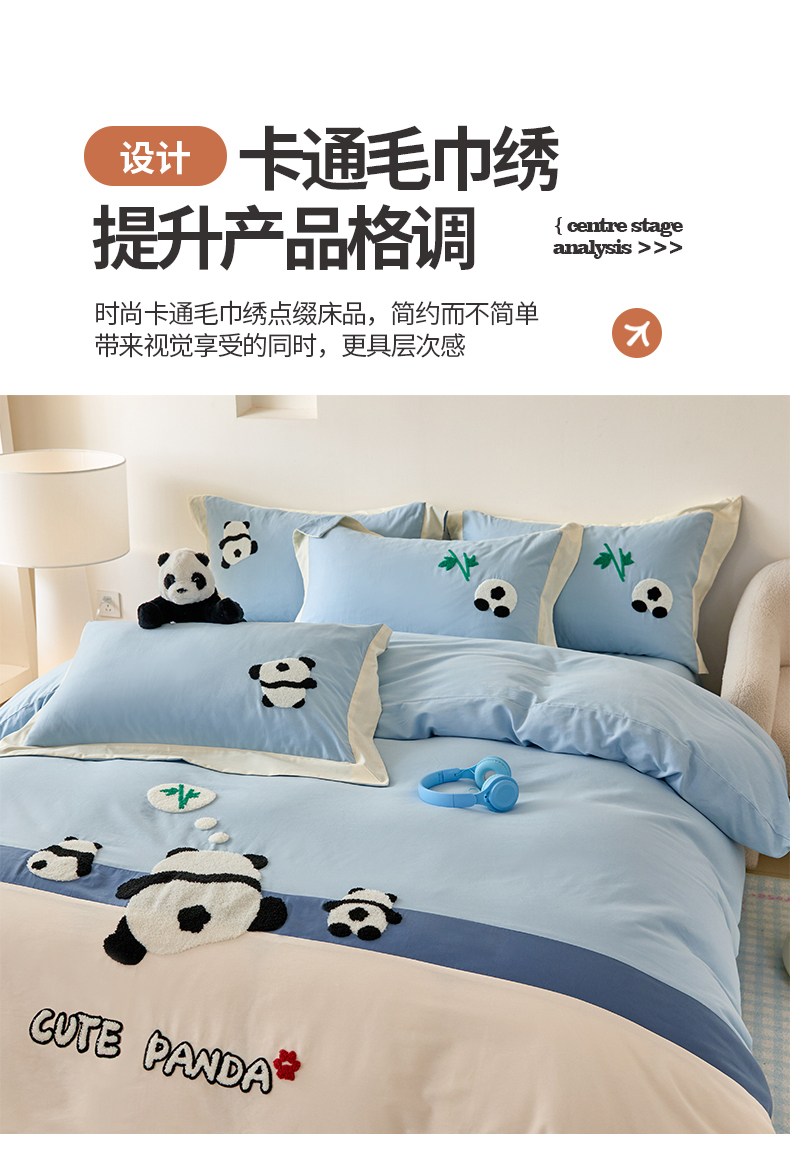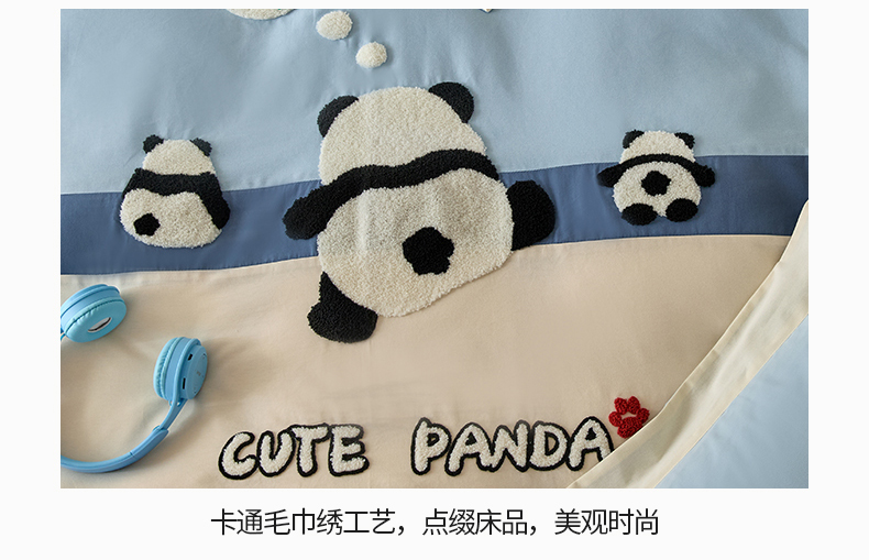 商品名称:典曼家纺 2024新款【熊猫胖达】磨毛毛巾绣四件套 熊猫胖达-水滴蓝