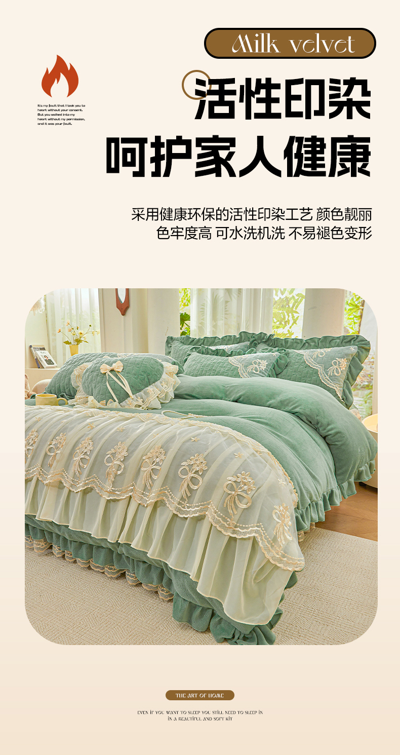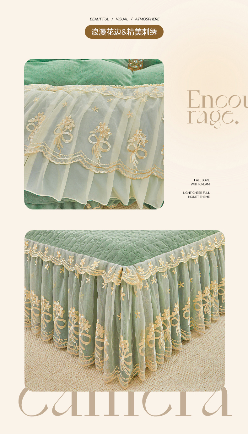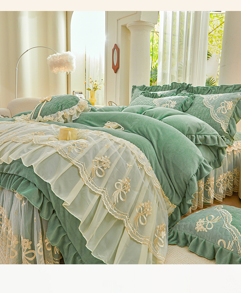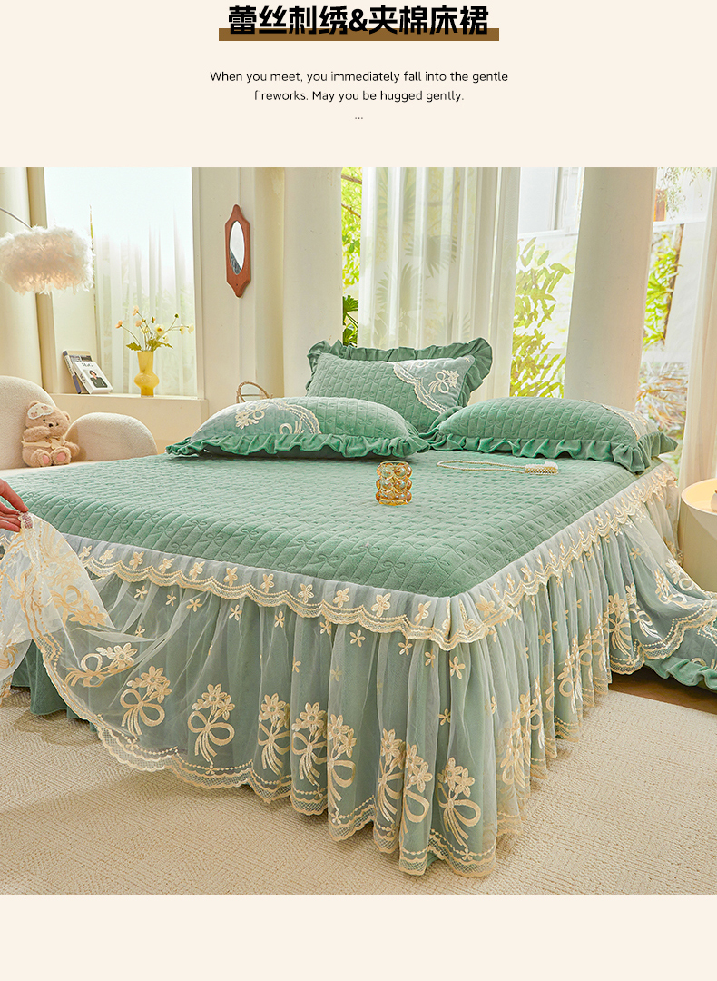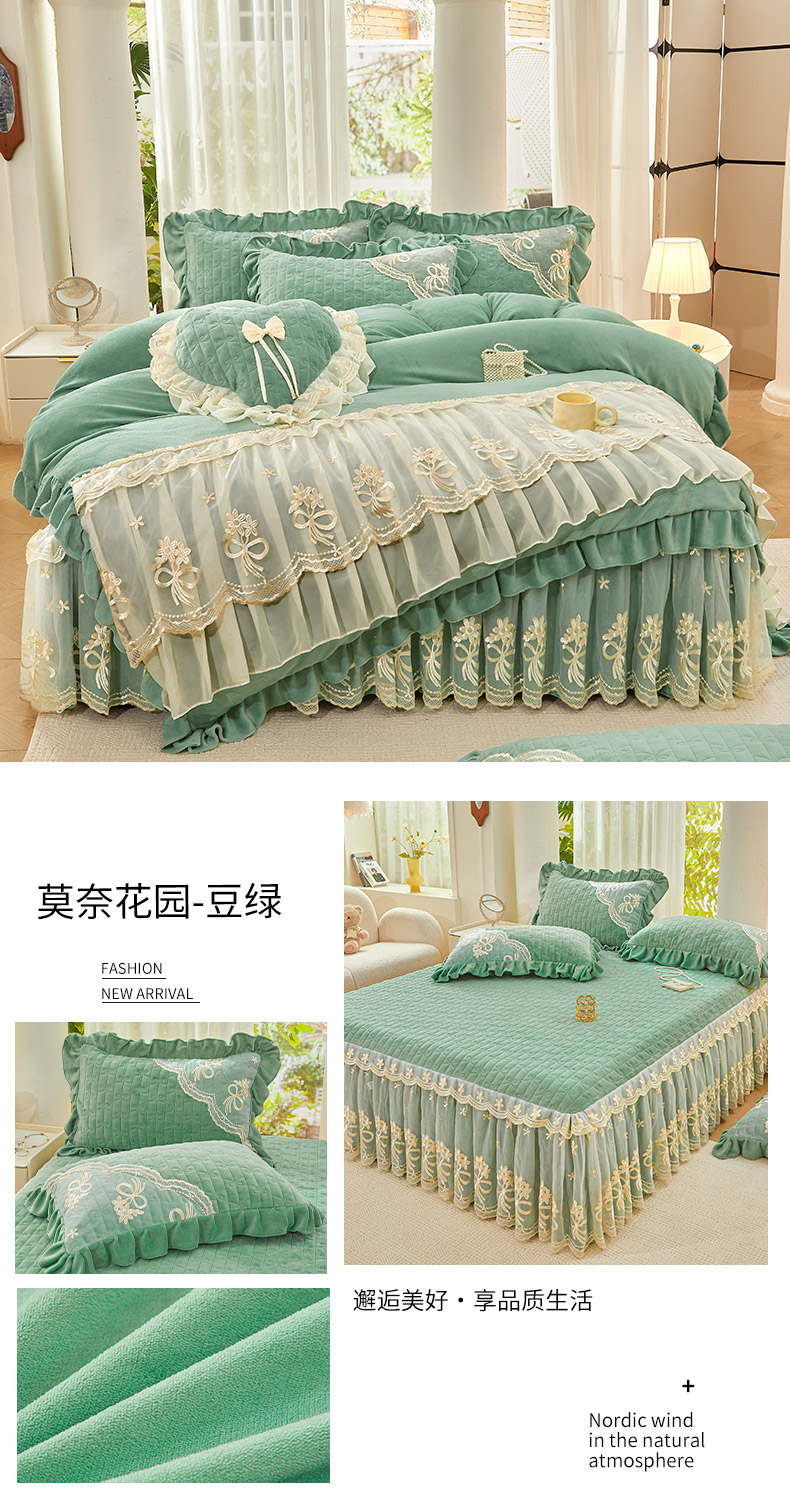 当前位置: 91家纺网 > 商品网购 > 床品套件 > 四件套 > 牛奶绒四件套 > 2024新款加厚牛奶绒蕾丝刺绣床裙四件套-莫奈花园系列 莫奈花园-豆绿