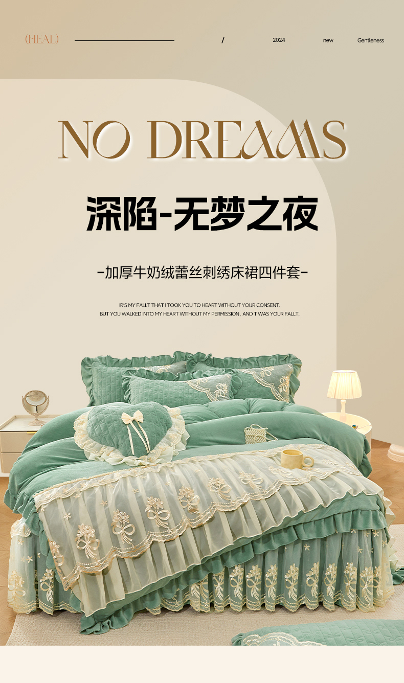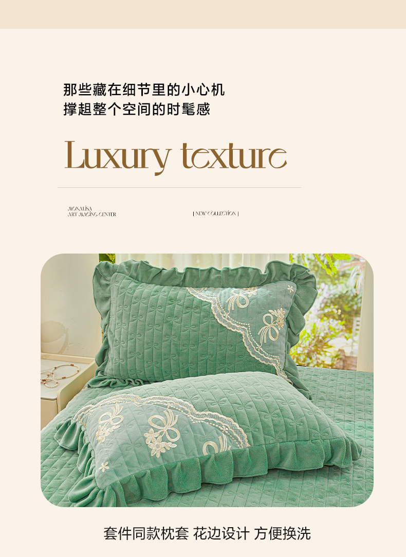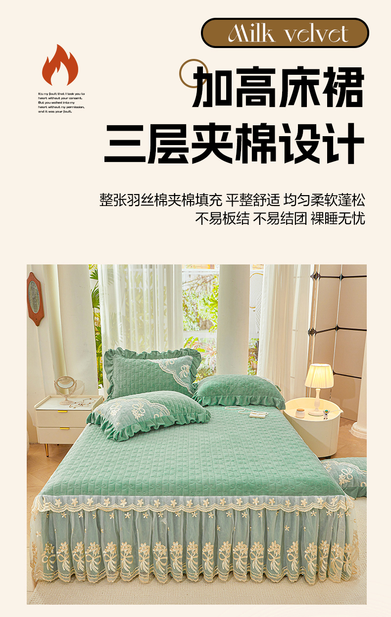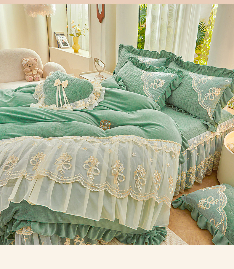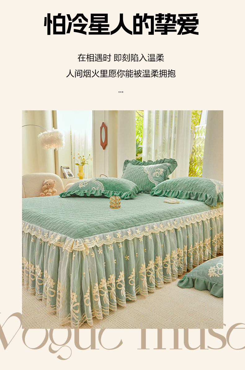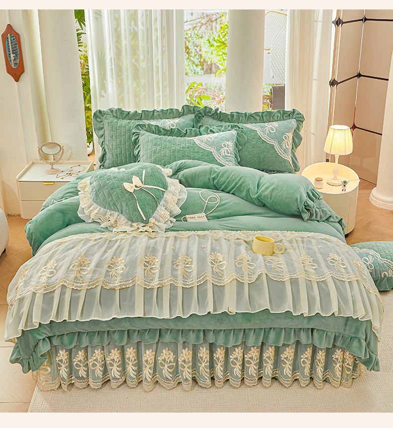 当前位置: 91家纺网 > 商品网购 > 床品套件 > 四件套 > 牛奶绒四件套 > 2024新款加厚牛奶绒蕾丝刺绣床裙四件套-莫奈花园系列 莫奈花园-豆绿