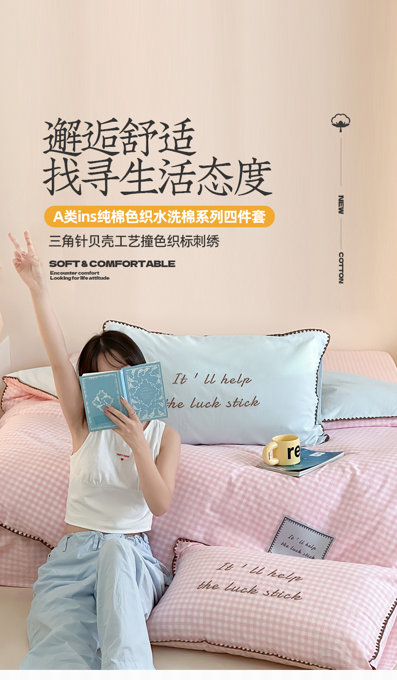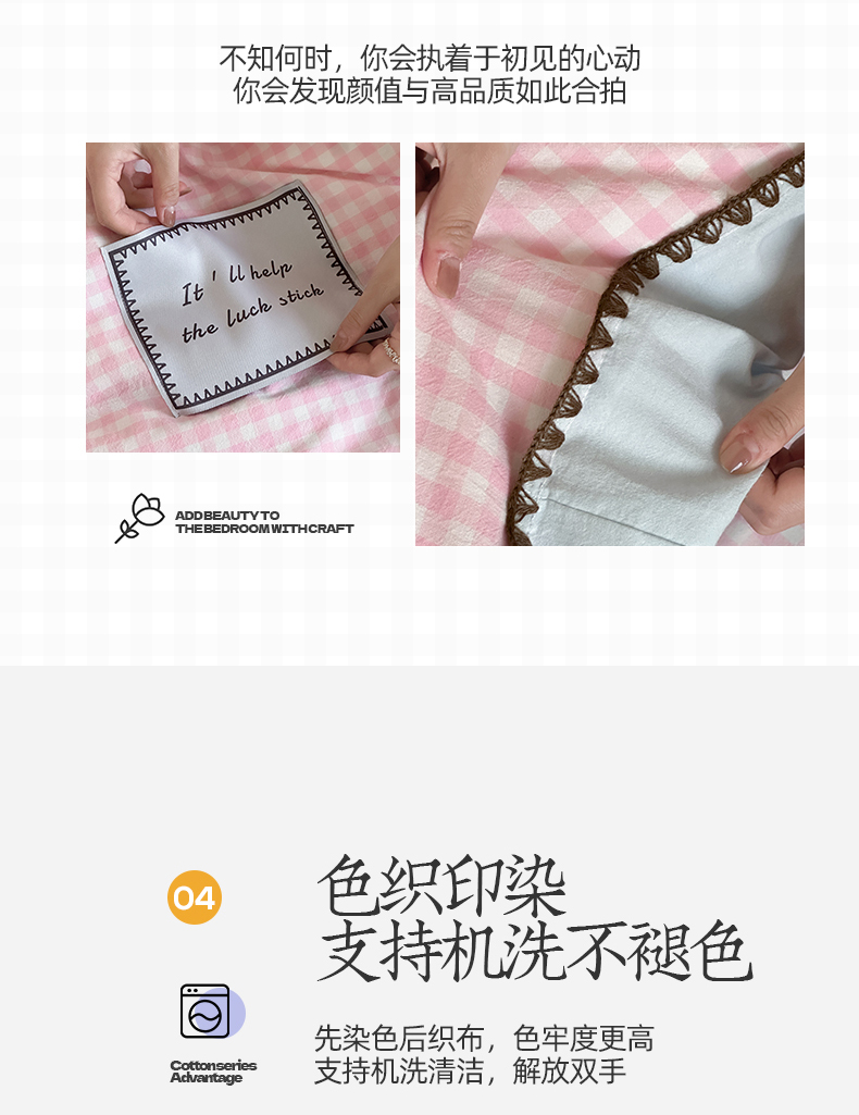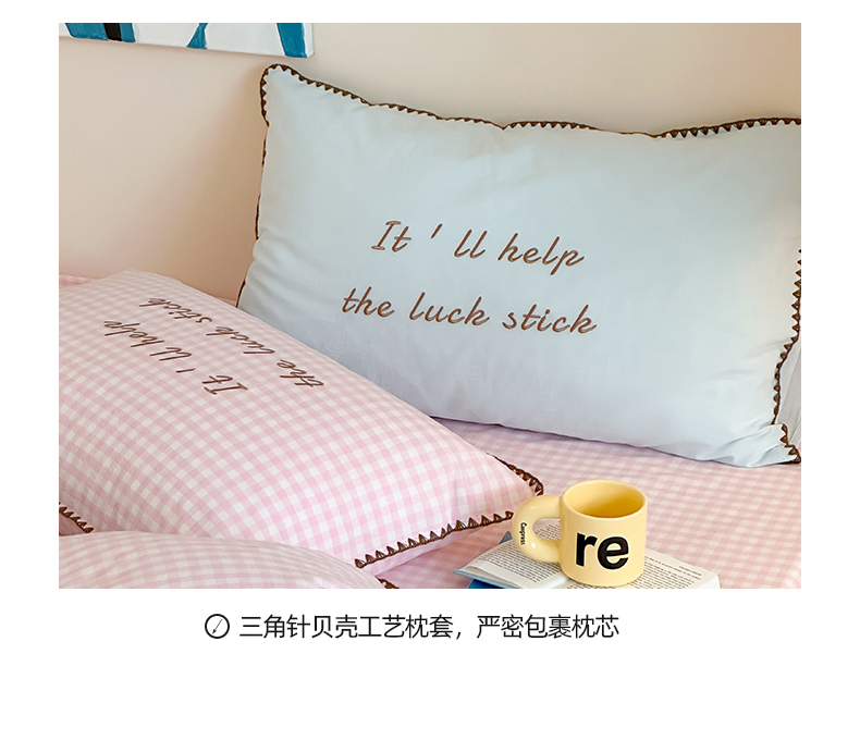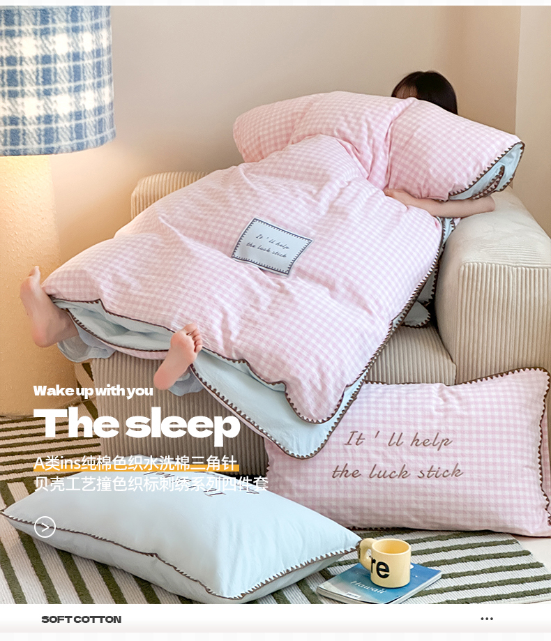 当前位置: 91家纺网 > 商品网购 > 床品套件 > 四件套 > 水洗棉四件套 > 桃子家居 2025新款A类ins纯棉色织水洗棉三角针贝壳工艺撞色织标刺绣系列四件套 棉三角针-S粉格桃桃