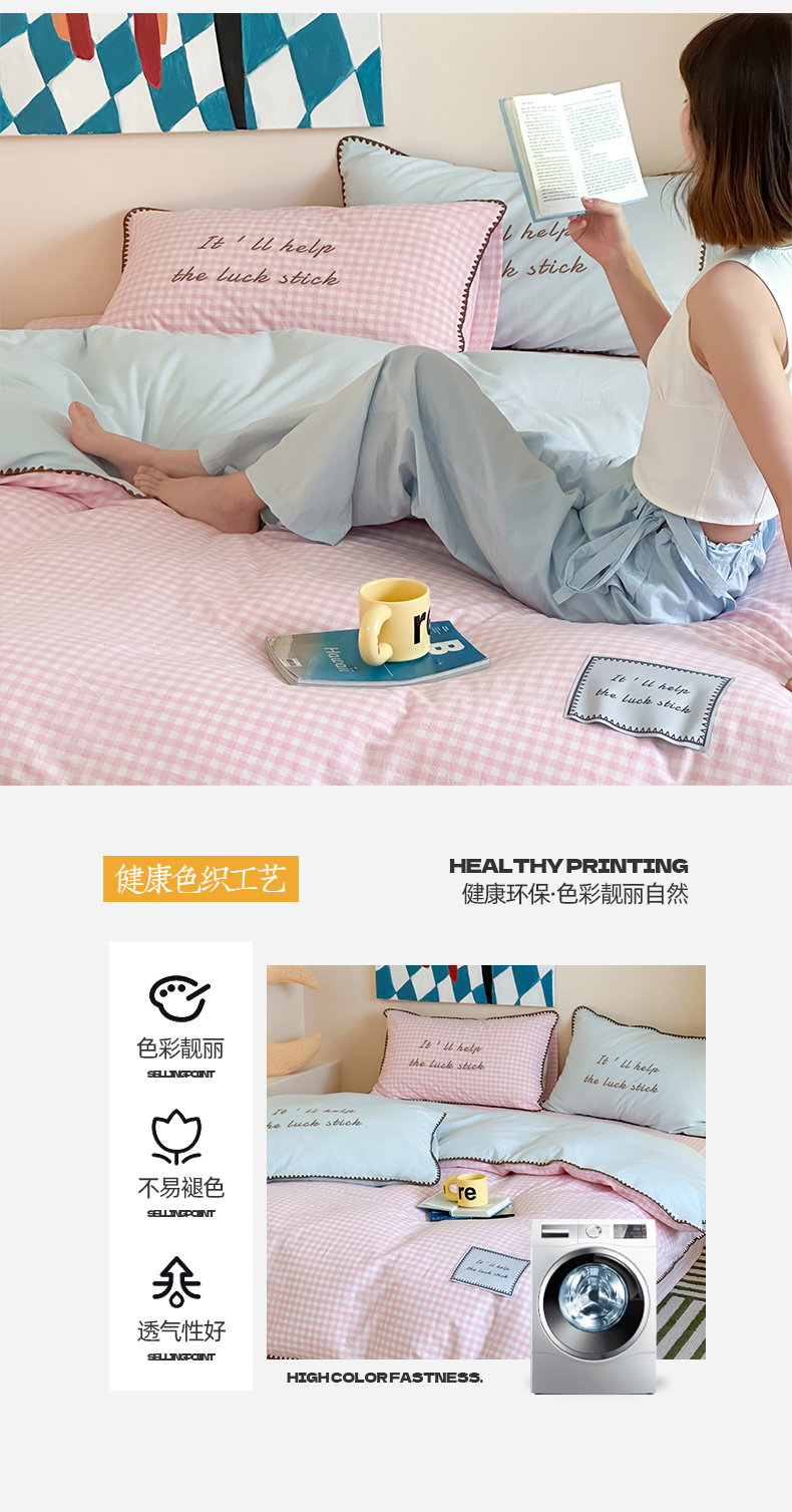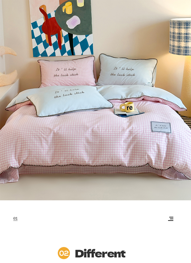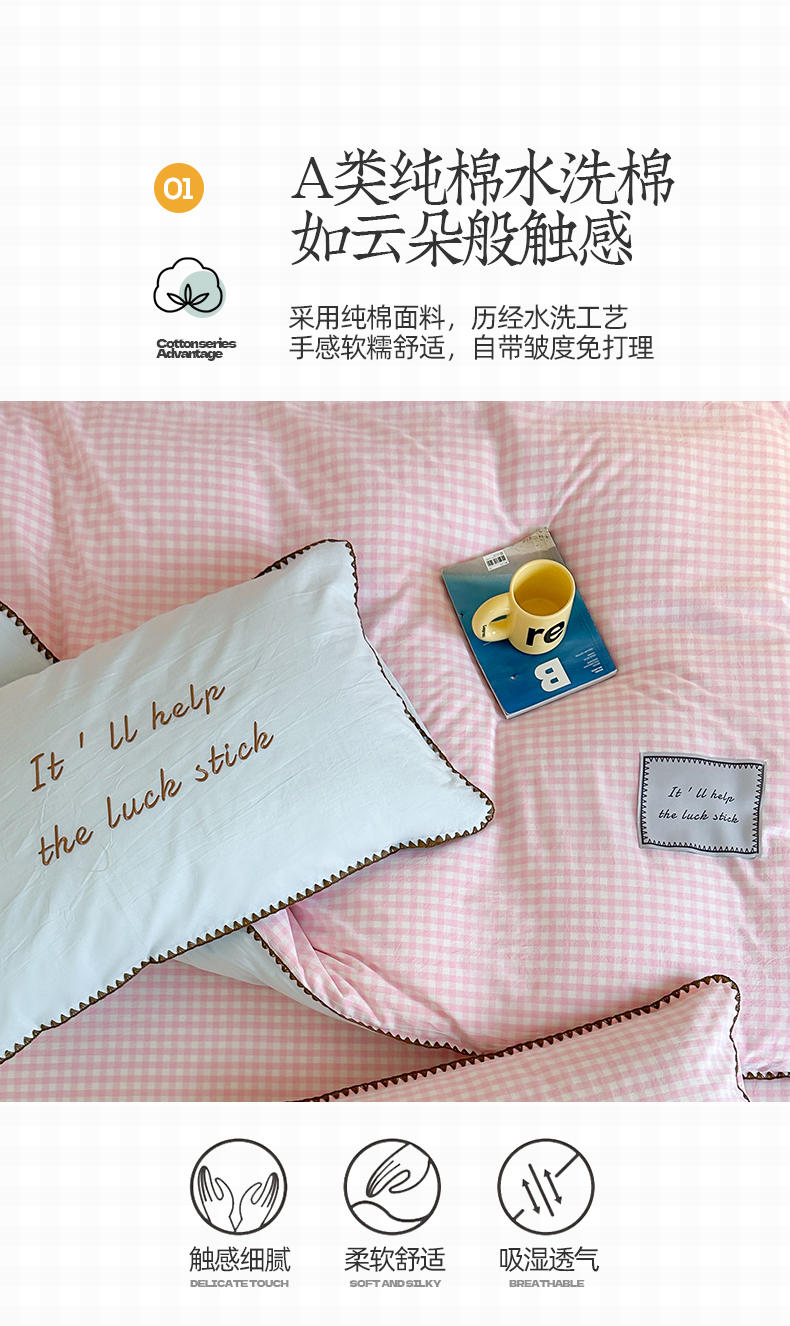 当前位置: 91家纺网 > 商品网购 > 床品套件 > 四件套 > 水洗棉四件套 > 桃子家居 2025新款A类ins纯棉色织水洗棉三角针贝壳工艺撞色织标刺绣系列四件套 棉三角针-S粉格桃桃