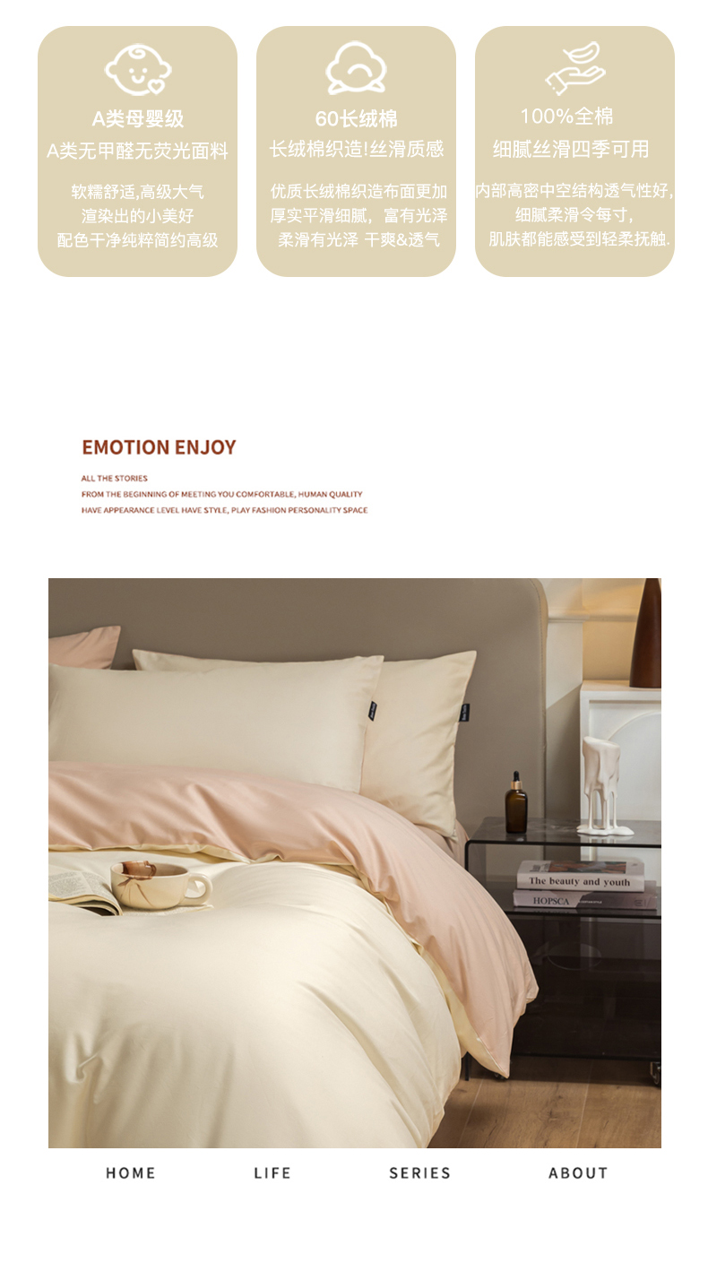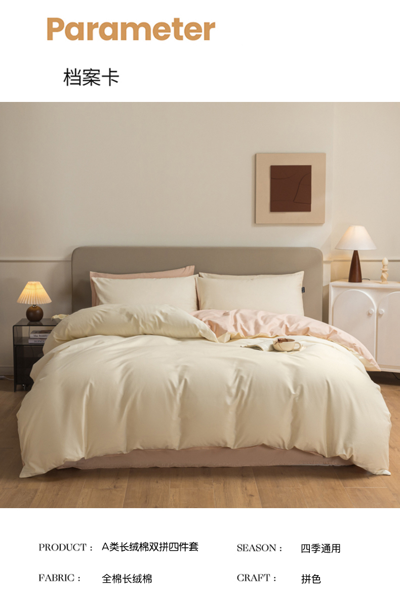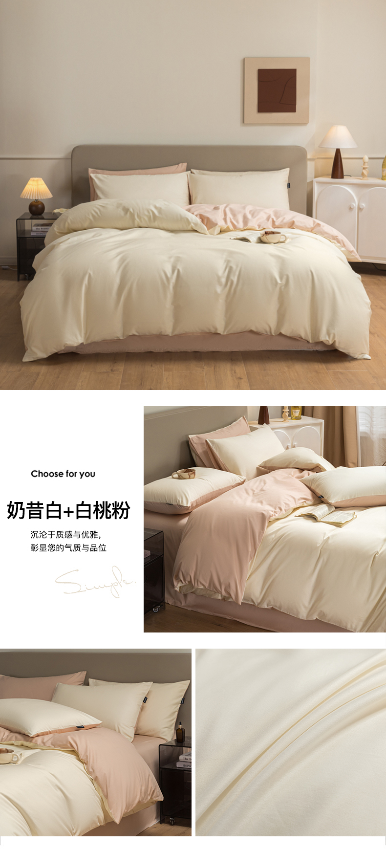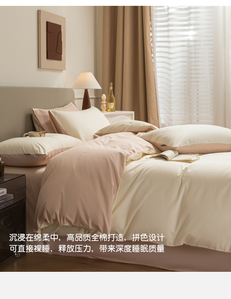 卧趣家纺 2025新品全棉A类长绒棉纯色双拼四件套 奶昔白+白桃粉