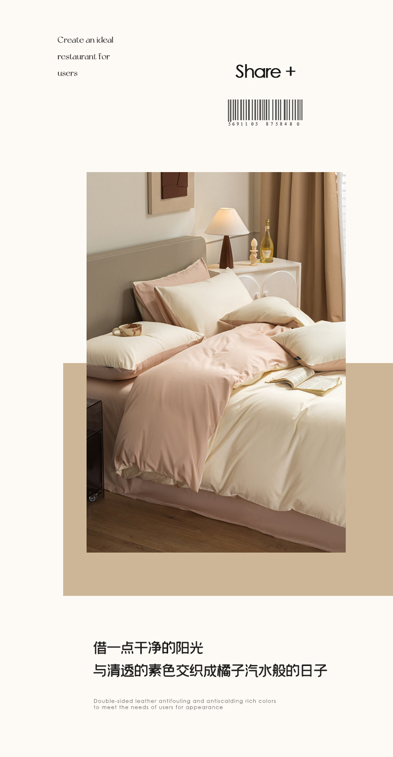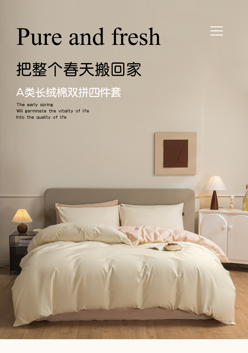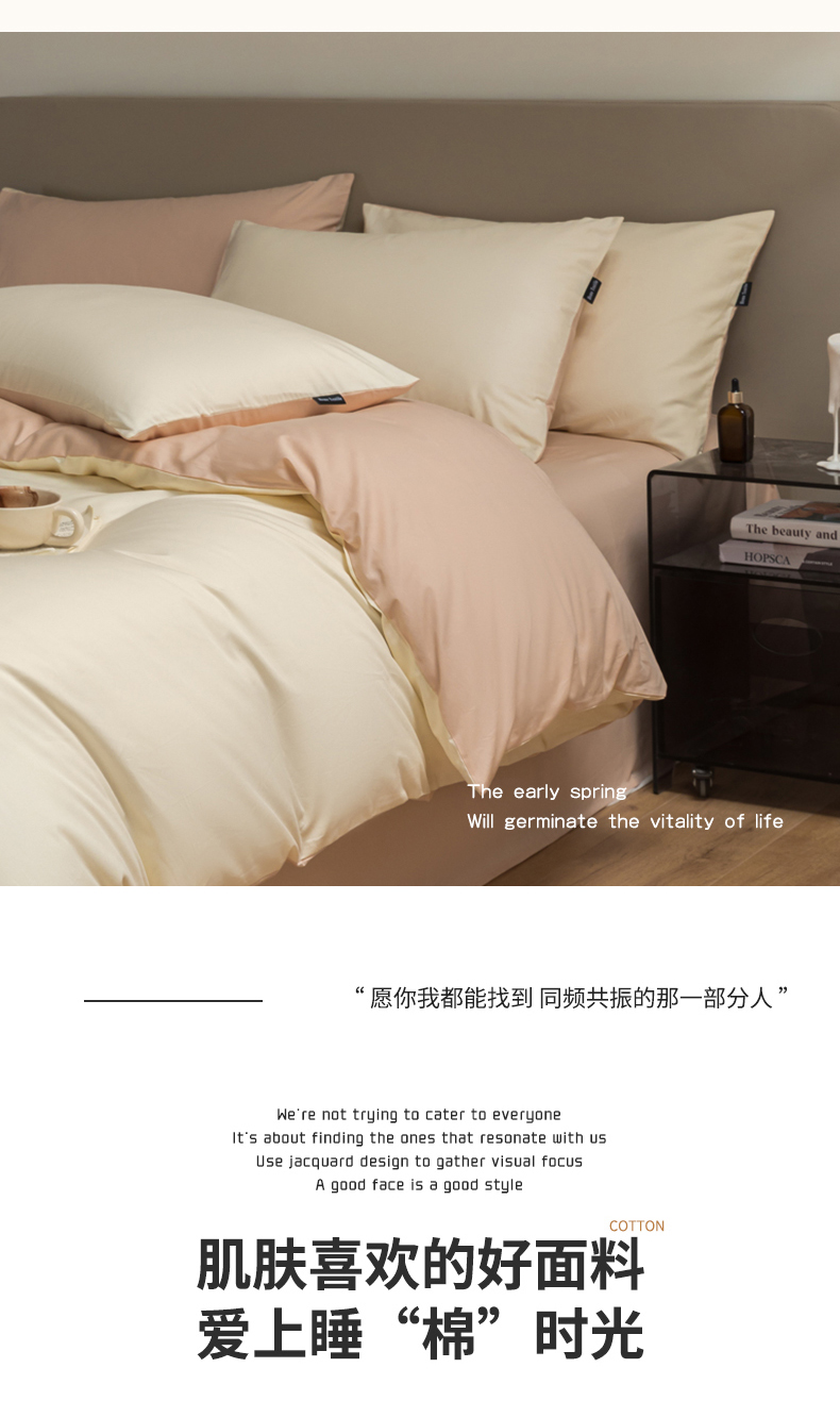 卧趣家纺 2025新品全棉A类长绒棉纯色双拼四件套 奶昔白+白桃粉
