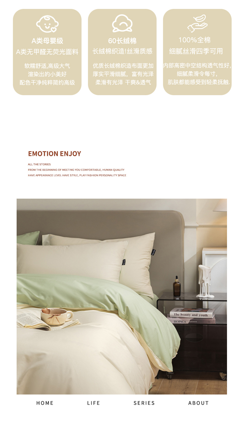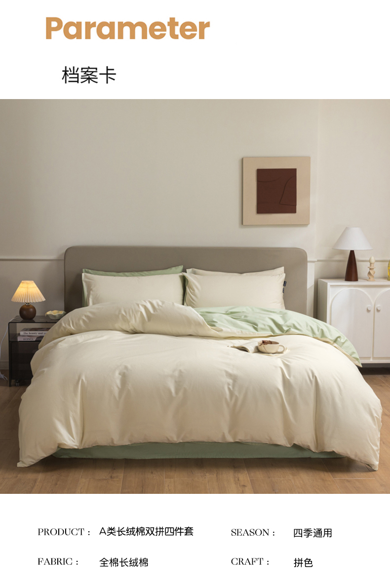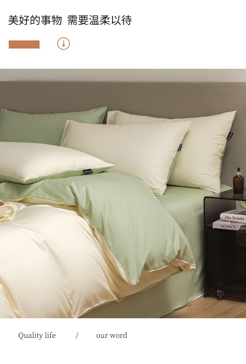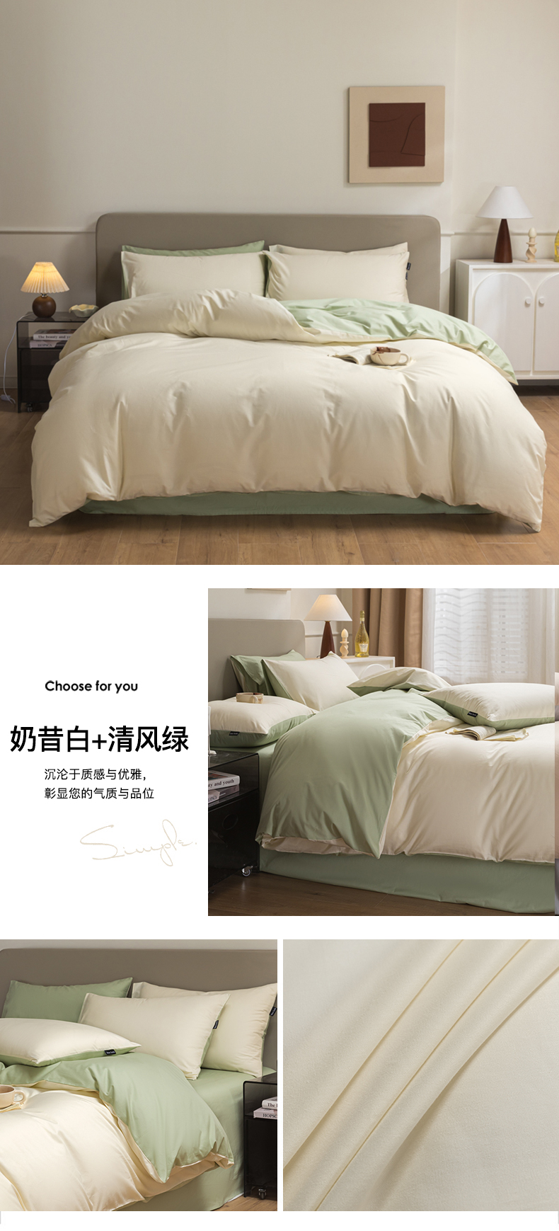 商品名称:卧趣家纺 2025新品全棉A类长绒棉纯色双拼四件套 奶昔白+清风绿