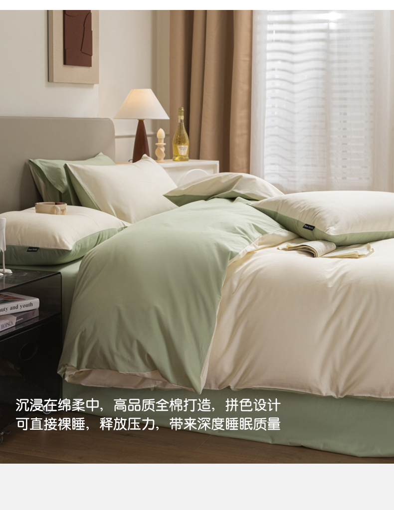 卧趣家纺 2025新品全棉A类长绒棉纯色双拼四件套 奶昔白+清风绿