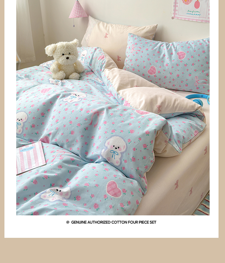 (总)曼之夏 2025新款全棉纯棉40支学生季卡通印花四件套,椰蓝小腊肠,茶茶狗,格子猫,嗨皮狗,开心屋,可爱多,可可汪,玛奇朵,奶昔小熊,泡芙小象,曲奇小狗,趣味熊,甜甜圈,甜心猫咪,童画,小狗日记,樱桃熊仔