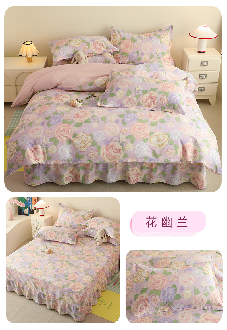 当前位置: 91家纺网 > 商品网购 > 床品套件 > 四件套 > 全棉普通四件套 > 八十八家纺 2025新款全棉12868床裙款四件套花幽兰