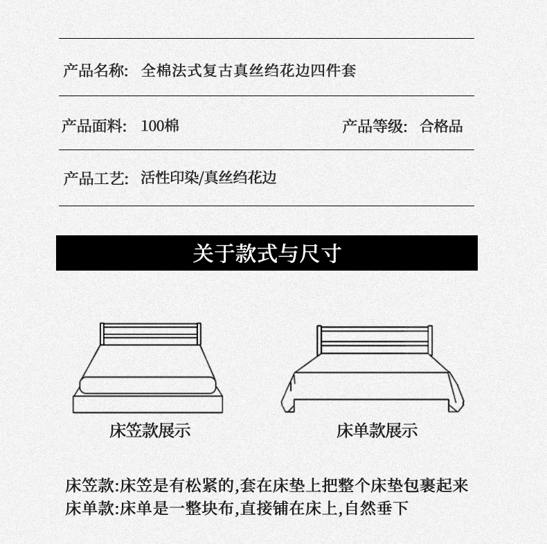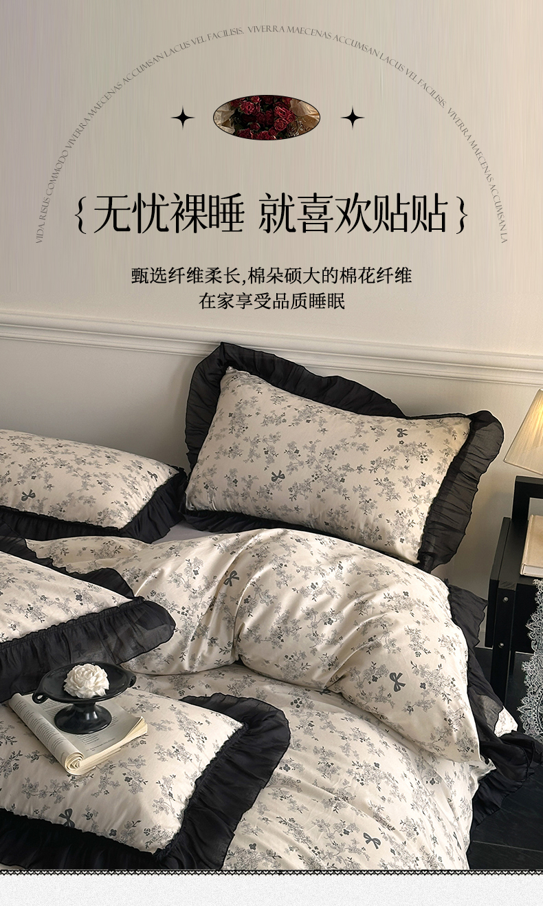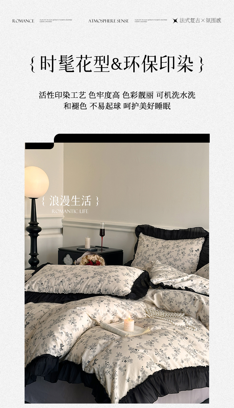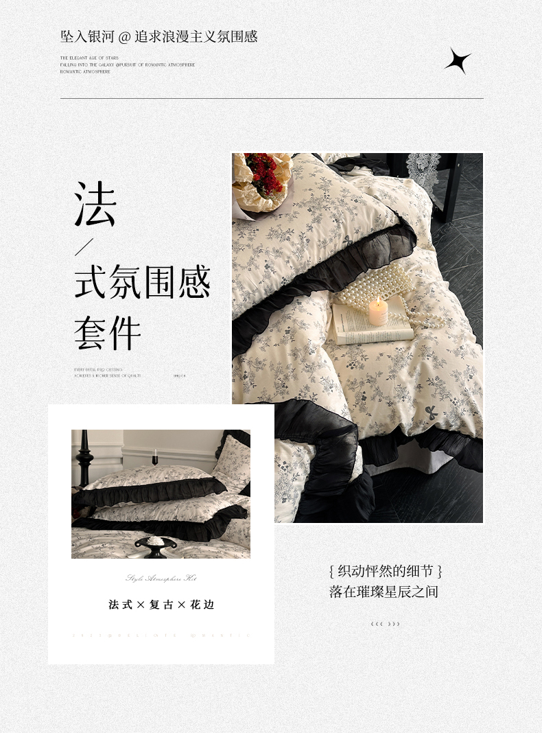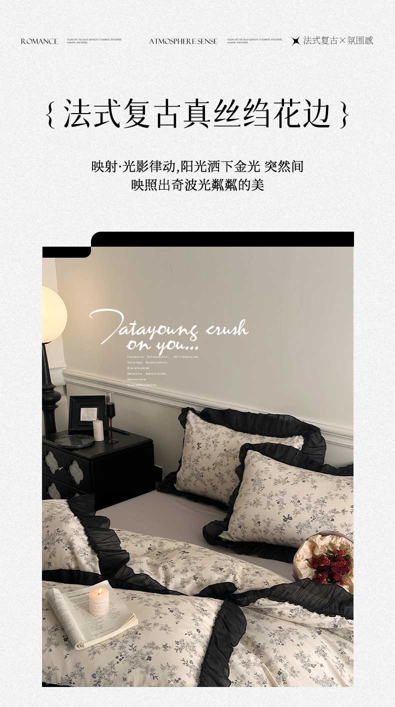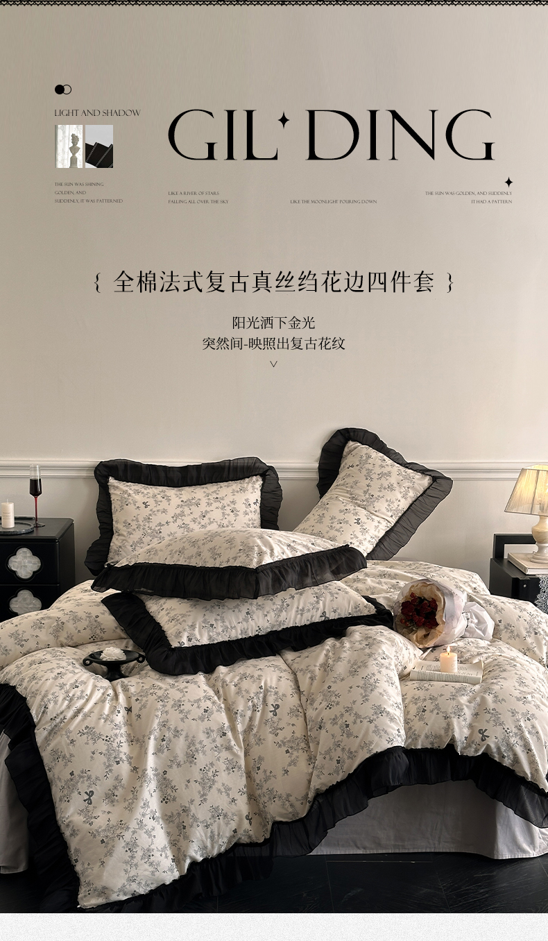 当前位置: 91家纺网 > 商品网购 > 床品套件 > 四件套 > 全棉普通四件套 > 蓝邻家纺 2025年新款全棉法式复古真丝绉花边四件套系列 忘忧