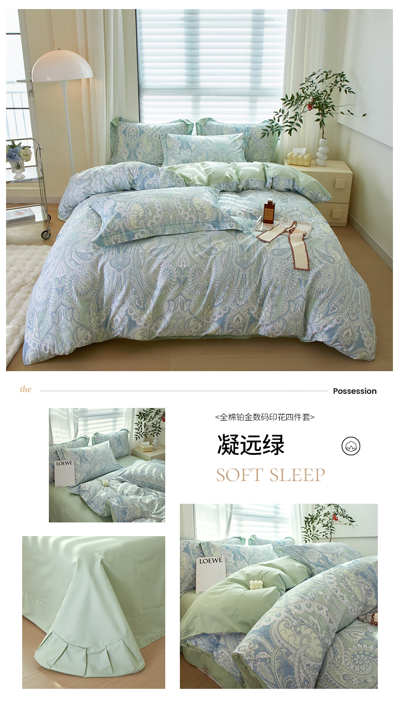 商品名称:启航家居 2025春夏全棉铂金棉数码印花四件套 凝远绿