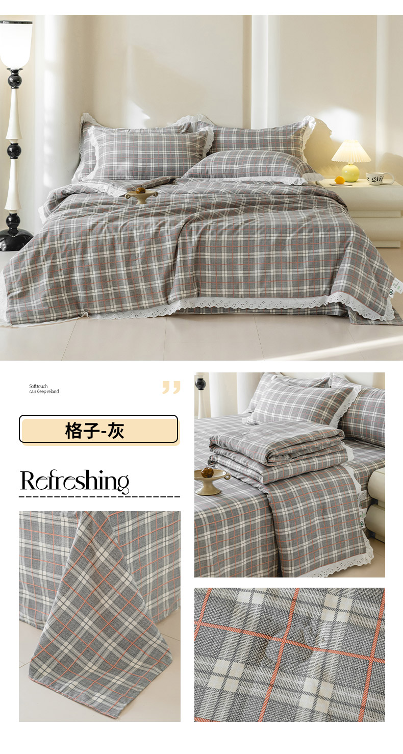 • 91家纺网 家纺一手货源 找家纺 绒世界 绒世界 2025新款双层纱韩版印花夏被四件套 格子-灰