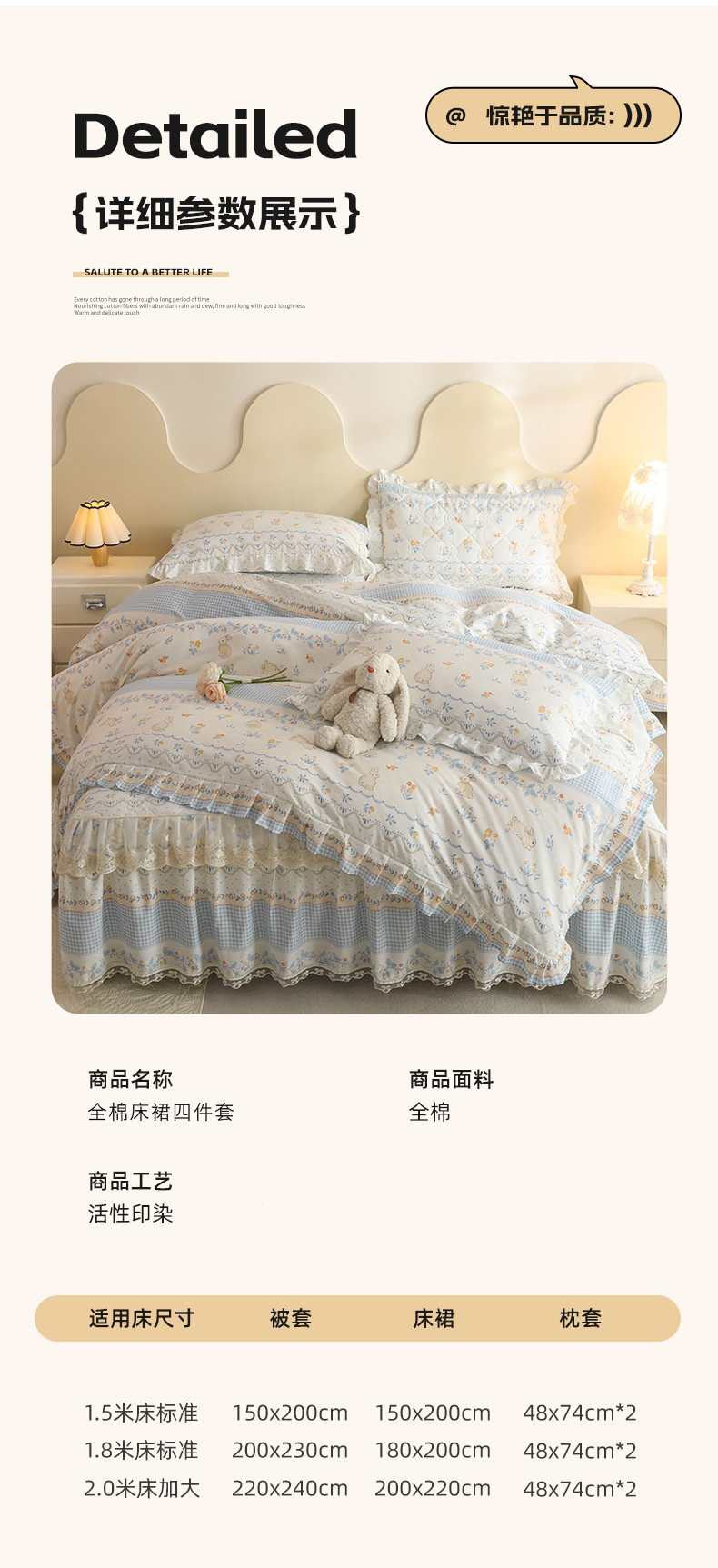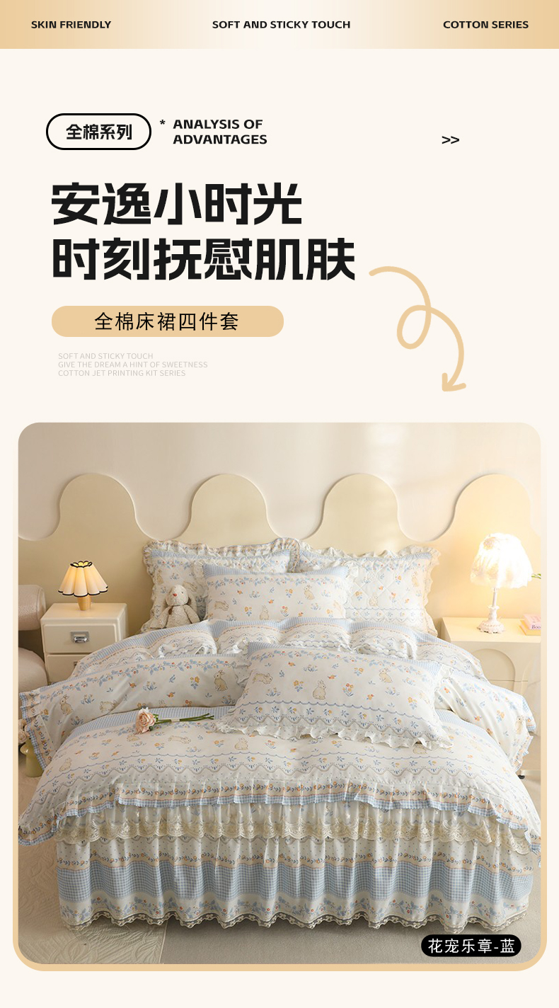 (总)美达家纺 2025新款全棉纯棉AB版蕾丝小花边单层床裙四件套,解语花,南湘,沁雨花叶,悦棠