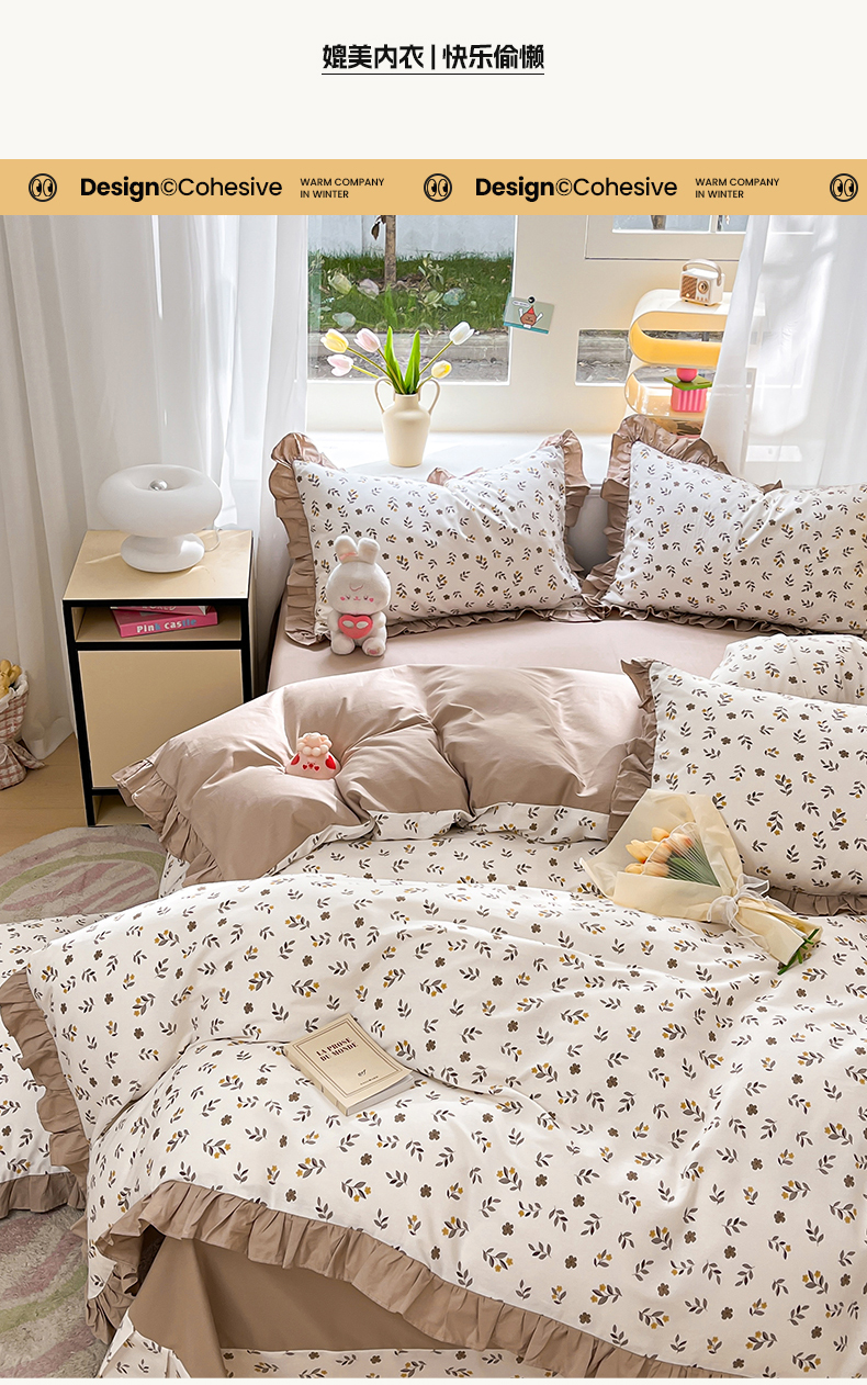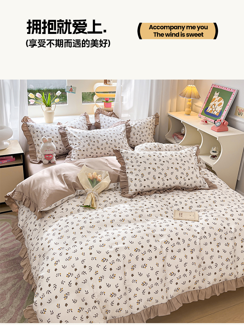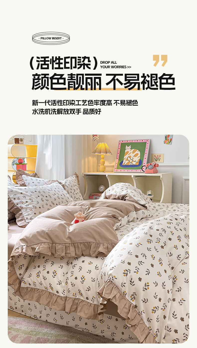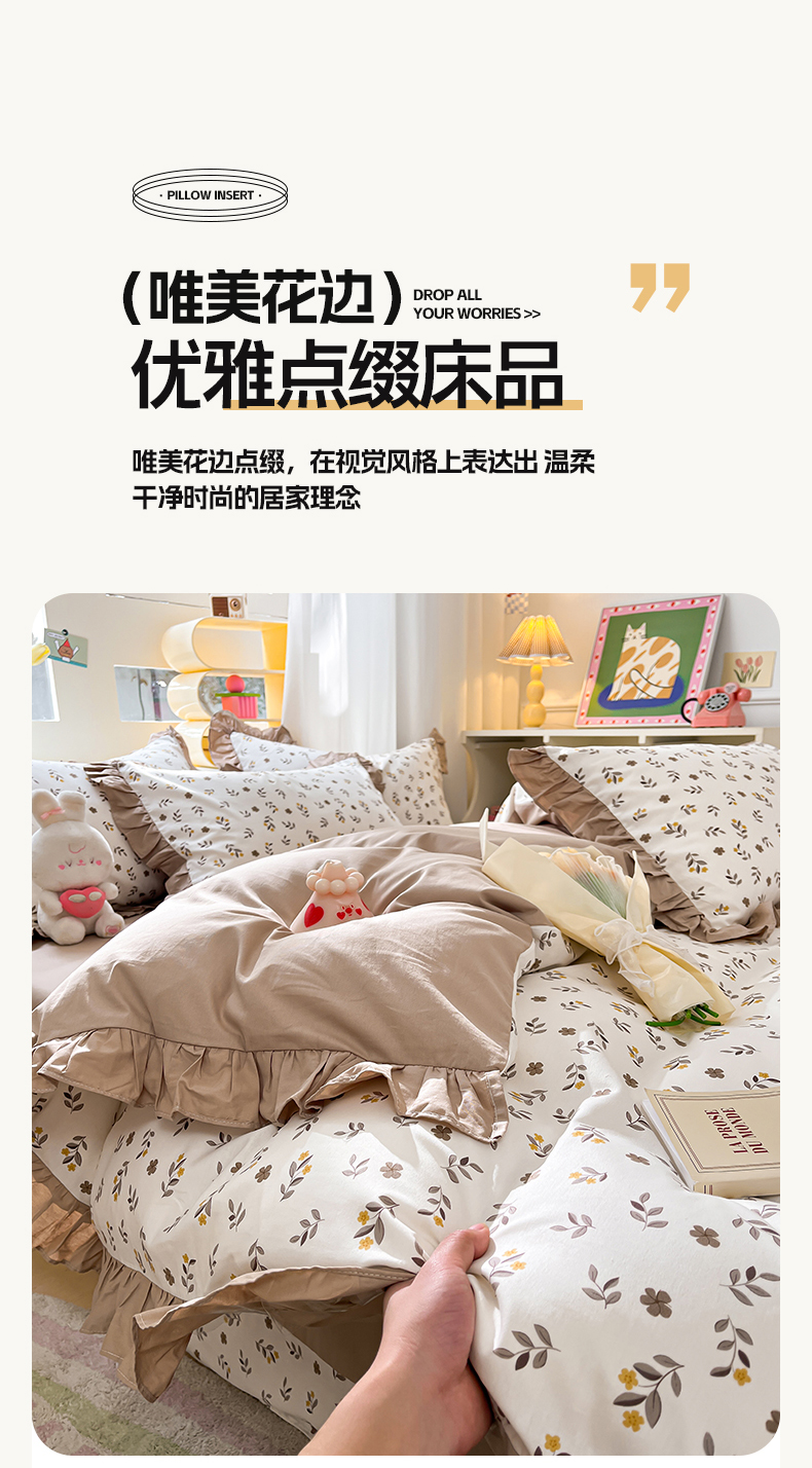 商品名称:美洲琳 2025新款40支13372全棉韩版公主风花边四件套 七彩梦-咖