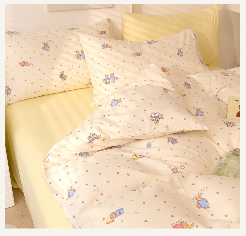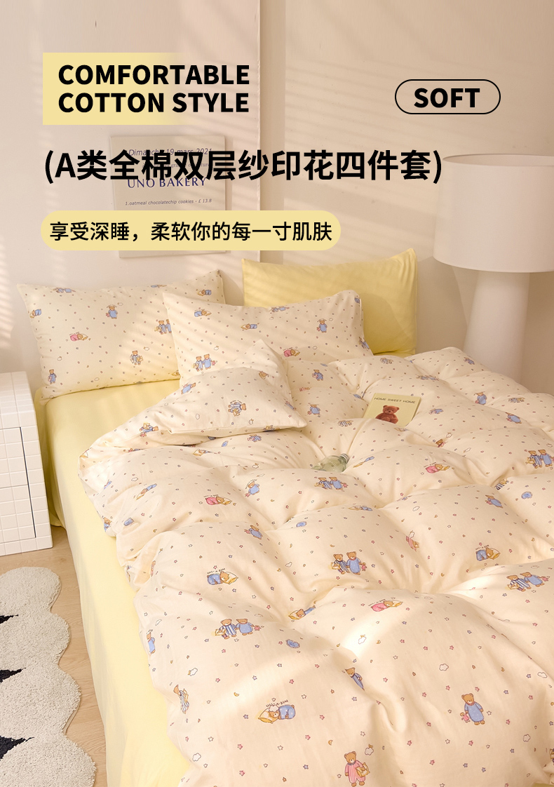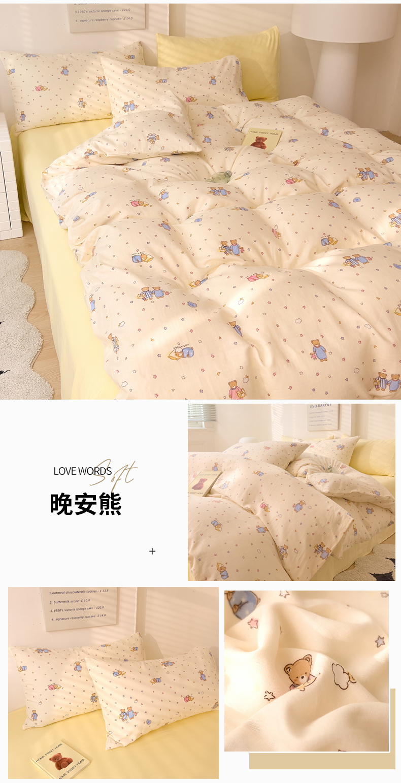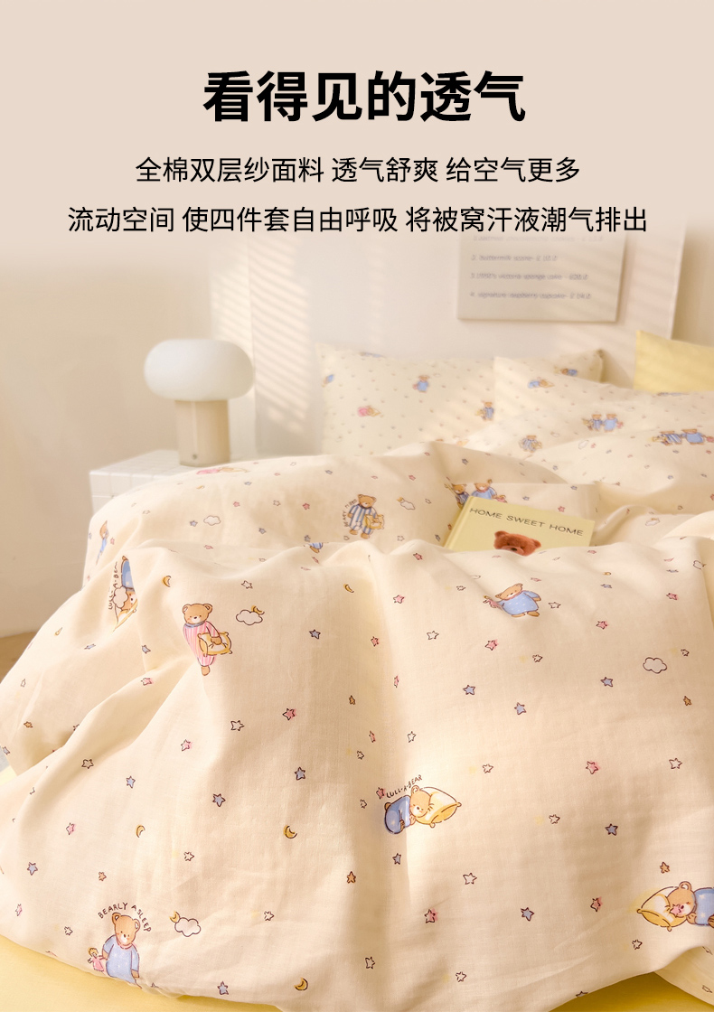 当前位置: 91家纺网 > 商品网购 > 床品套件 > 四件套 > 全棉普通四件套 > DoDo 兜兜 2025新款全棉双层纱印花四件套(可定做尺寸) 晚安熊