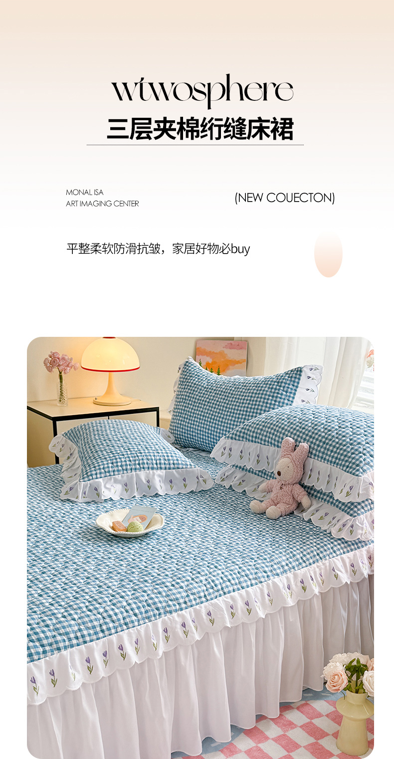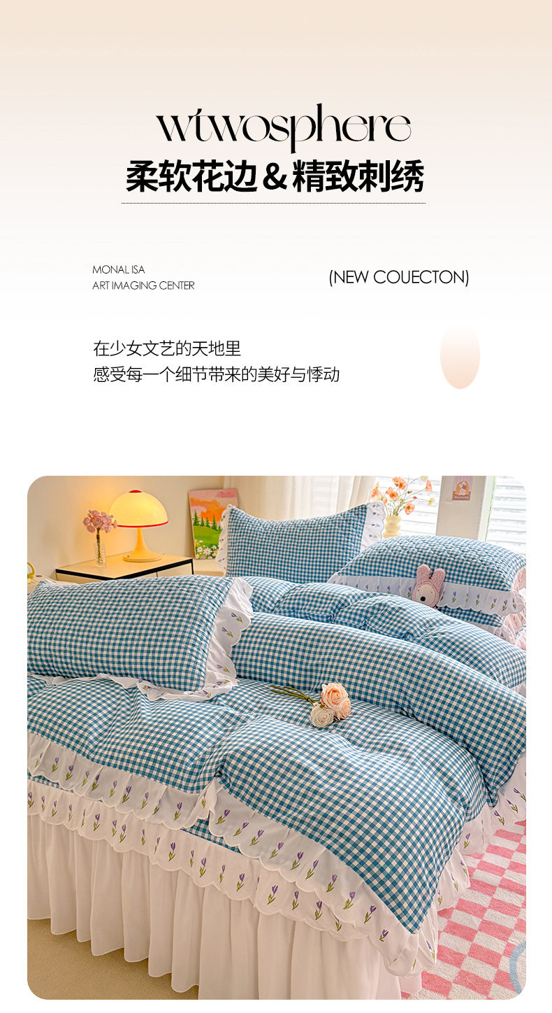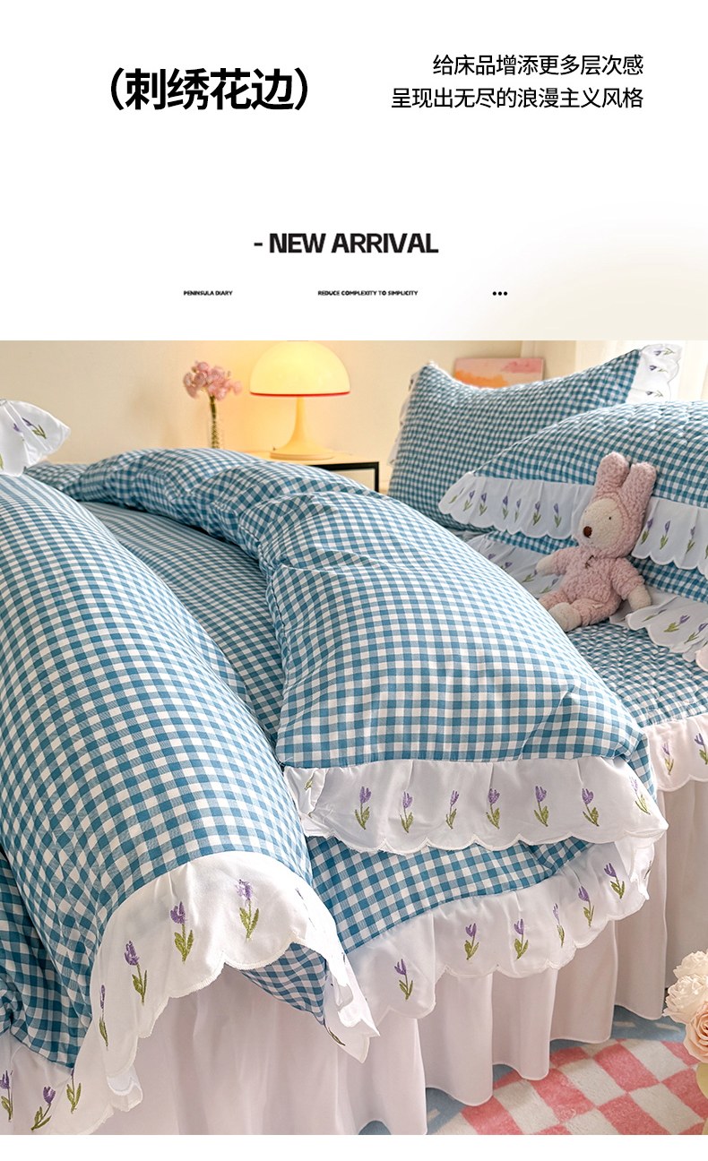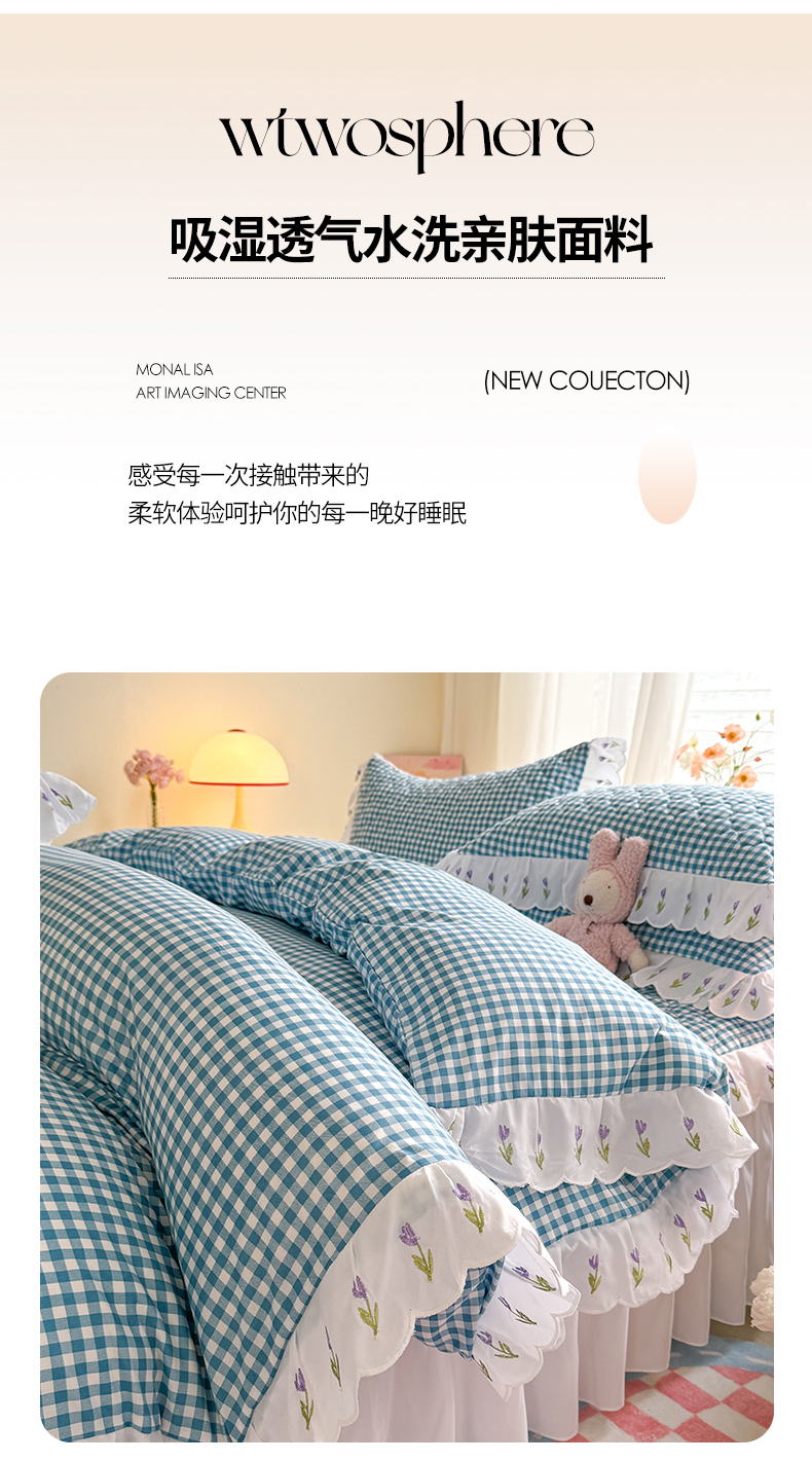 金盛皇朝家纺 2025新款格子空间水洗棉床裙 格子空间-爱丽丝蓝