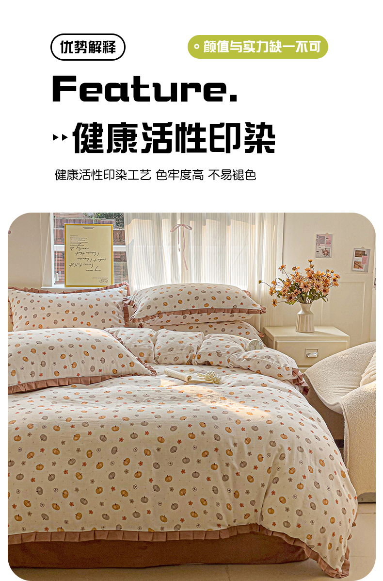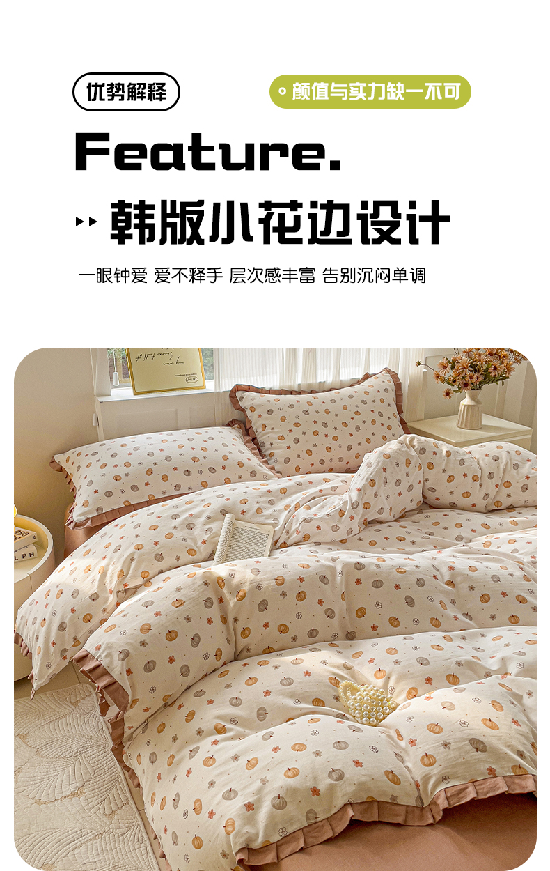 商品名称:忆生活家纺 2025新款全棉韩版双层纱花边款四件套 奶油南瓜