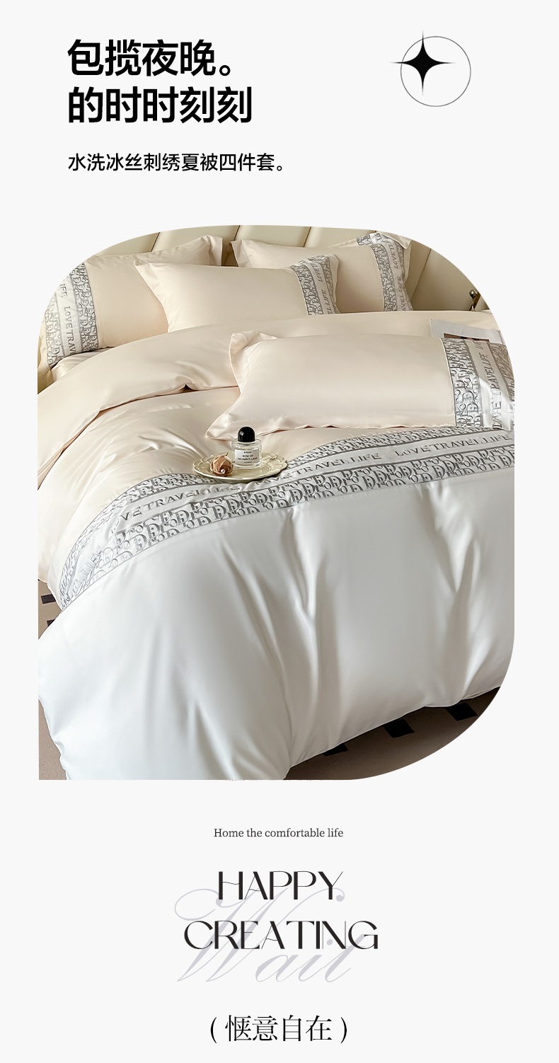 yyds网供 2025新款礼盒装水洗冰丝拼接刺绣法式奢四件套AB版双拼春夏[礼盒装,会员-5] 绣花拼接-奶昔白