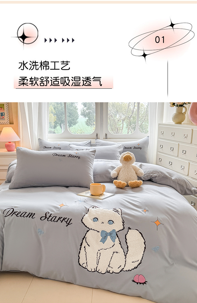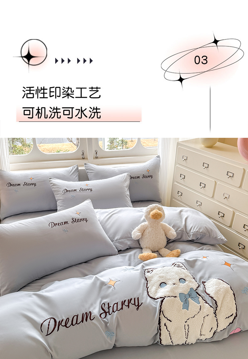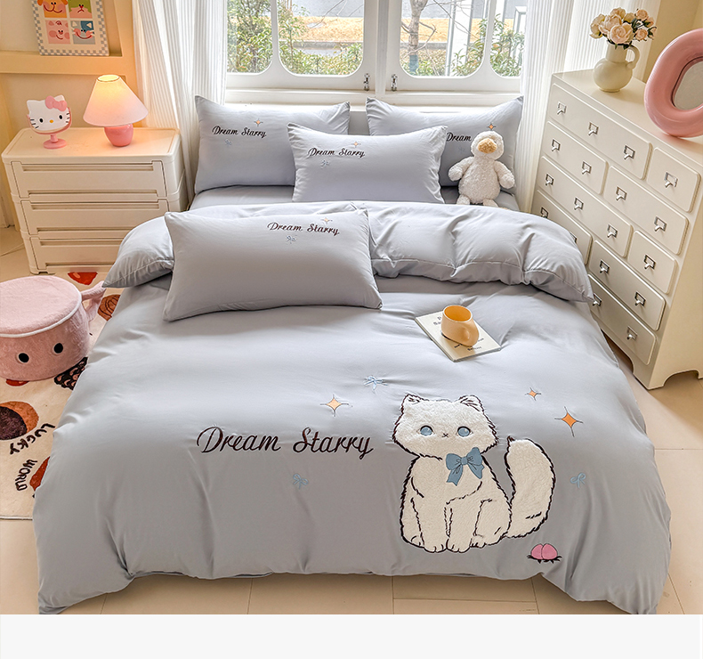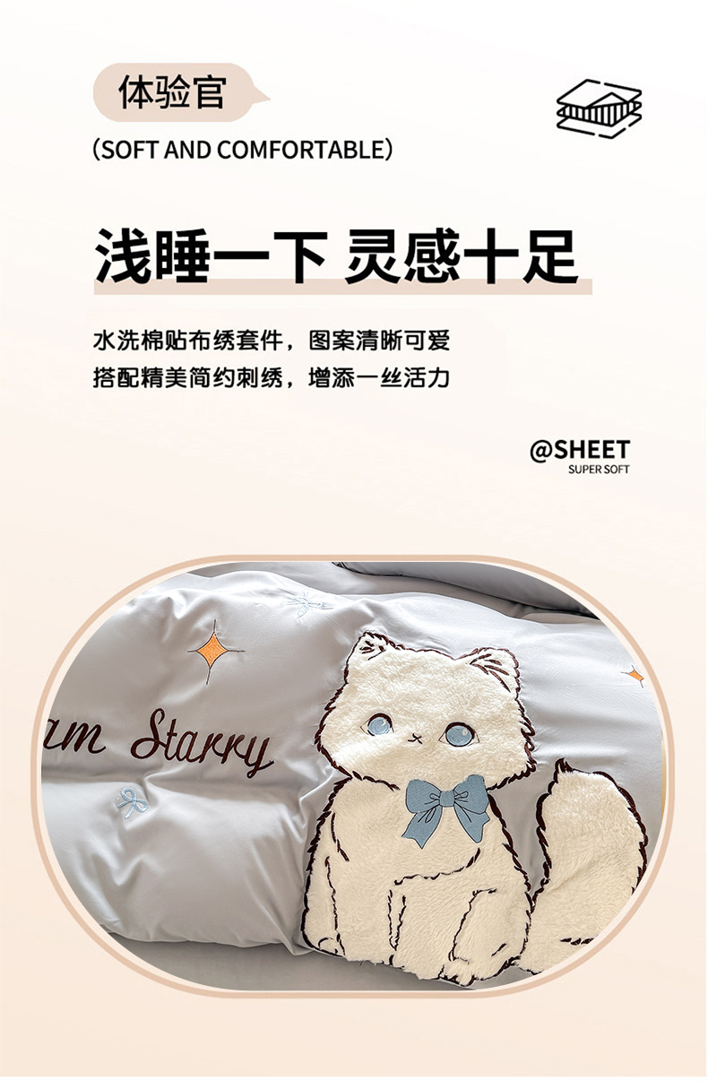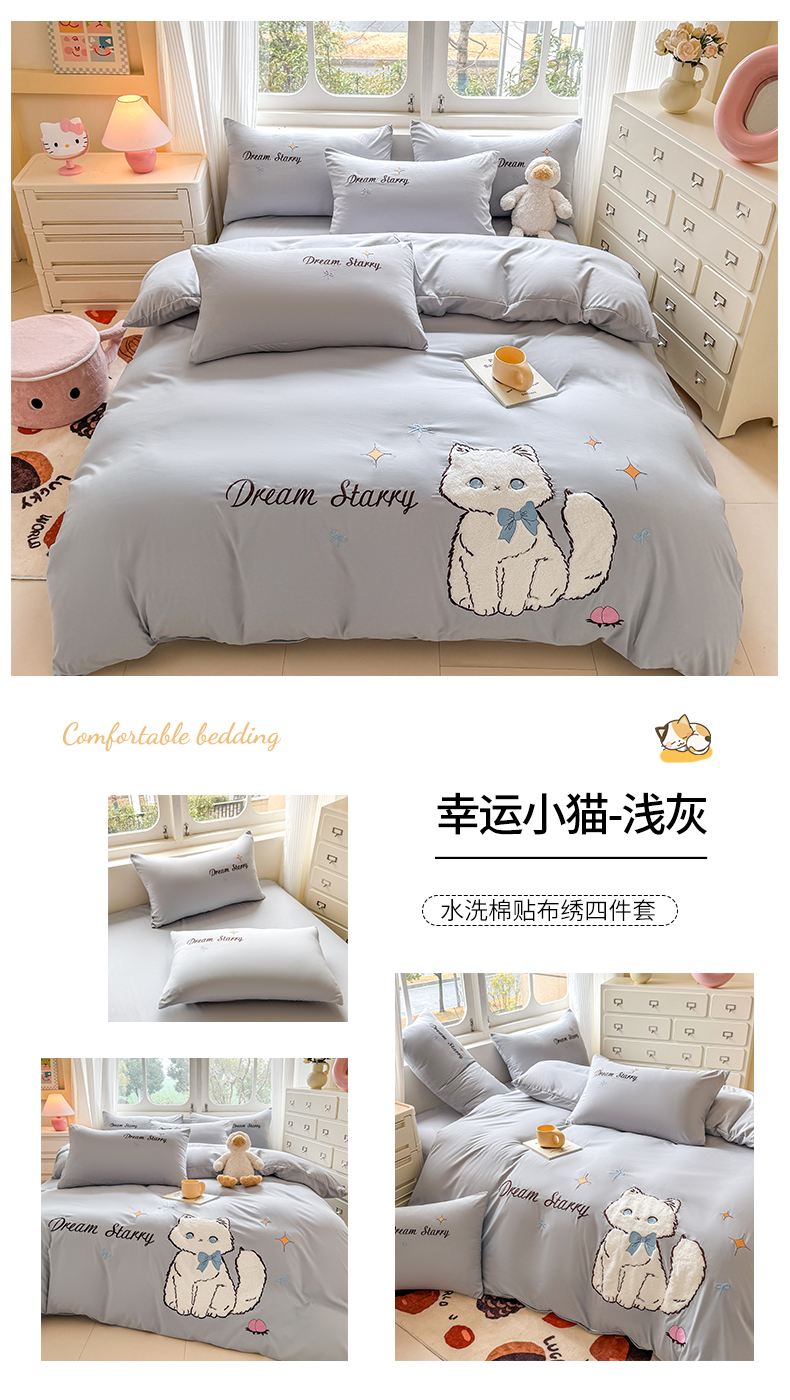 当前位置: 91家纺网 > 商品网购 > 床品套件 > 四件套 > 水洗棉四件套 > 凯美 2025新款超柔水洗棉卡通贴布绣四件套 幸运小猫-浅灰