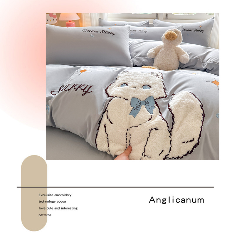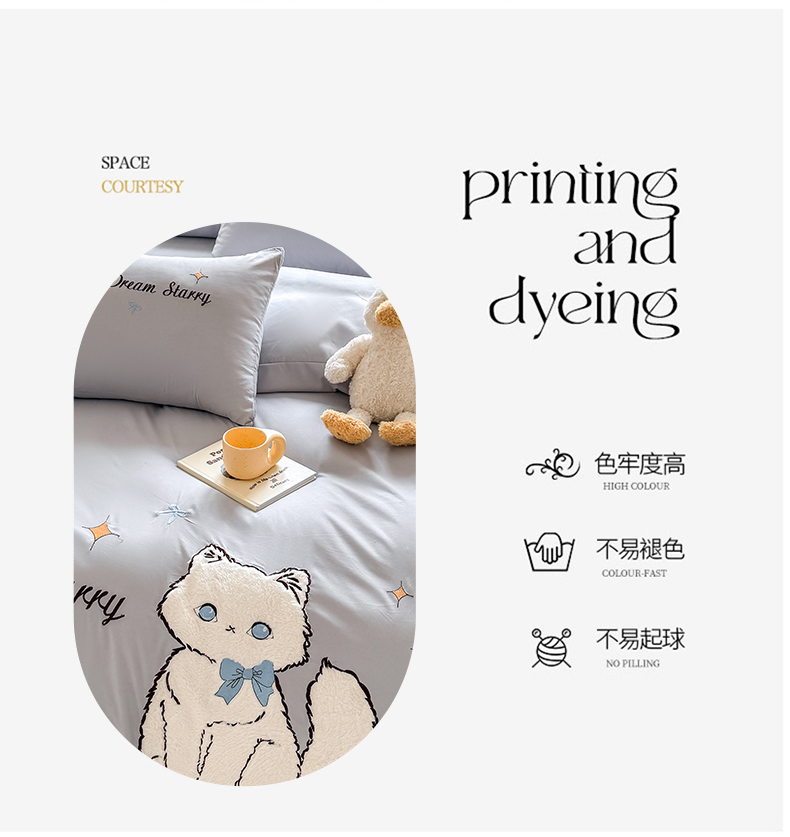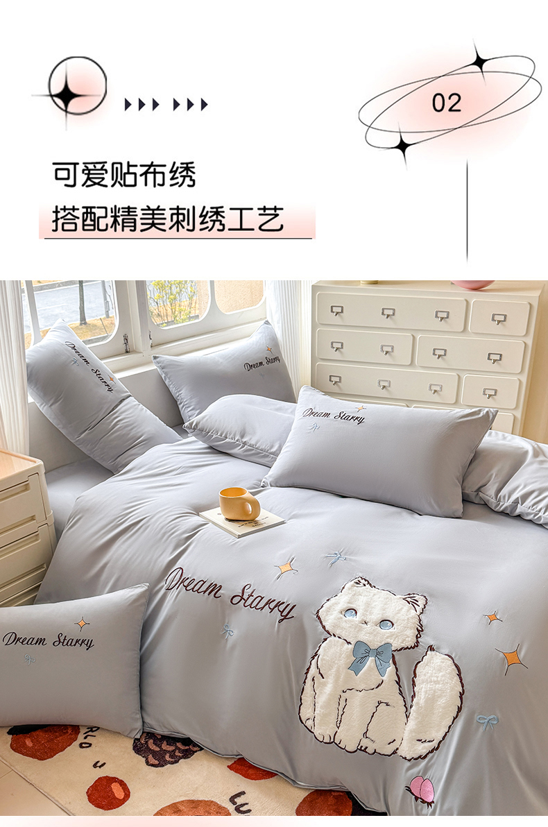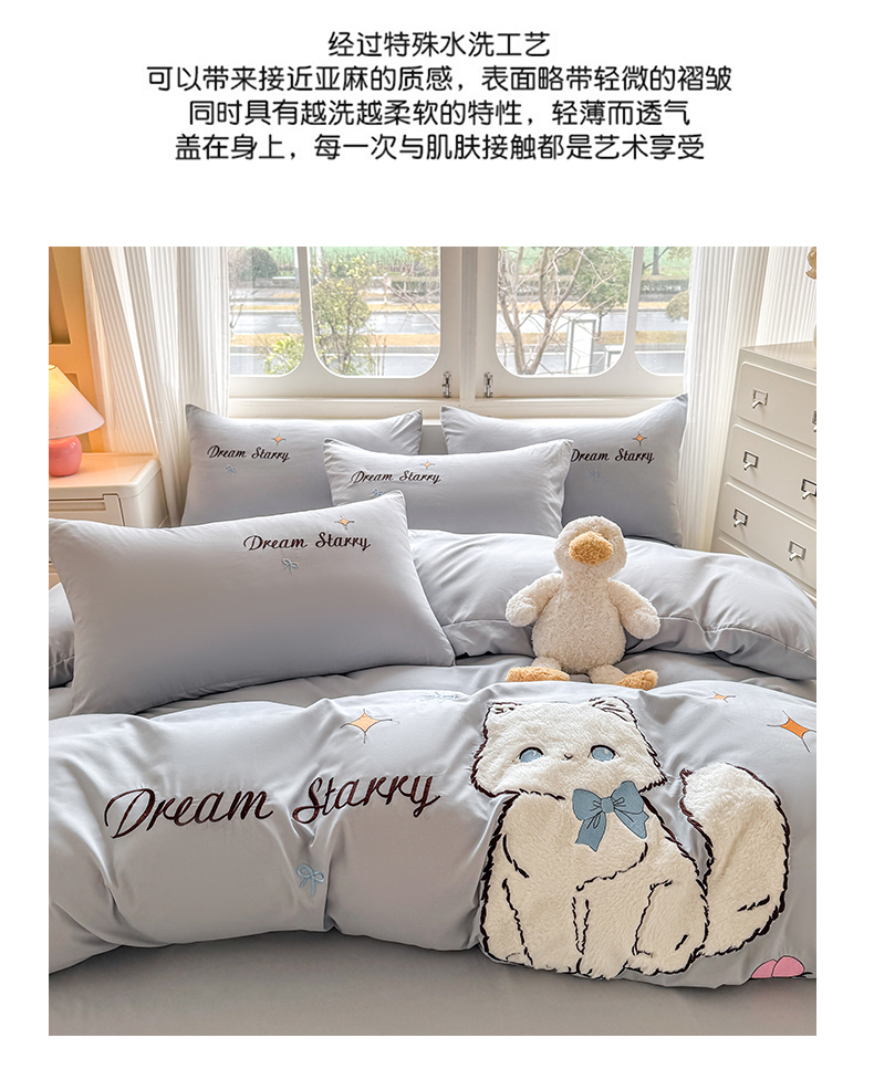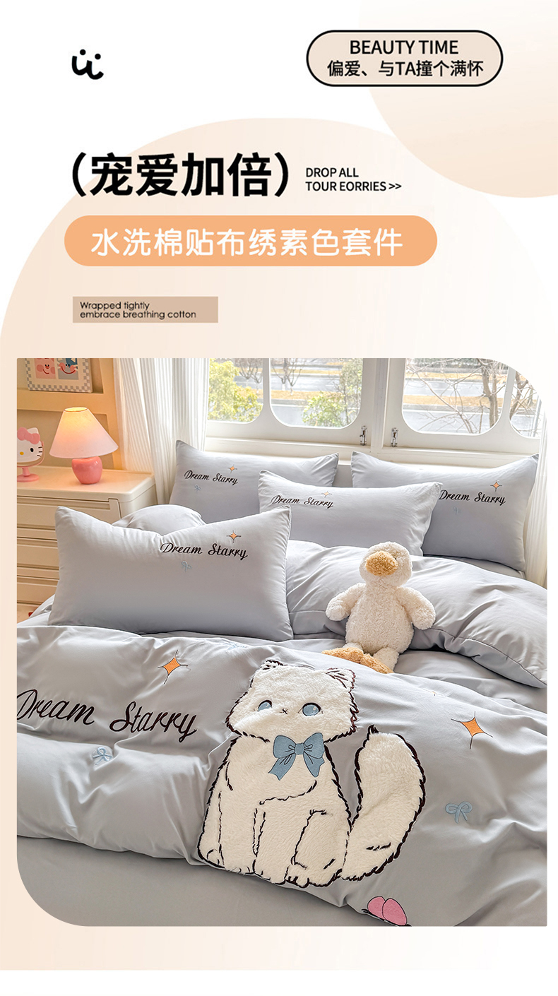 当前位置: 91家纺网 > 商品网购 > 床品套件 > 四件套 > 水洗棉四件套 > 凯美 2025新款超柔水洗棉卡通贴布绣四件套 幸运小猫-浅灰