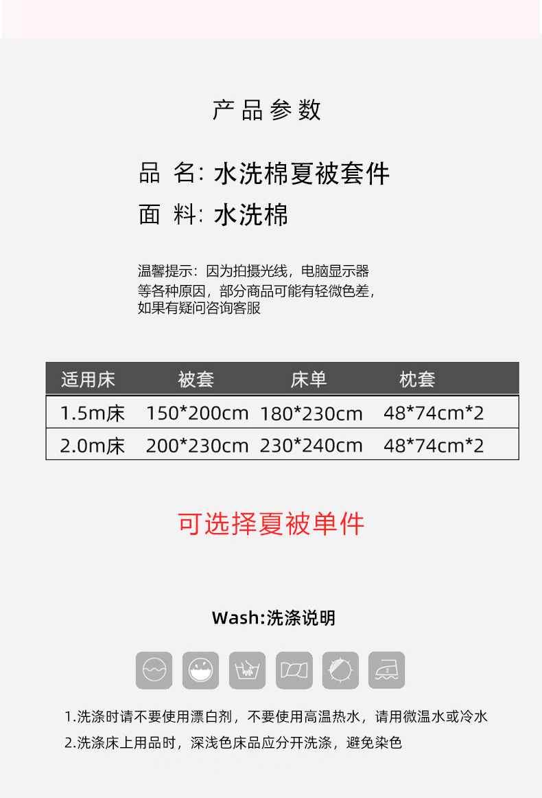 1.5米夏被三件套:夏被1.5*2.0米 床单 1.8*2.3米 枕套47*74*1