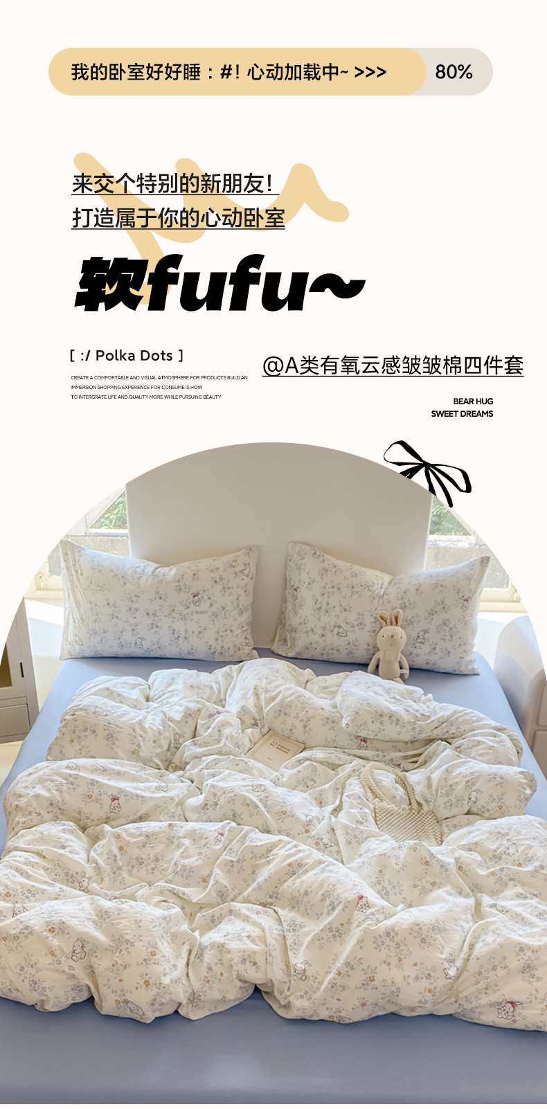 (总)【提供买家秀】2025直播云感皱皱棉四件套水洗棉简约风小碎花被套床笠三件套-叠拍图,一帘幽梦,波点白,蛋糕熊,繁花兔,繁华,馥芮白,馥芮蓝,好事橙双,玫瑰庄园,叛逃小狗,蜻蜓点水,同心结,童话森林,小桃糯糯,幸运狗,组合