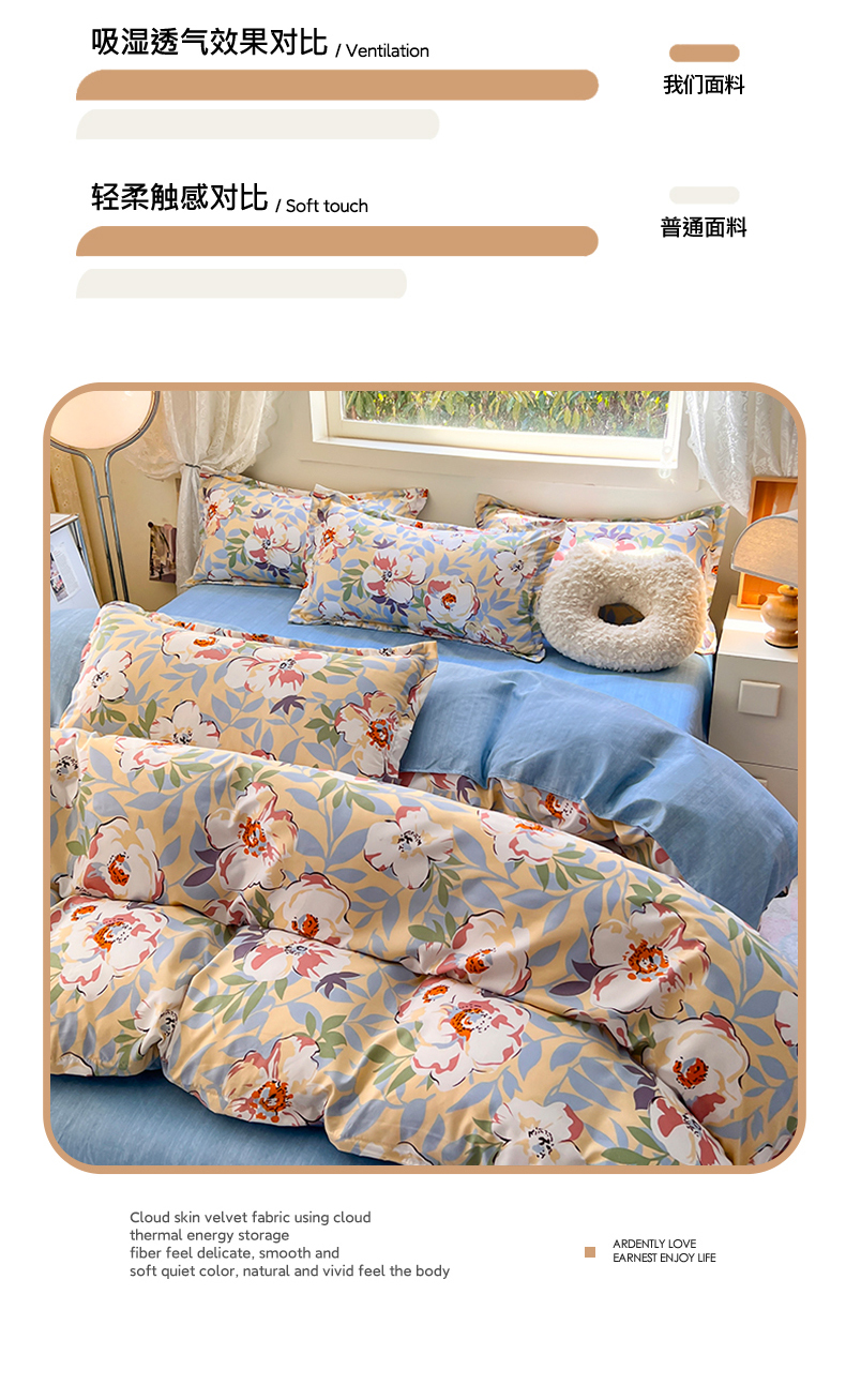(总)曼璐家纺 2025新款小清新芦荟棉印花四件套,朝花夕拾,初夏,可可西里,喵星人,叶雨,初夏