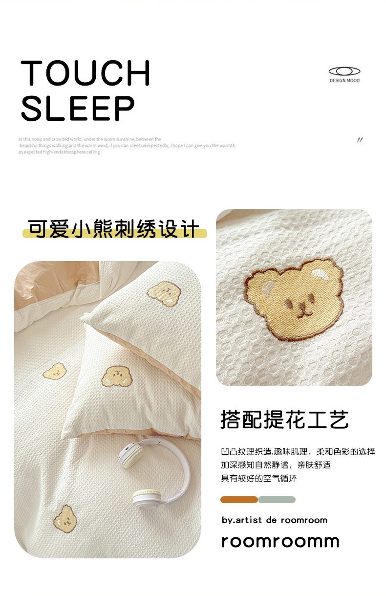 (总)静家居 2025新款全棉纯棉华夫格北欧小熊刺绣四件套系列-风格二