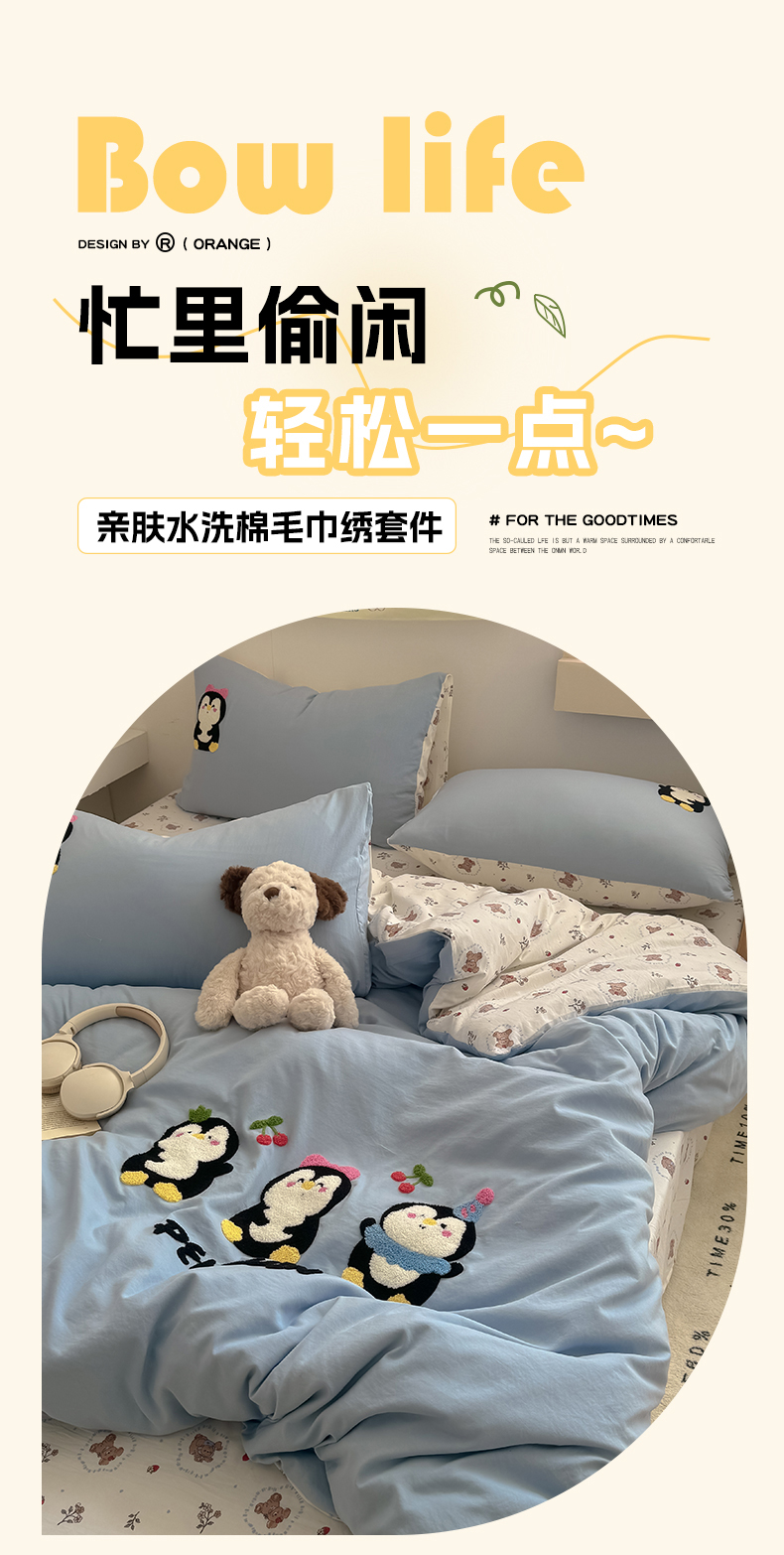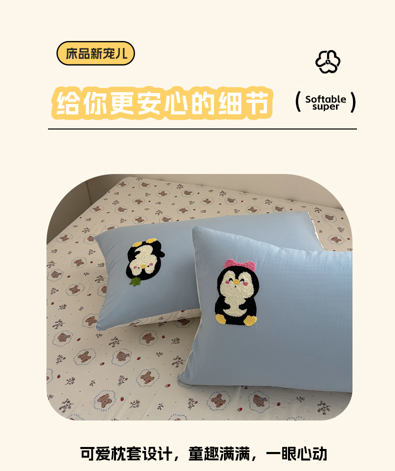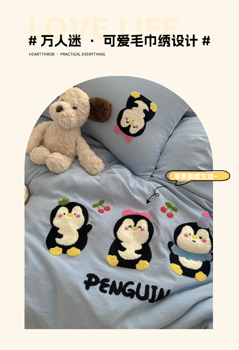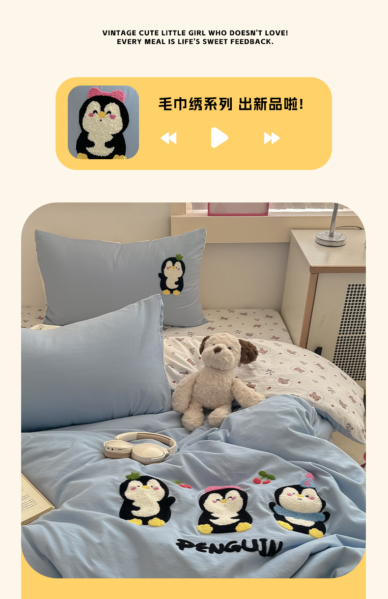当前位置: 91家纺网 > 商品网购 > 床品套件 > 四件套 > 水洗棉四件套 > 沃朴家居 2025春夏新款亲肤水洗棉毛巾绣四件套 企鹅派对