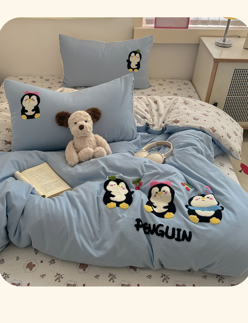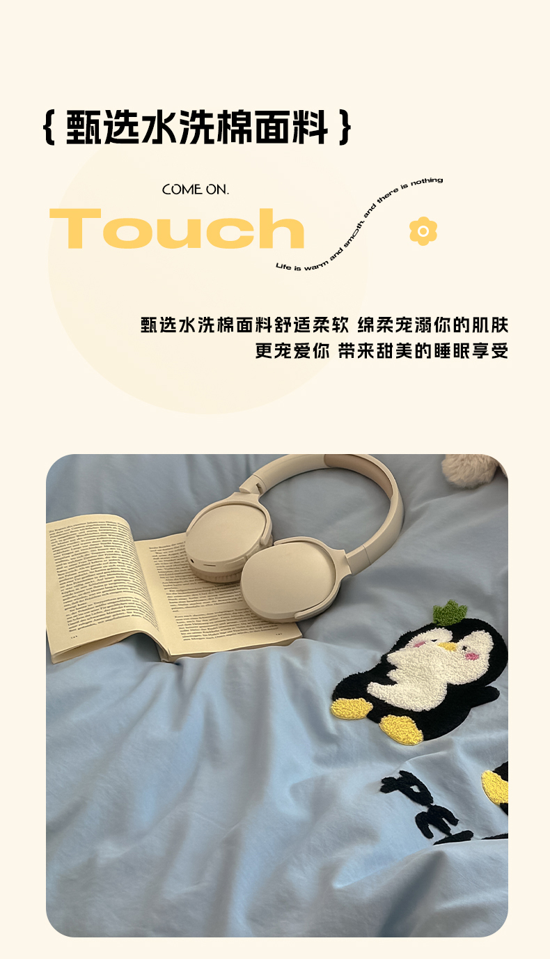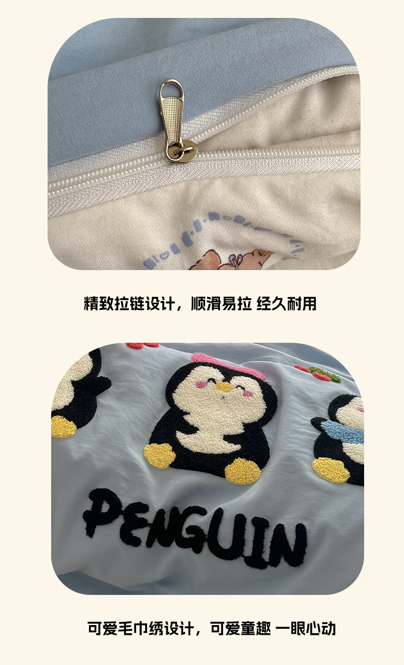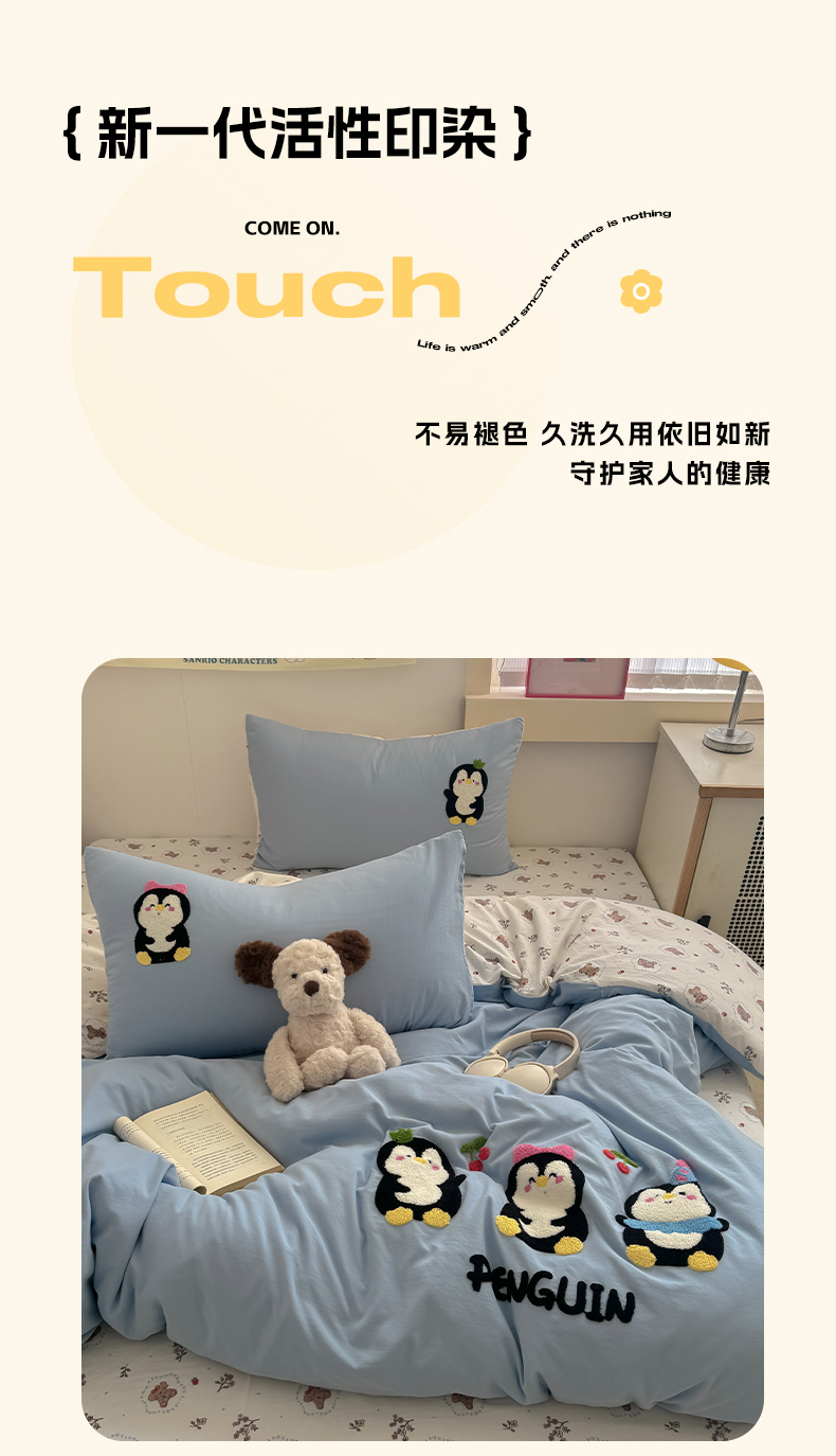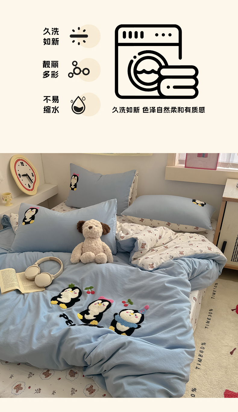 当前位置: 91家纺网 > 商品网购 > 床品套件 > 四件套 > 水洗棉四件套 > 沃朴家居 2025春夏新款亲肤水洗棉毛巾绣四件套 企鹅派对