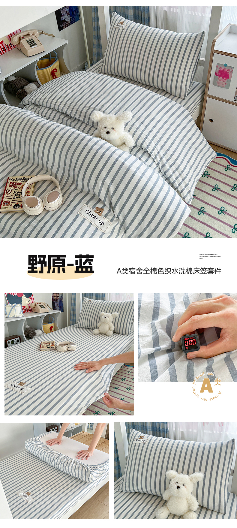 佳笠家居 2025新款kimi熊系列A类宿舍全棉纯棉色织水洗棉学生三件套 野原-蓝