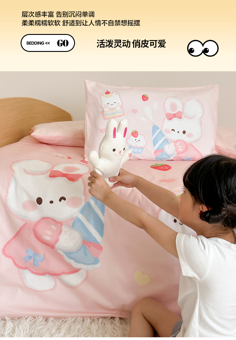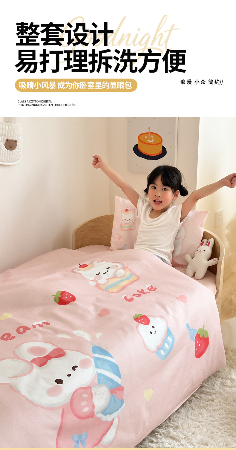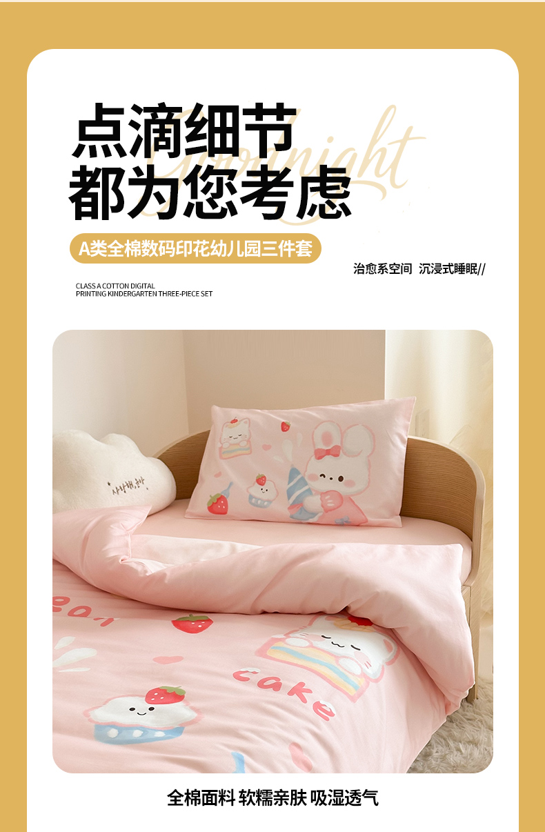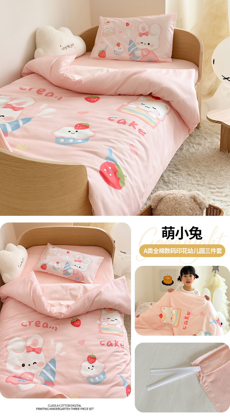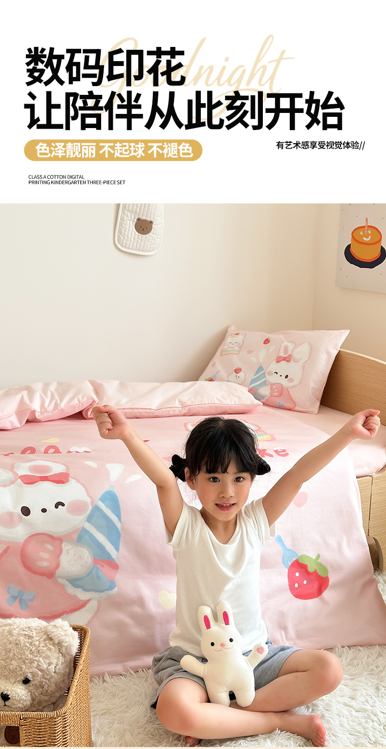 当前位置: 91家纺网 > 商品网购 > 床品套件 > 四件套 > 全棉普通四件套 > 嗨生活 2025新款A类全棉纯棉40s数码印花原创大版卡通幼儿园套件 幼儿园三件套 萌小兔