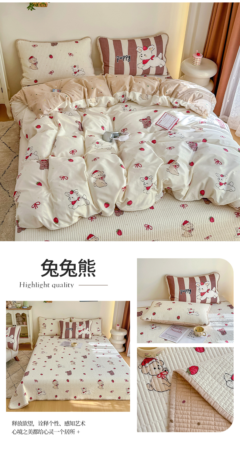 (总)橙子家居 2025新款双面全棉纯棉砂洗夹棉床盖三件套,粉木马,腊肠狗,梦露花园,苹果趣事,甜心南瓜,小熊贝蒂,樱桃派,组合图仅供展示,格子小熊,赫本,莫娇-黄,沁花-绿,薇恋时光,雾里花-粉,雅清