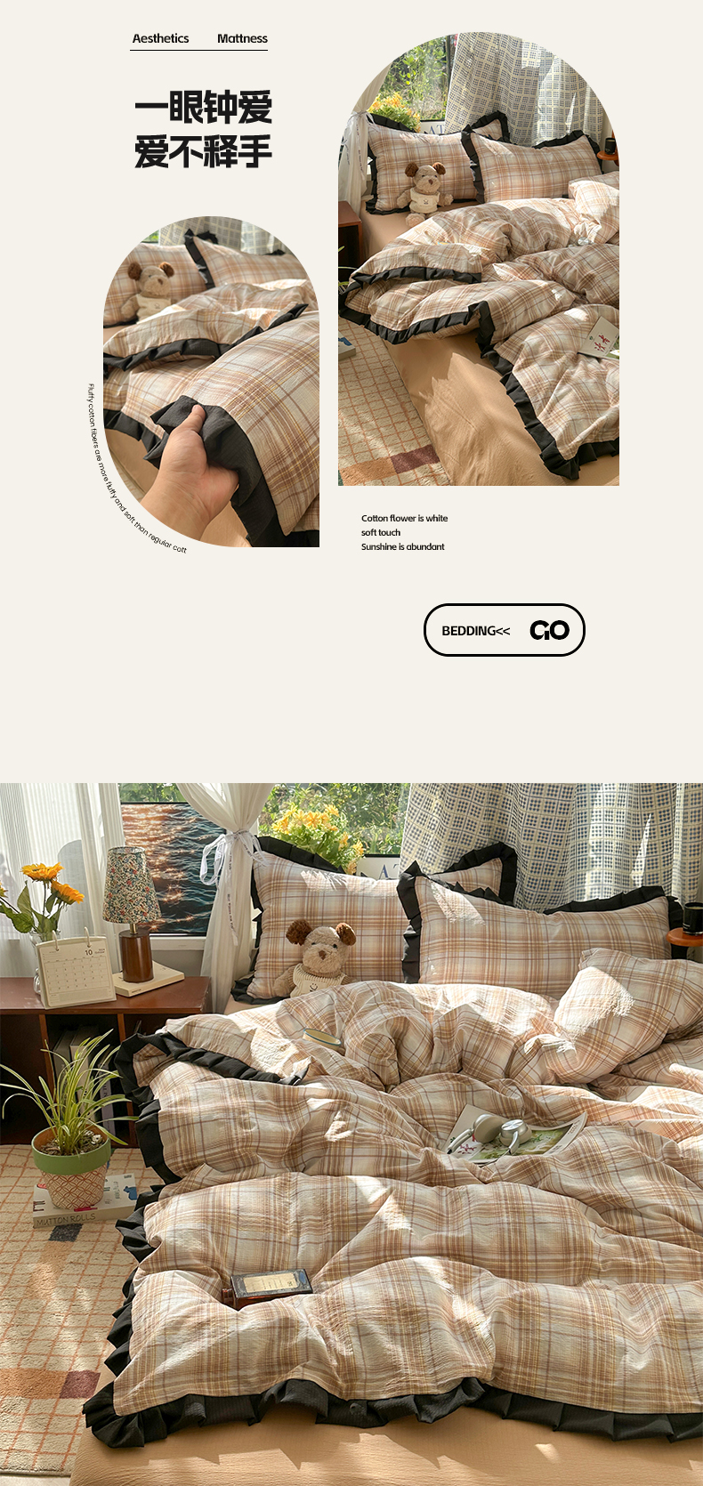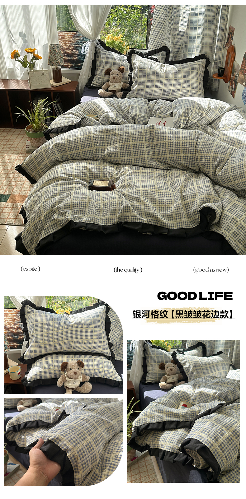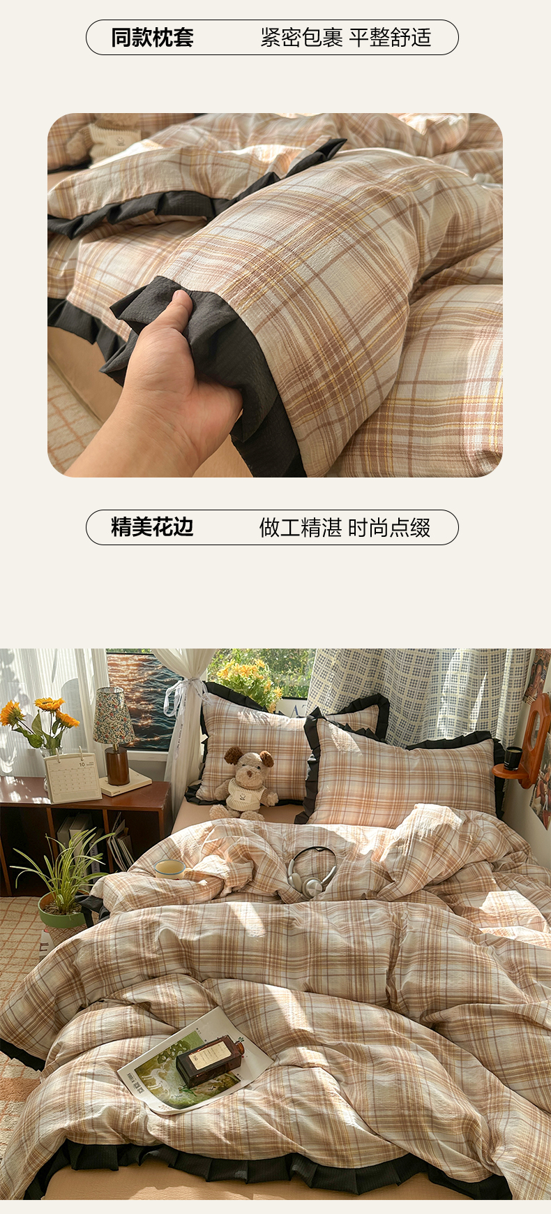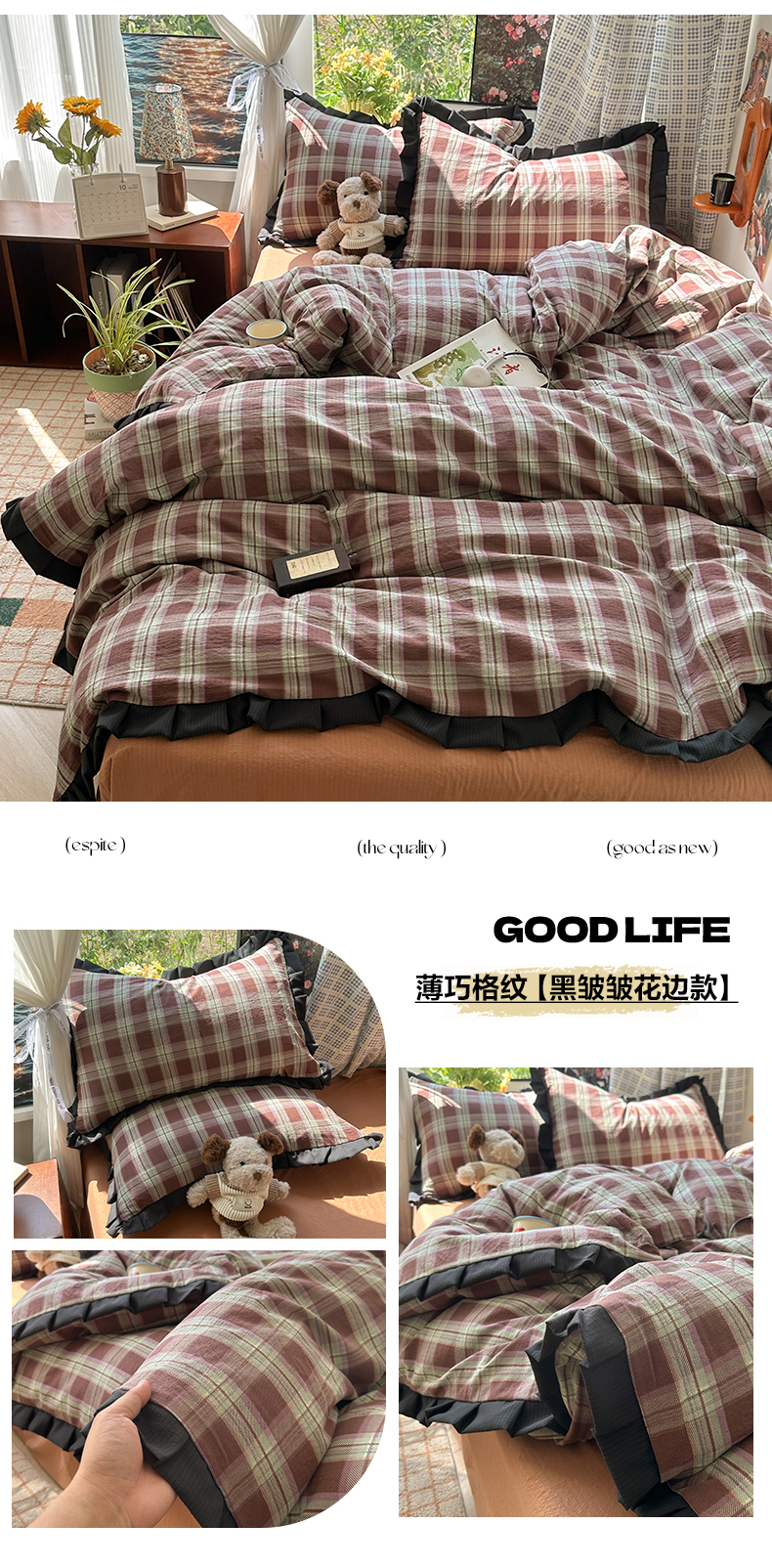 当前位置: 91家纺网 > 商品网购 > 床品套件 > 四件套 > 其它四件套 > 韩巢家纺 2025新款双层纱经典复古风格子被套四件套直播热销款学生宿舍寝室床单三件套 鹿灵格纹【黑皱皱花边款】