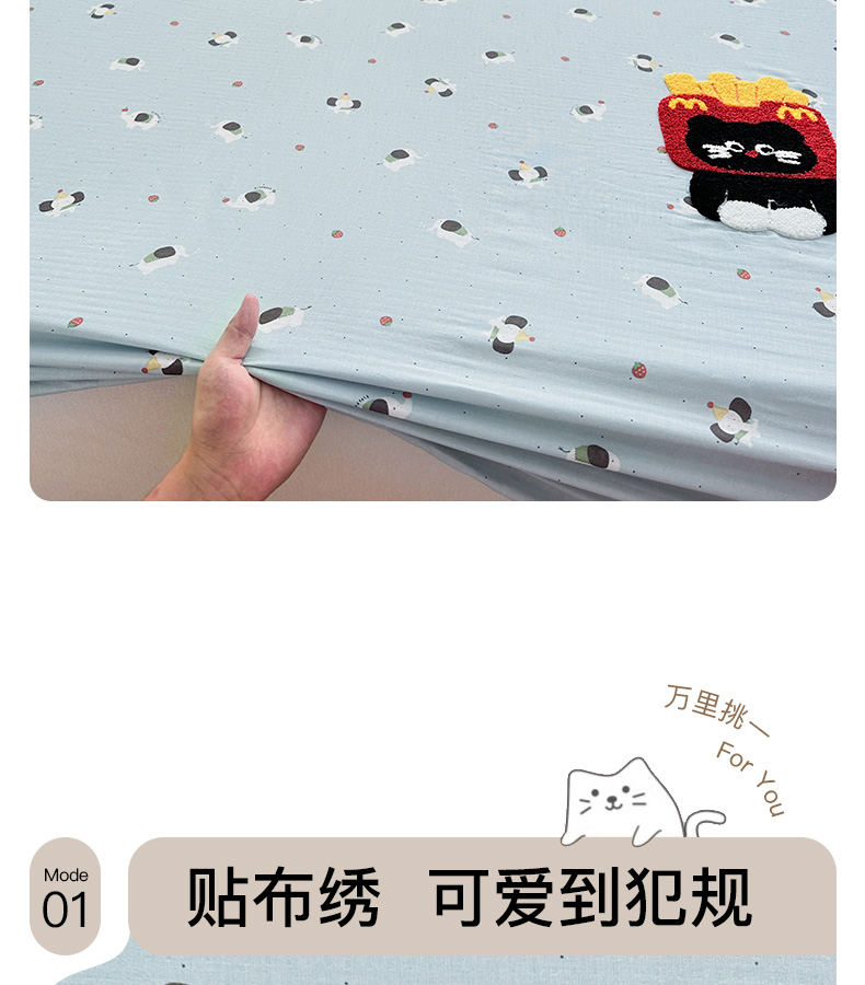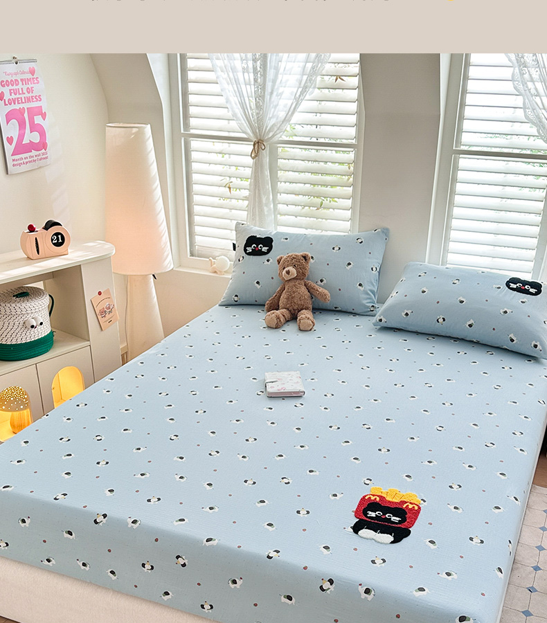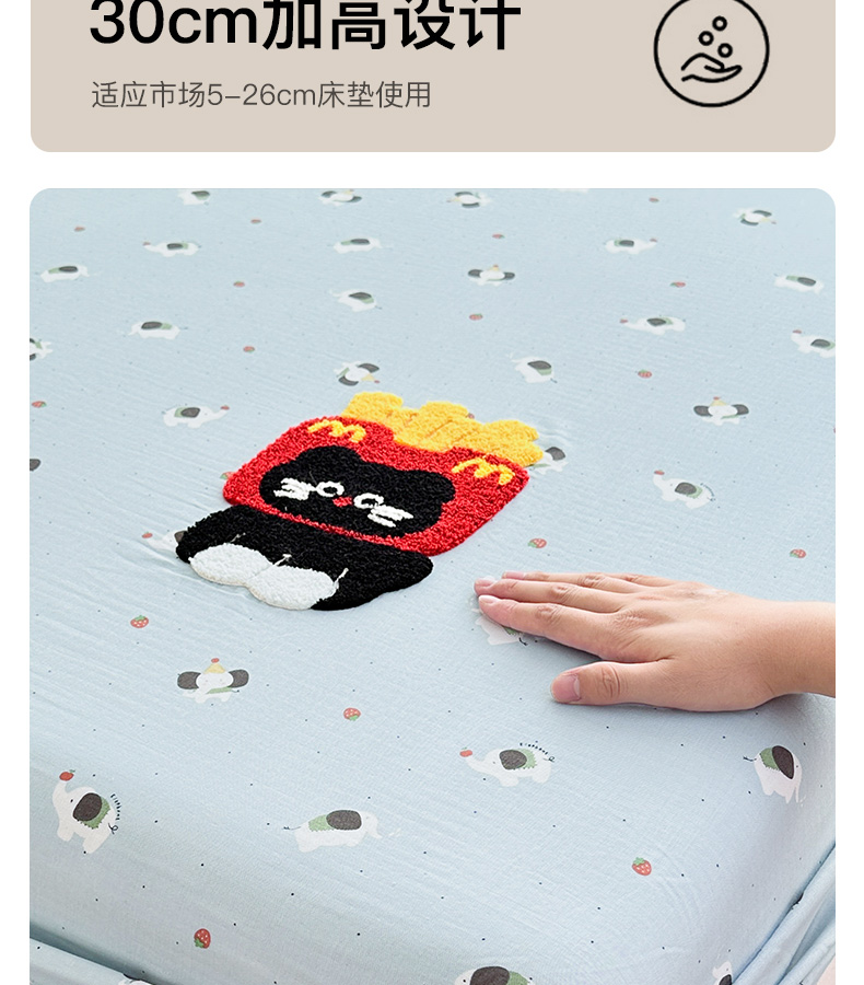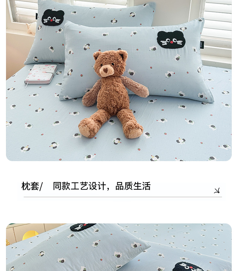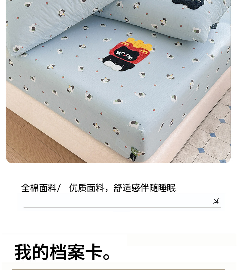 • 91家纺网 家纺一手货源 找家纺 卡姿家纺 2025秋冬全棉双层纱-床笠三件套 床笠-猫咪薯条