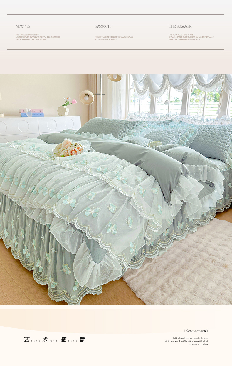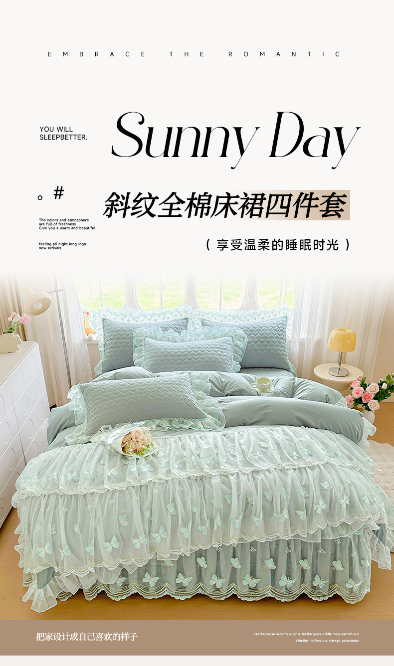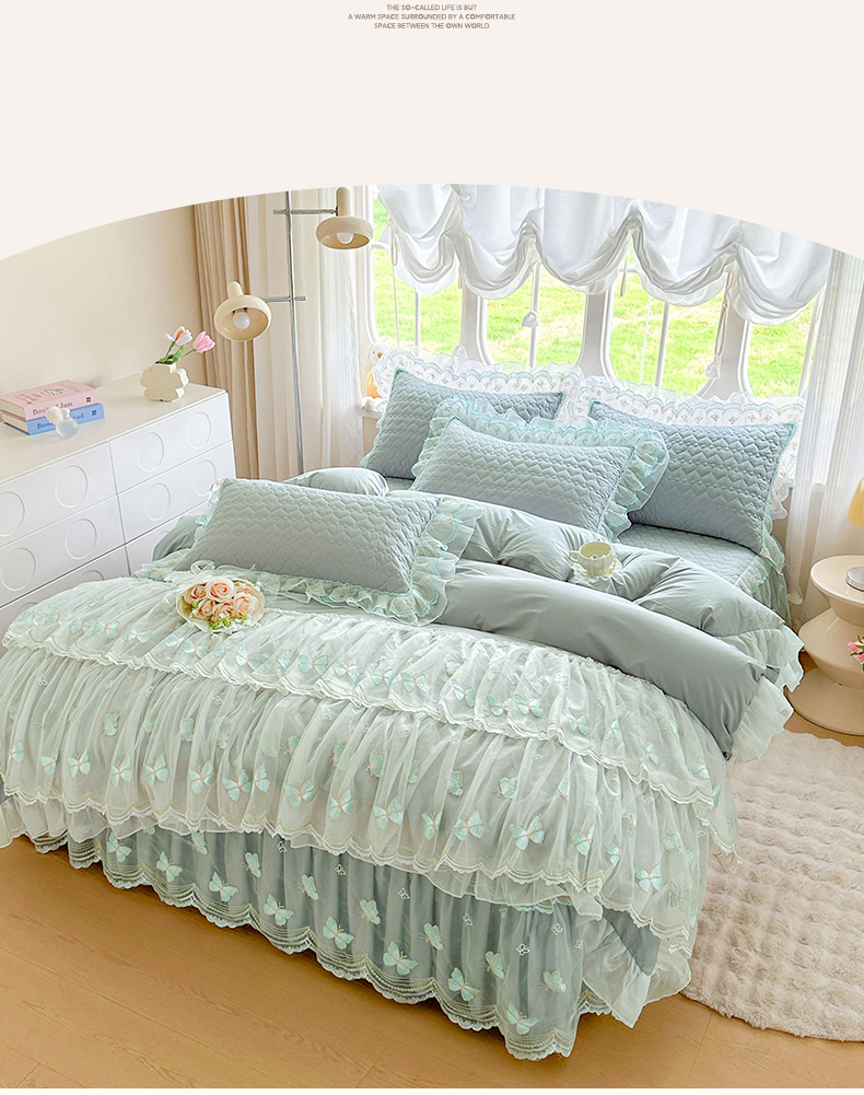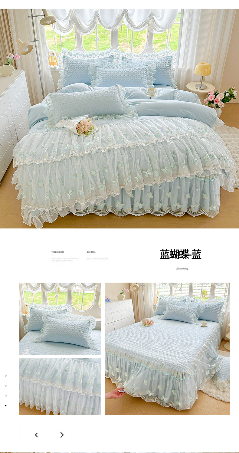 当前位置: 91家纺网 > 商品网购 > 床品套件 > 四件套 > 其它四件套 > 罗艺轩 2025新款全棉纯棉斜纹工艺床裙四件套 蓝蝴蝶-绿色
