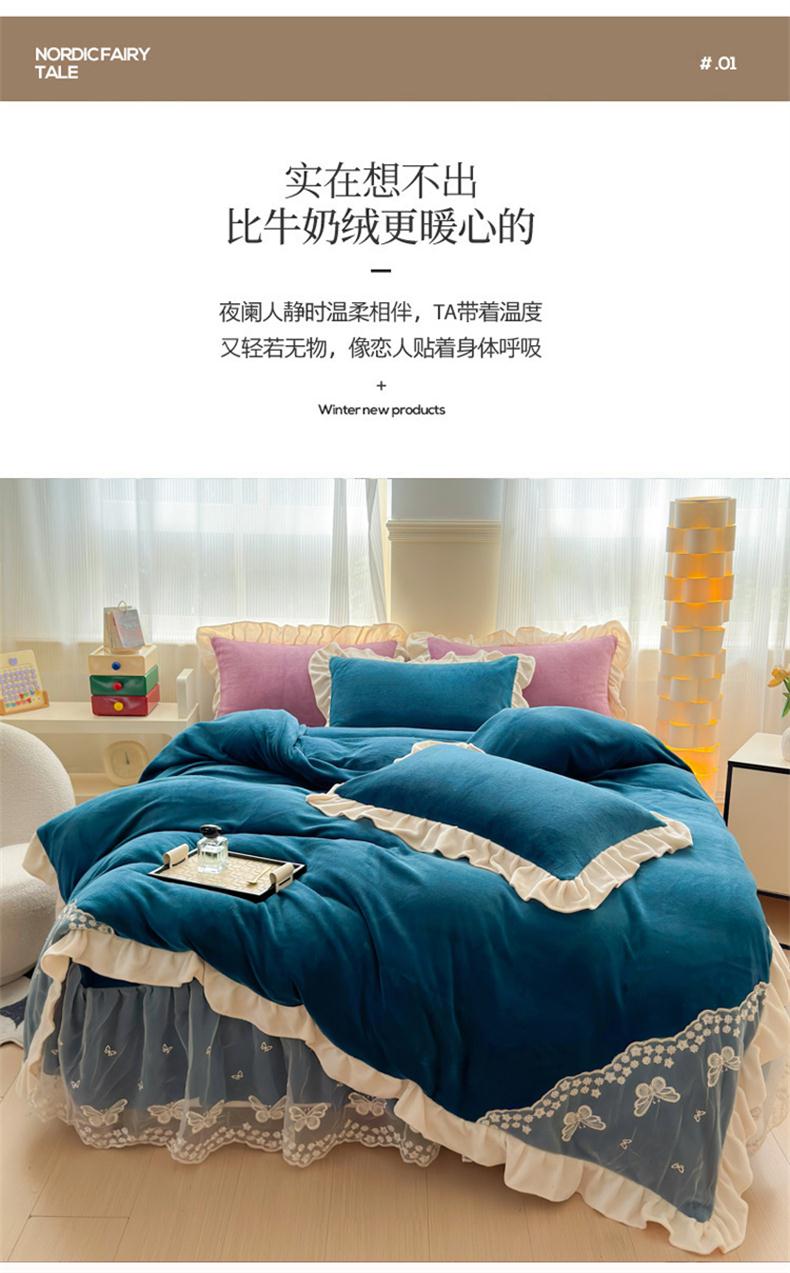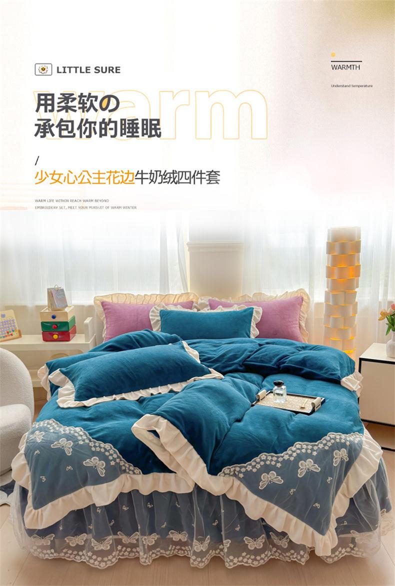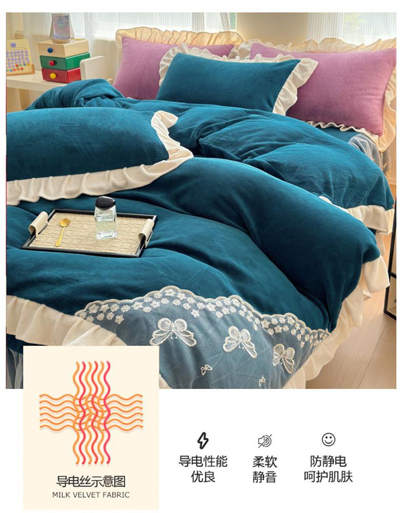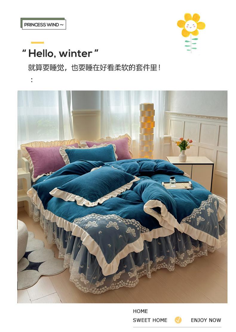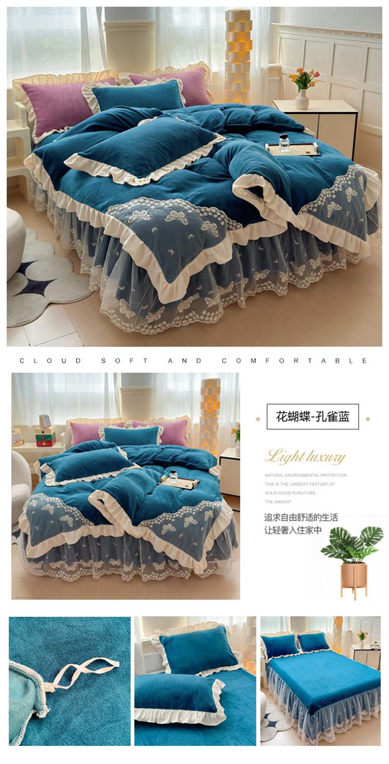 商品名称:睡美人 2025韩版蕾丝牛奶绒套件公主风床裙床单款四件套 花蝴蝶-孔雀蓝